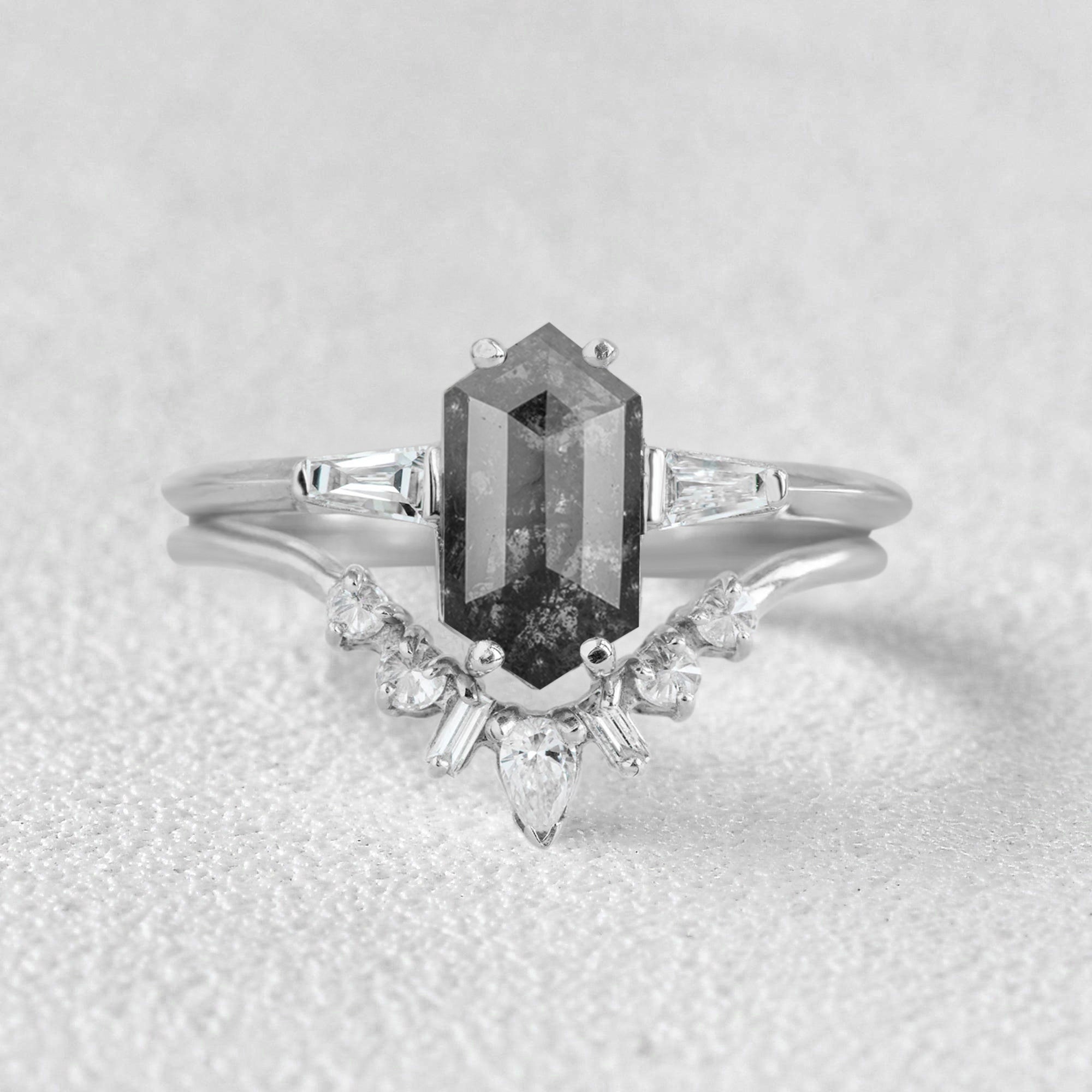 Long Hexagon Salt and Pepper Diamonds Three Stone Ring Set 2pcs