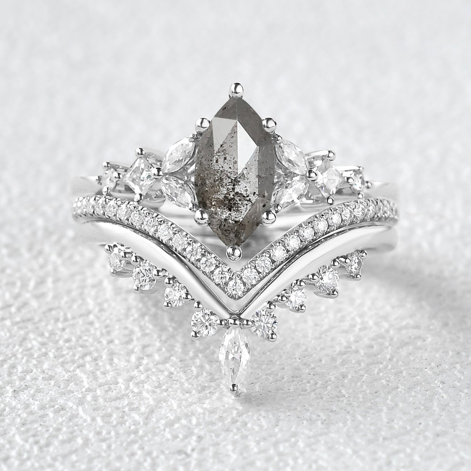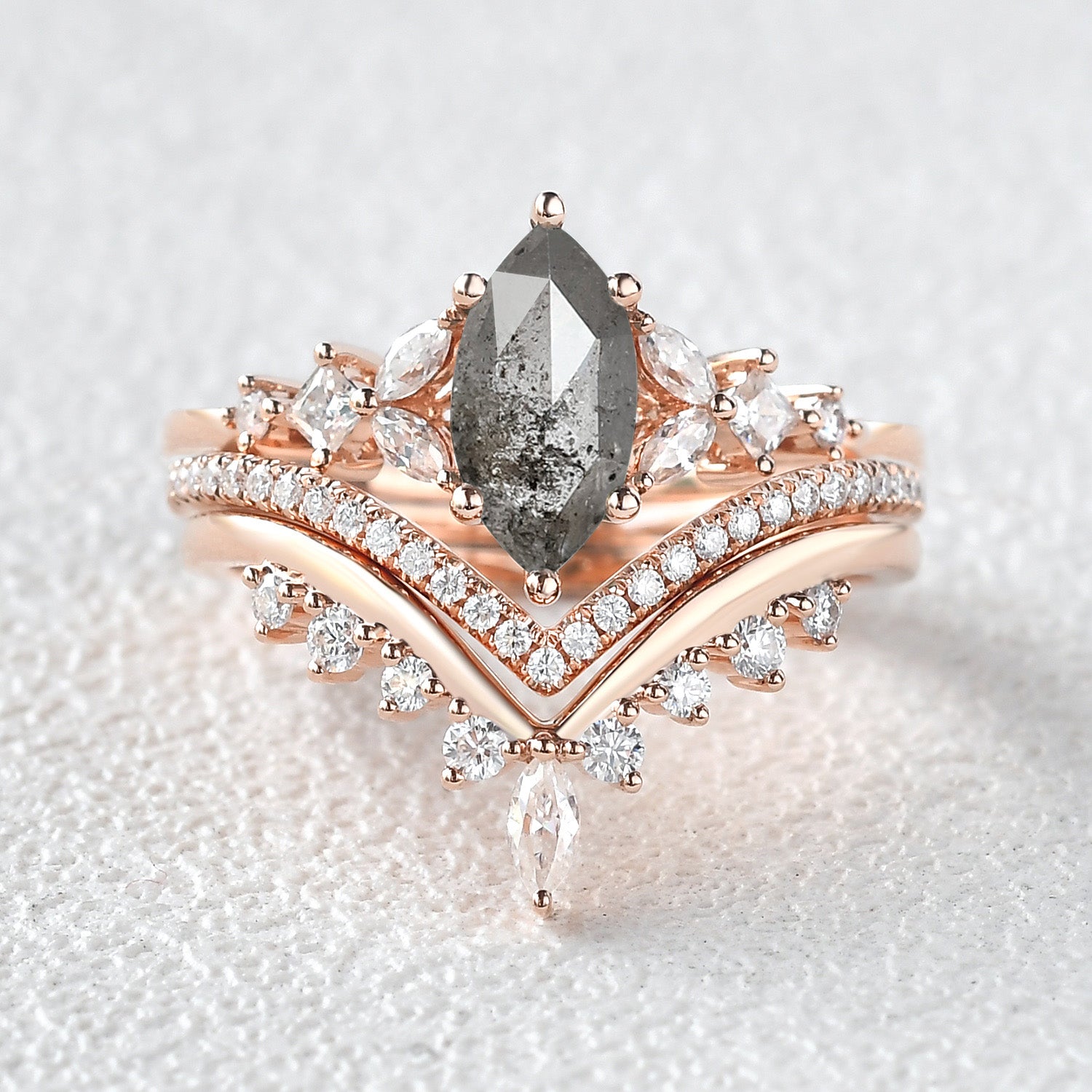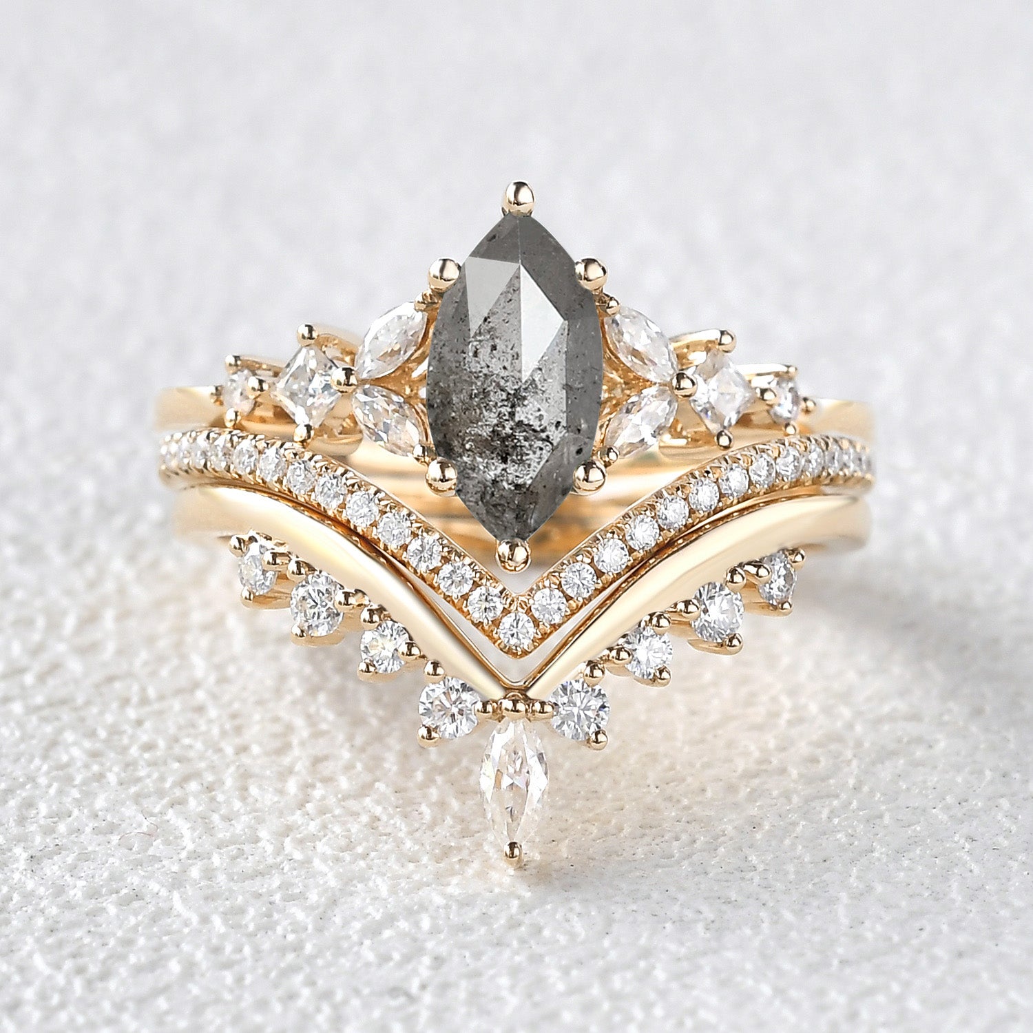 Marquise Salt and Pepper Diamond Engagement Ring Set 3pcs