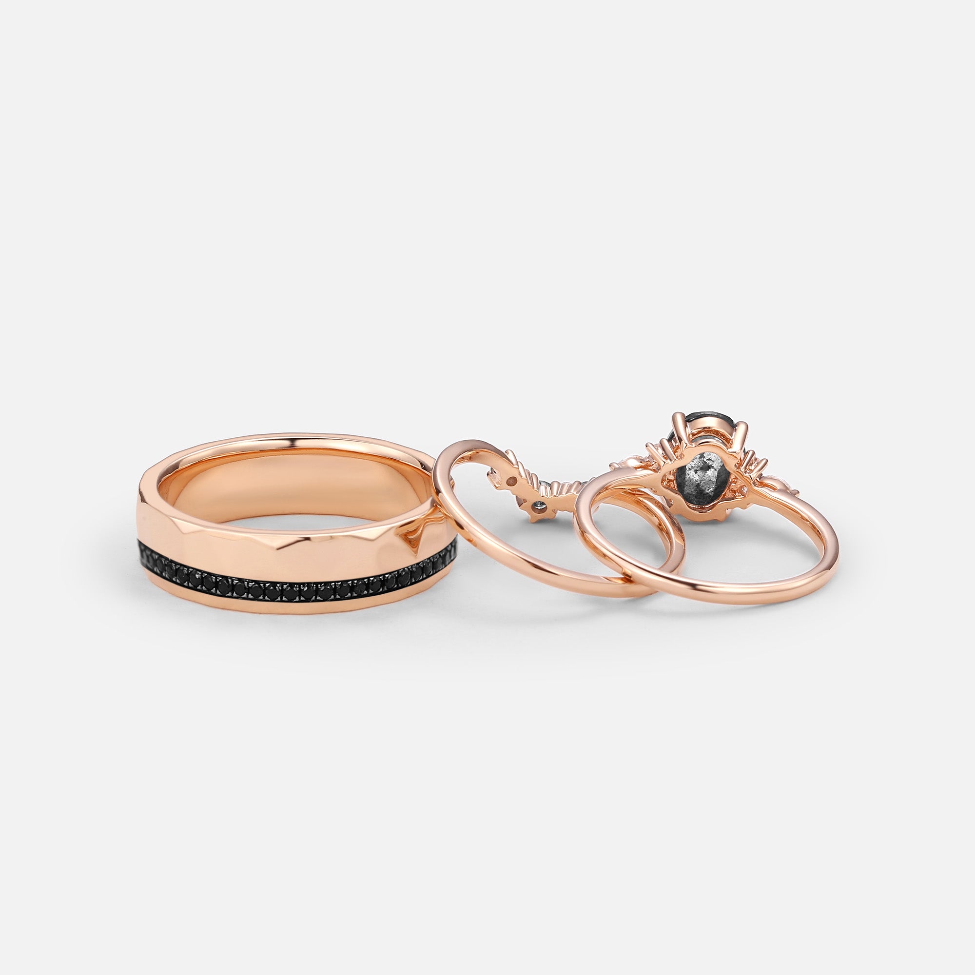 Oval Cut Salt and Pepper Diamonds Engagement Couple Ring Set 3pcs