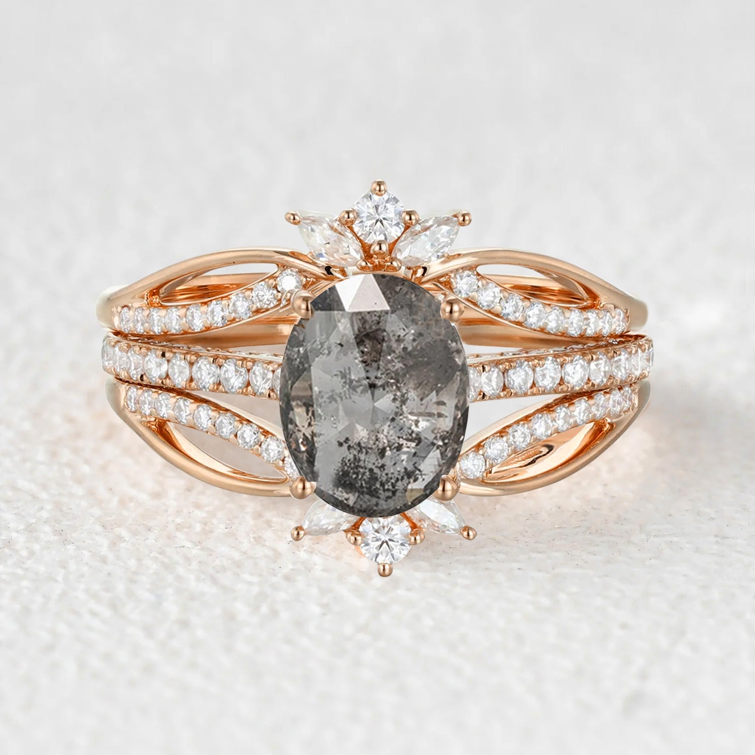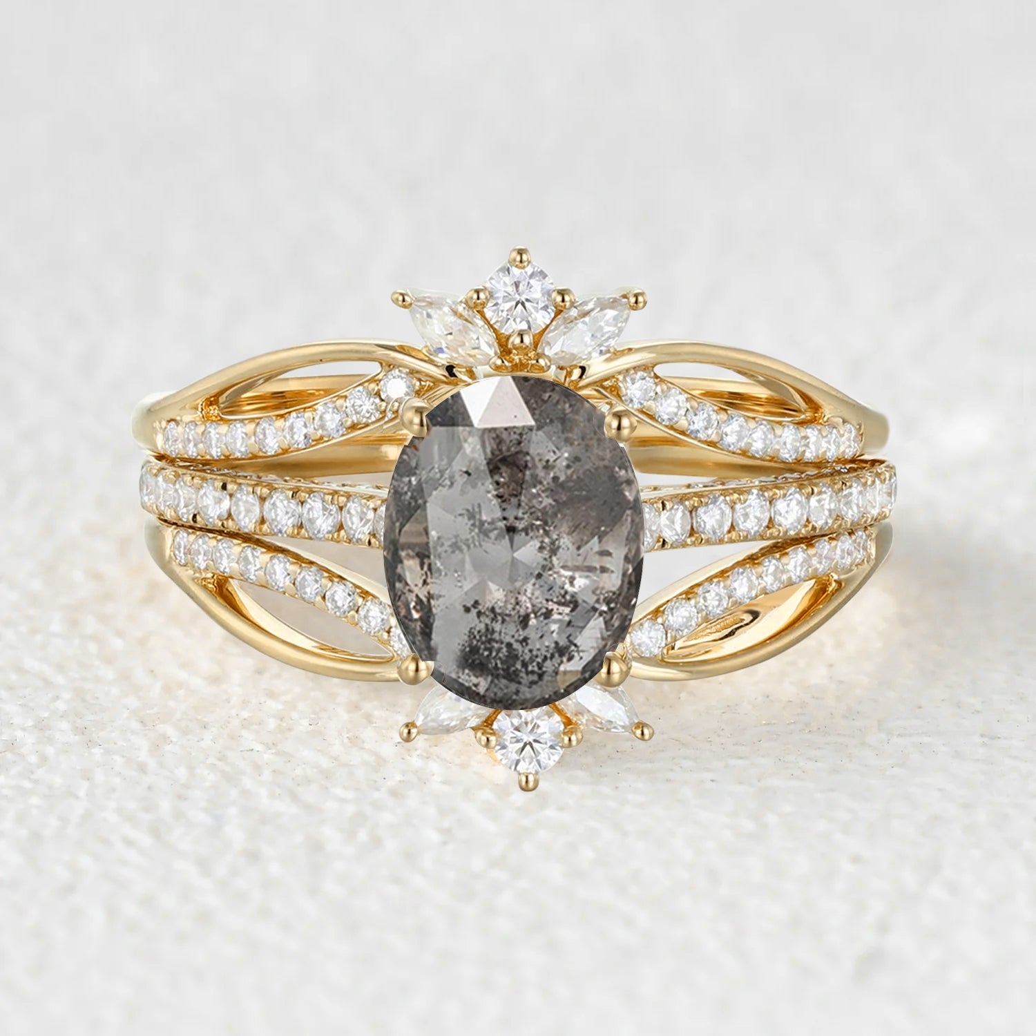 Oval Cut Salt and Pepper Diamonds Extravaganza Engagement Ring Sets 3pcs