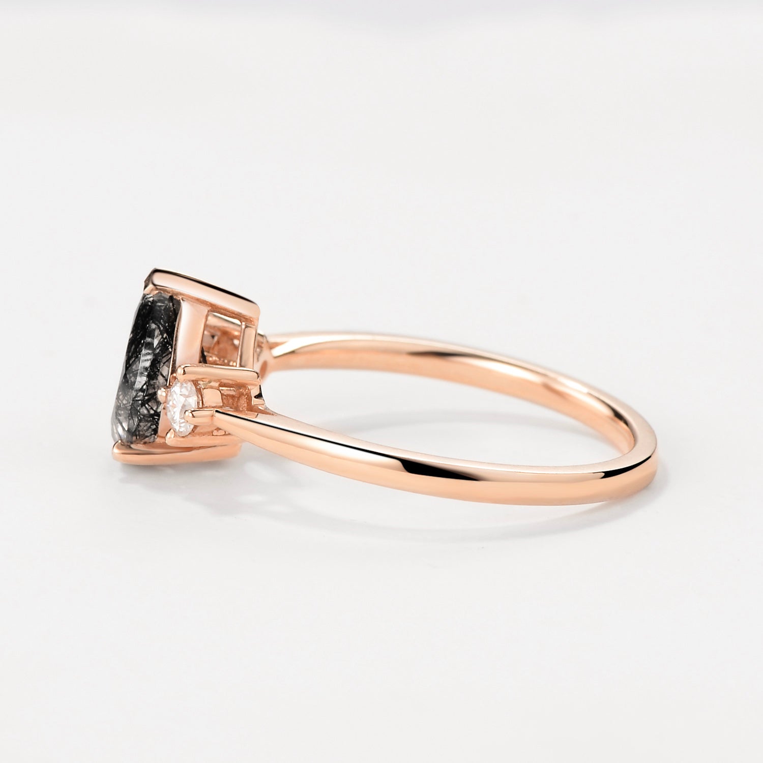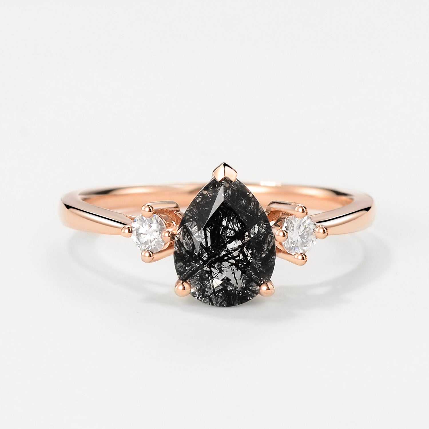 Felicegals Pear Shaped Black Quartz Rutilated & Moissanite Rose Gold Three Stone Vintage Ring Marquise Moissanite Ring Custom Curved Band Ring