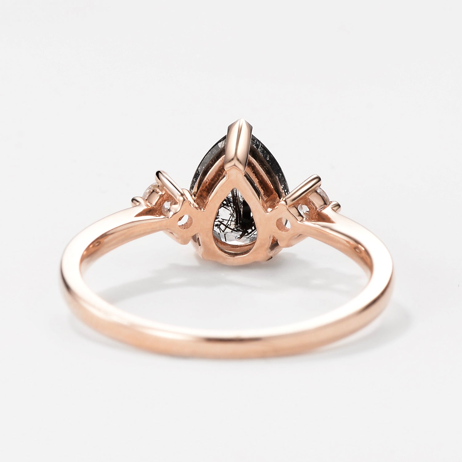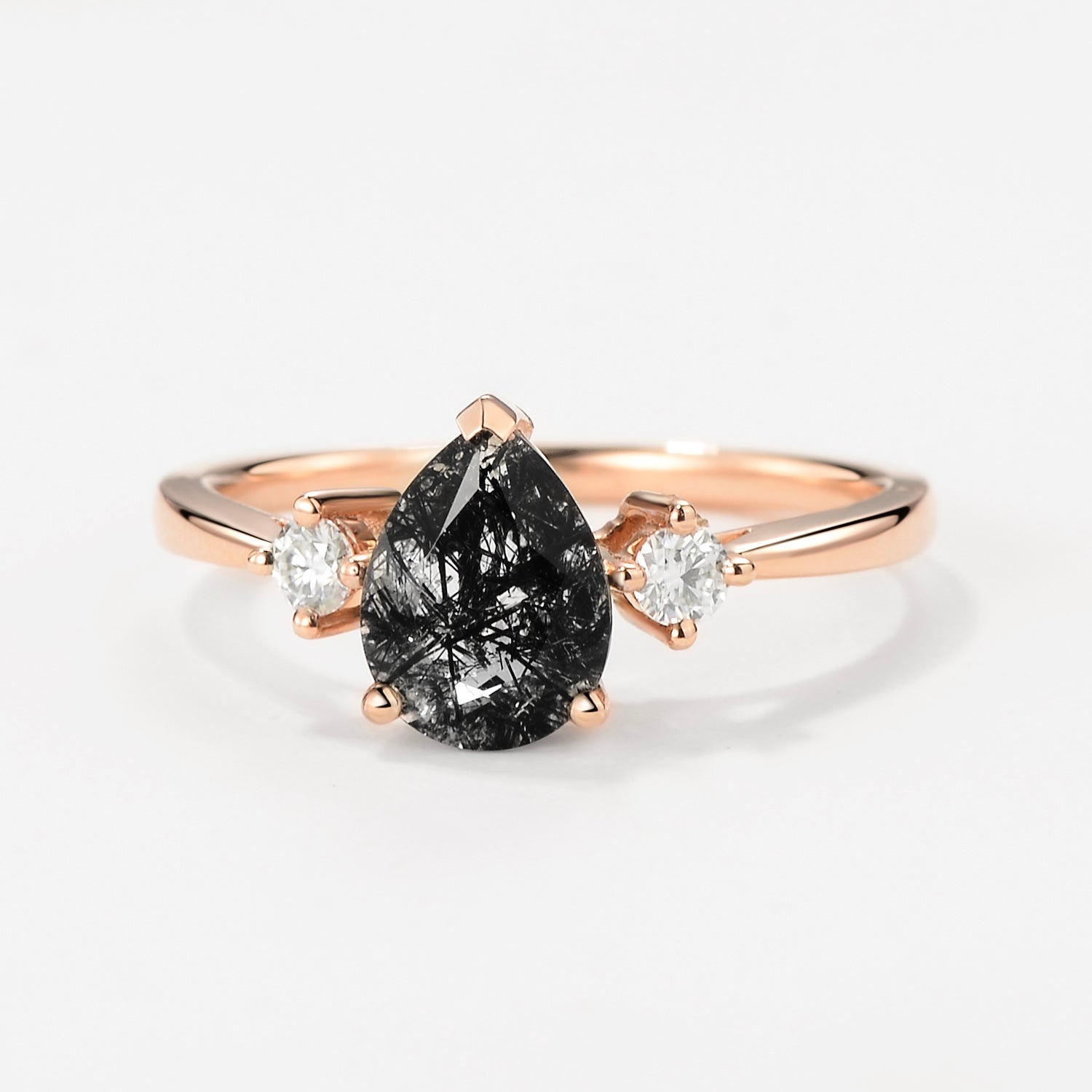 Pear Black Rutilated Quartz Three Stone Vintage Ring