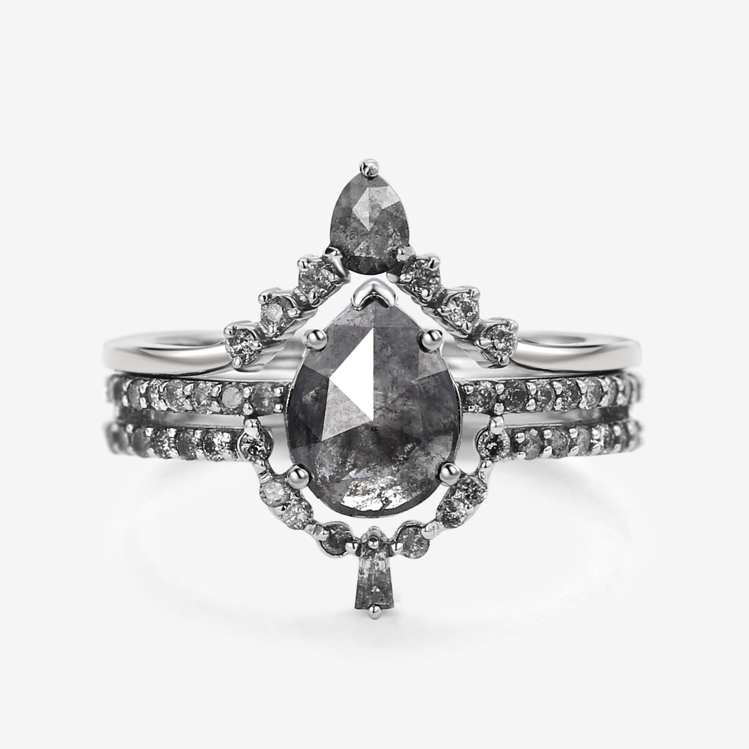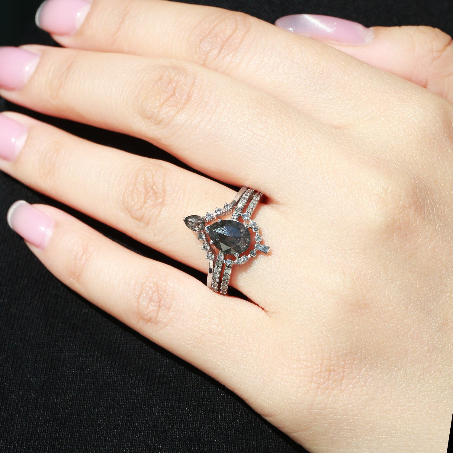 Pear Cut Salt and Pepper Diamonds Unique Engagement Ring Sets 3pcs
