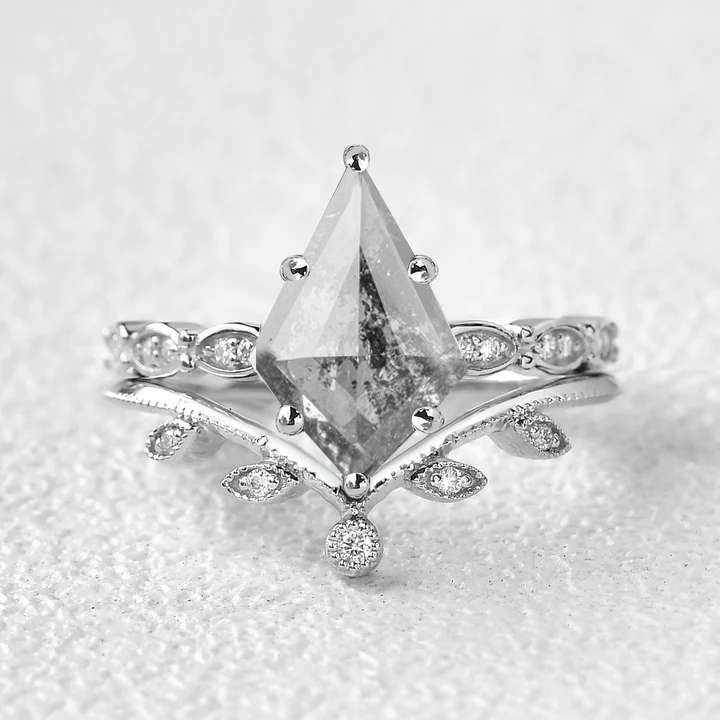Salt and Pepper Diamonds Vintage Engagement Ring Set 2pcs Crown Stackable Ring Bridal Ring Set Kite Cut Diamond Engagement Ring Handmade Ring