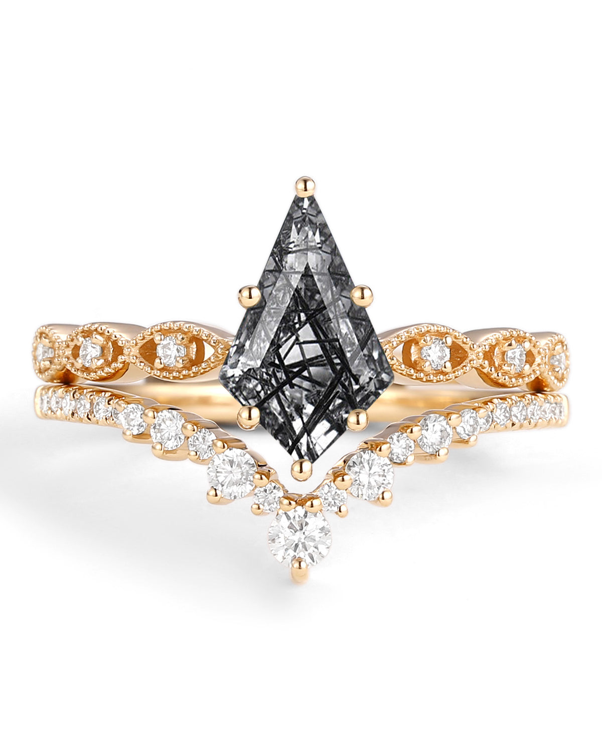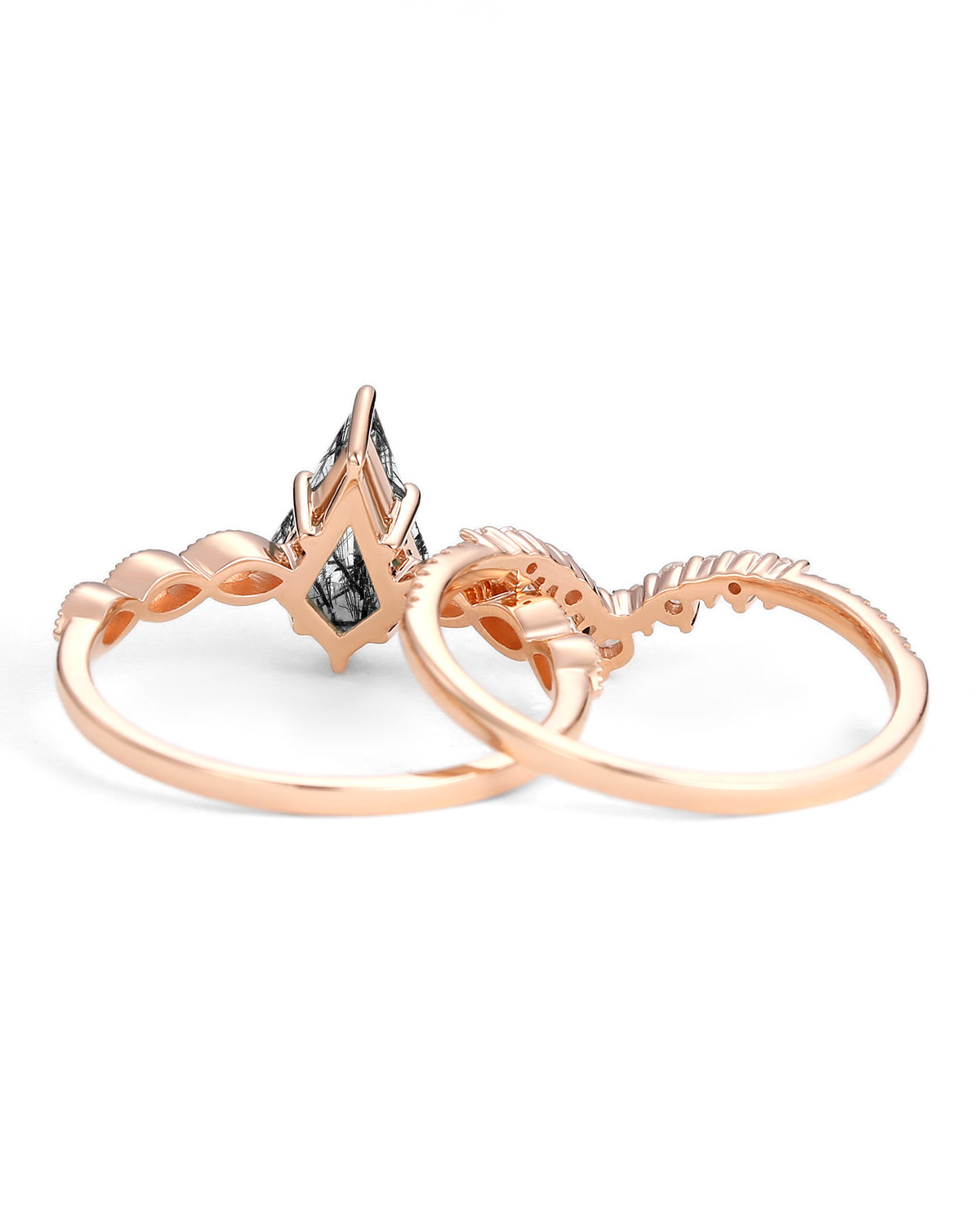 What makes this rutilated quartz ring unforgettable? The rutile “threads” within the black quartz catch light softly, creating a luminous effect that feels both ethereal and edgy—perfect for couples who want an engagement ring that mirrors their one-of-a-kind bond. It pairs seamlessly with diverse band metals: sleek black gold amplifies its dark charm, warm yellow gold adds contrast, and polished white gold lets the rutile’s sparkle take center stage.