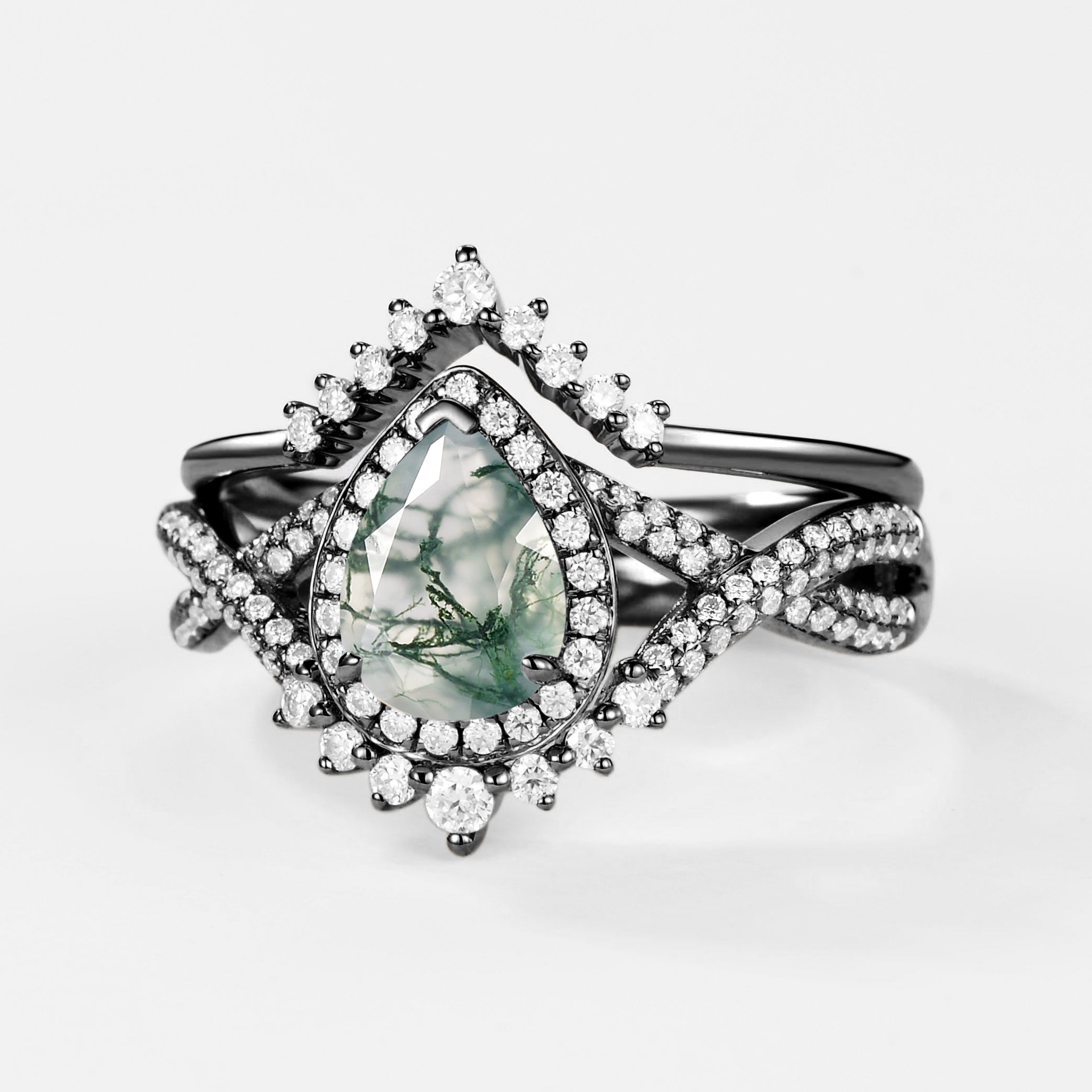 Black Gold Pear Moss Agate Halo Infinity Ring Set 2pcs - Valentina