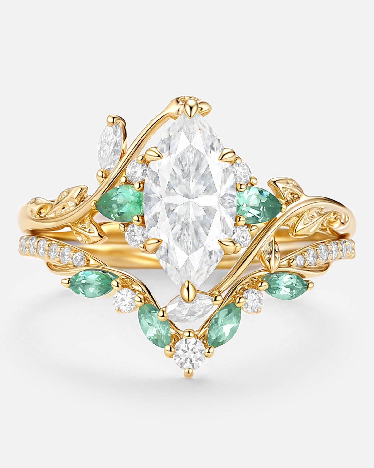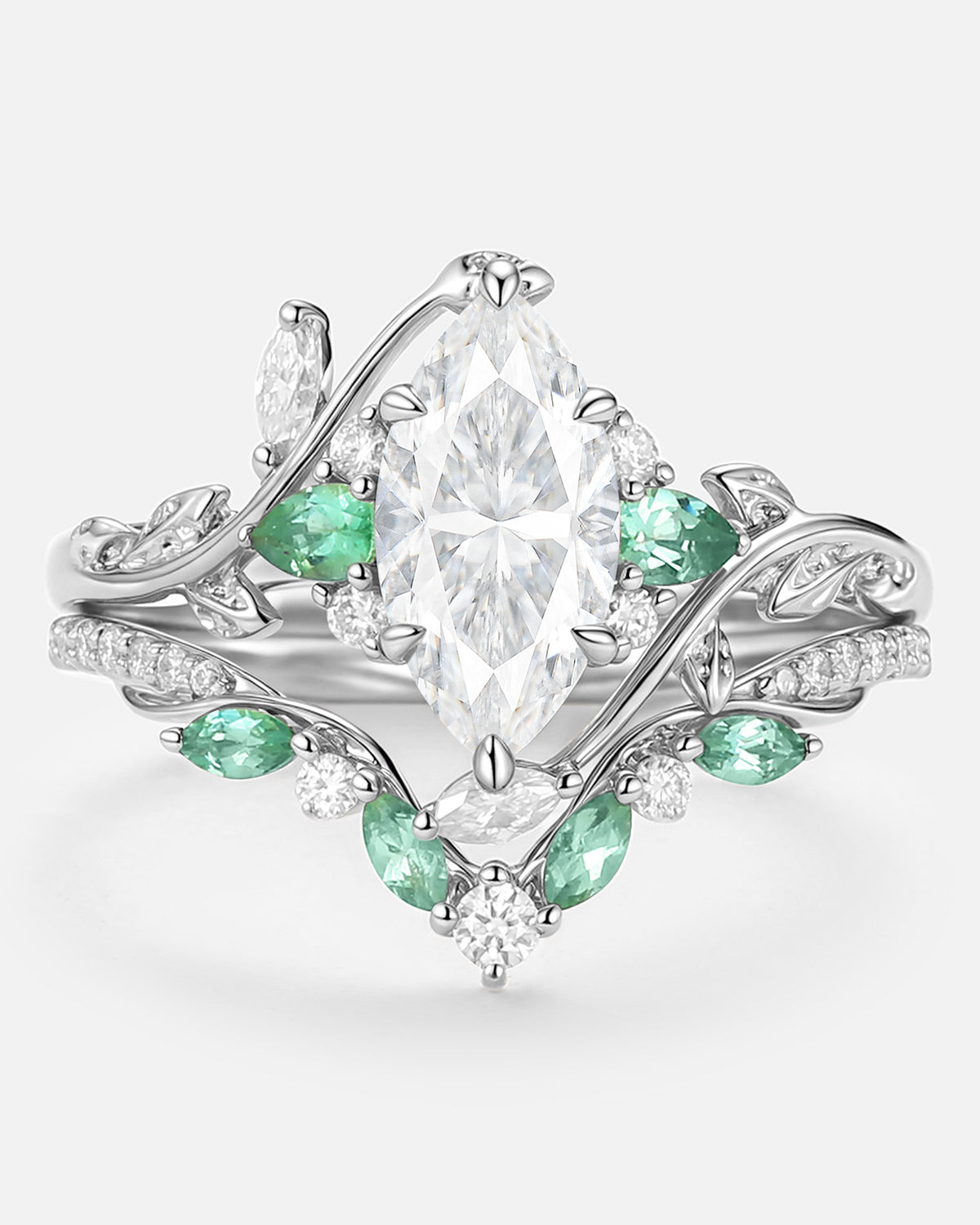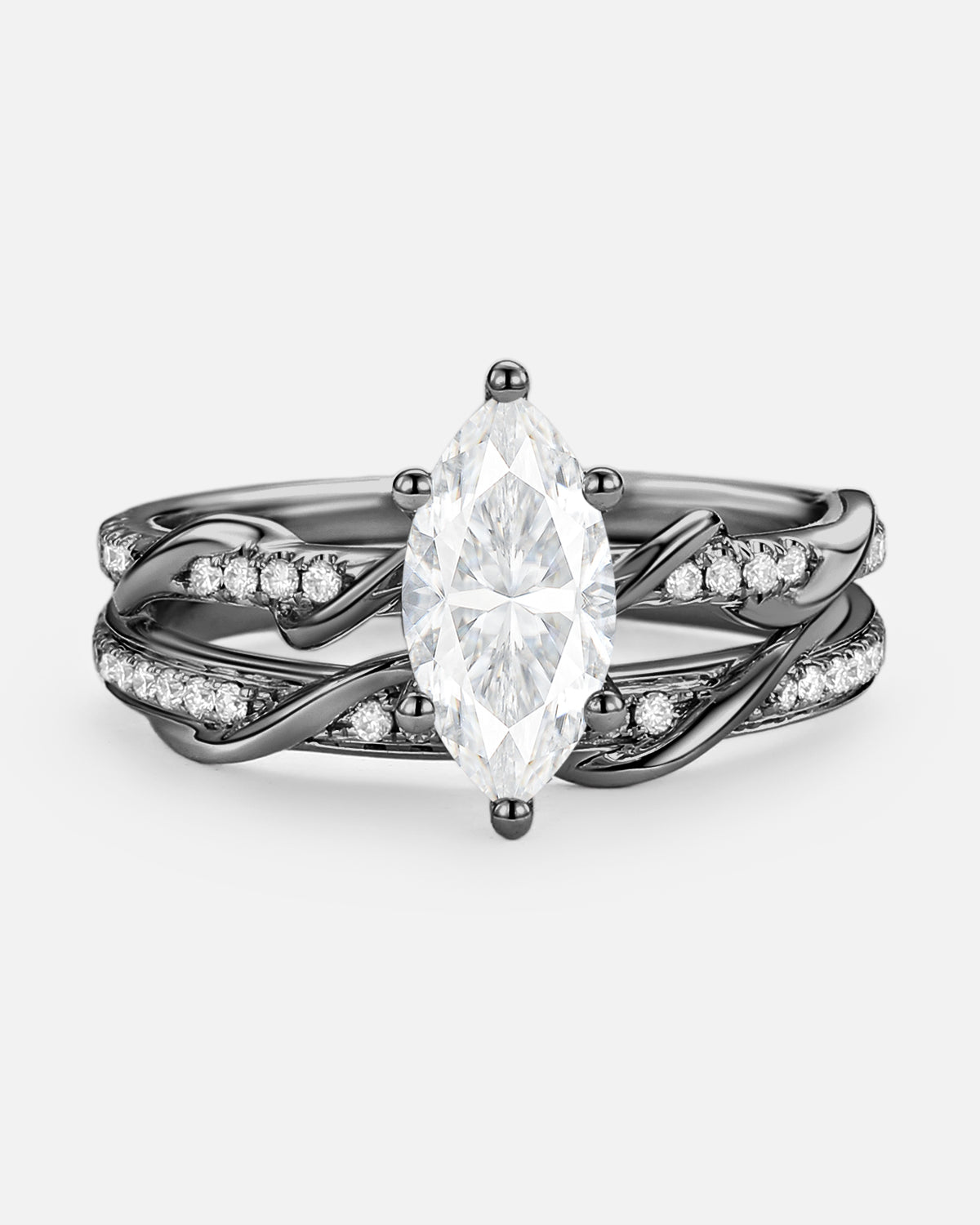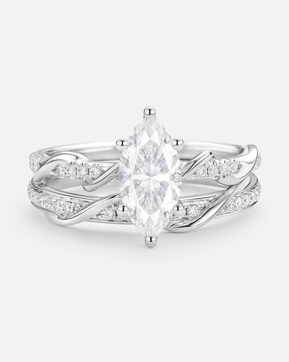 Marquise Cut is a unique and beautiful gemstone rings cut shape, famous for its distinctive marquise and pointed shape. This moissanite marquise bridal set allows the stone to look more graceful and noble, while also enabling the size and weight of the stone to be more significant.