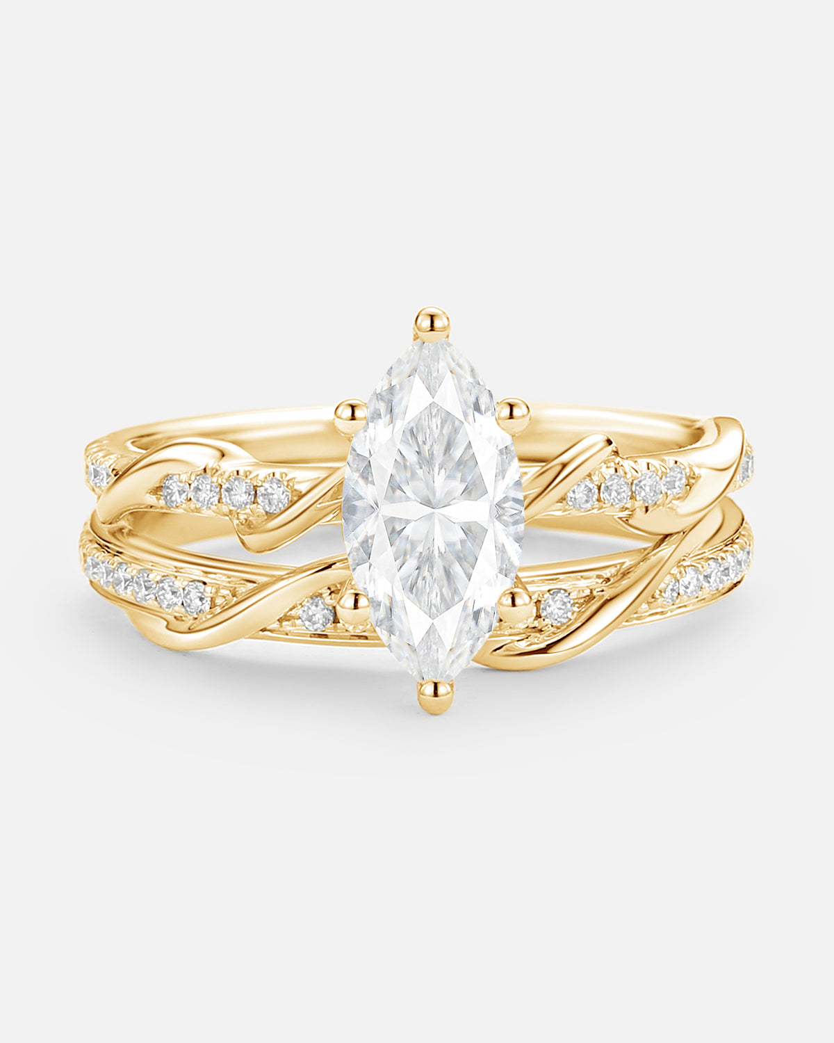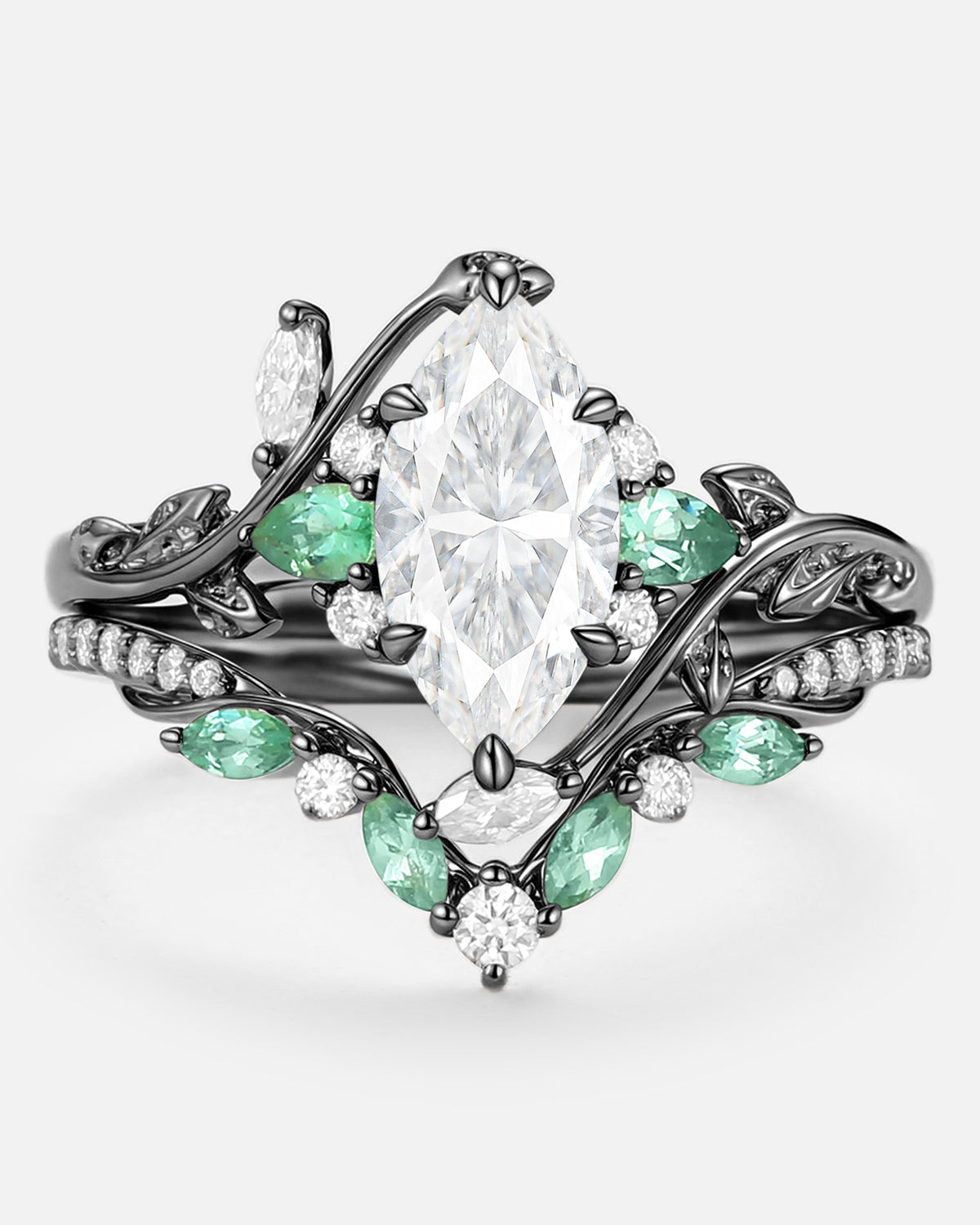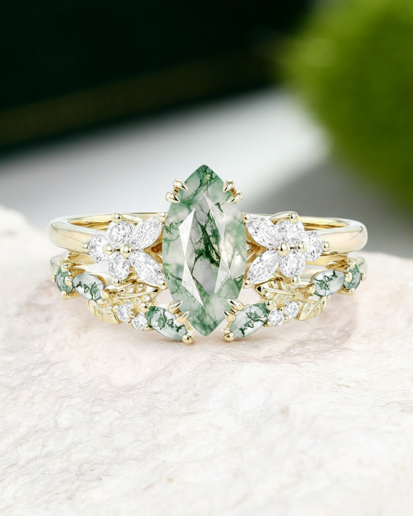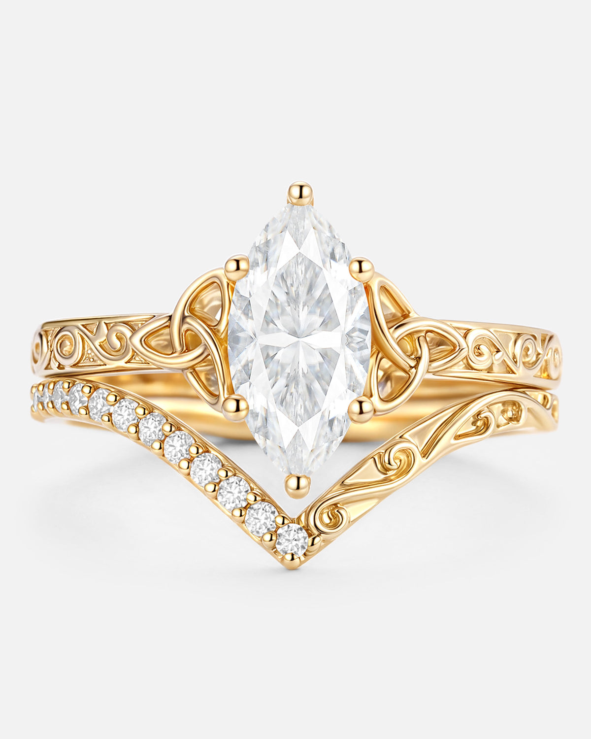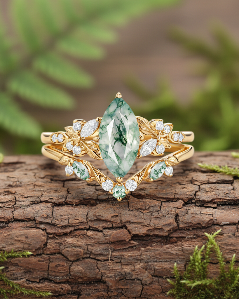 Marquise Cut is a unique and beautiful gemstone rings cut shape, famous for its distinctive marquise and pointed shape. This moissanite marquise bridal set allows the stone to look more graceful and noble, while also enabling the size and weight of the stone to be more significant.