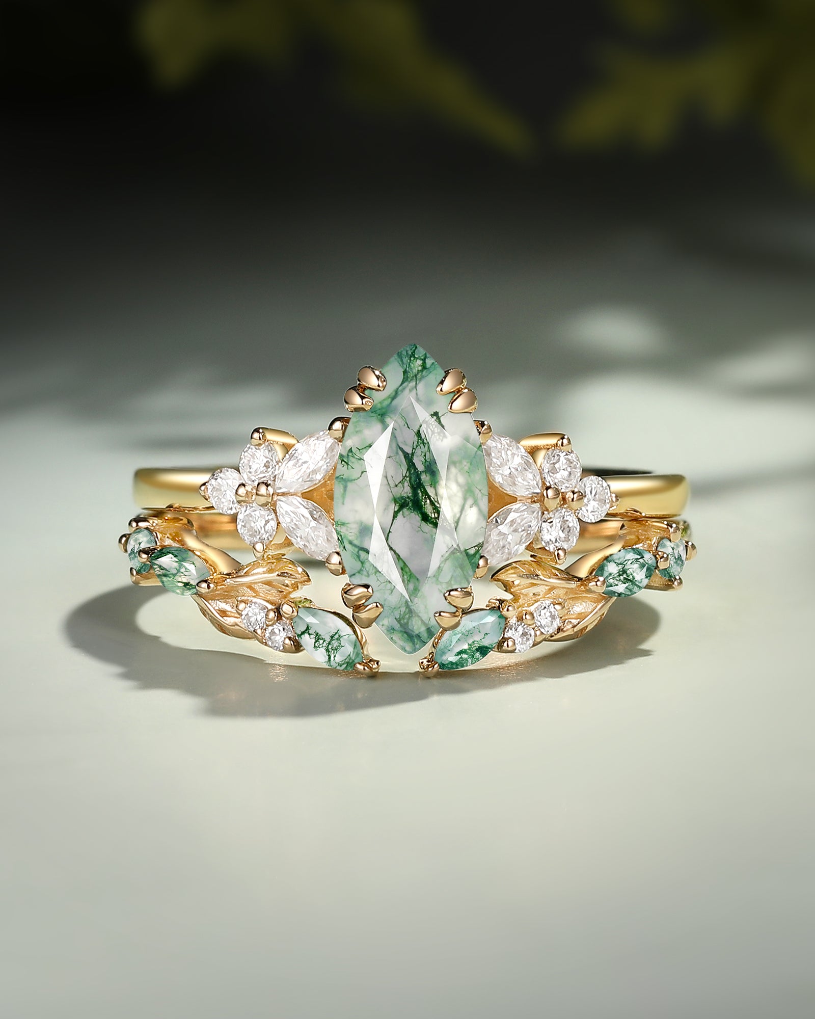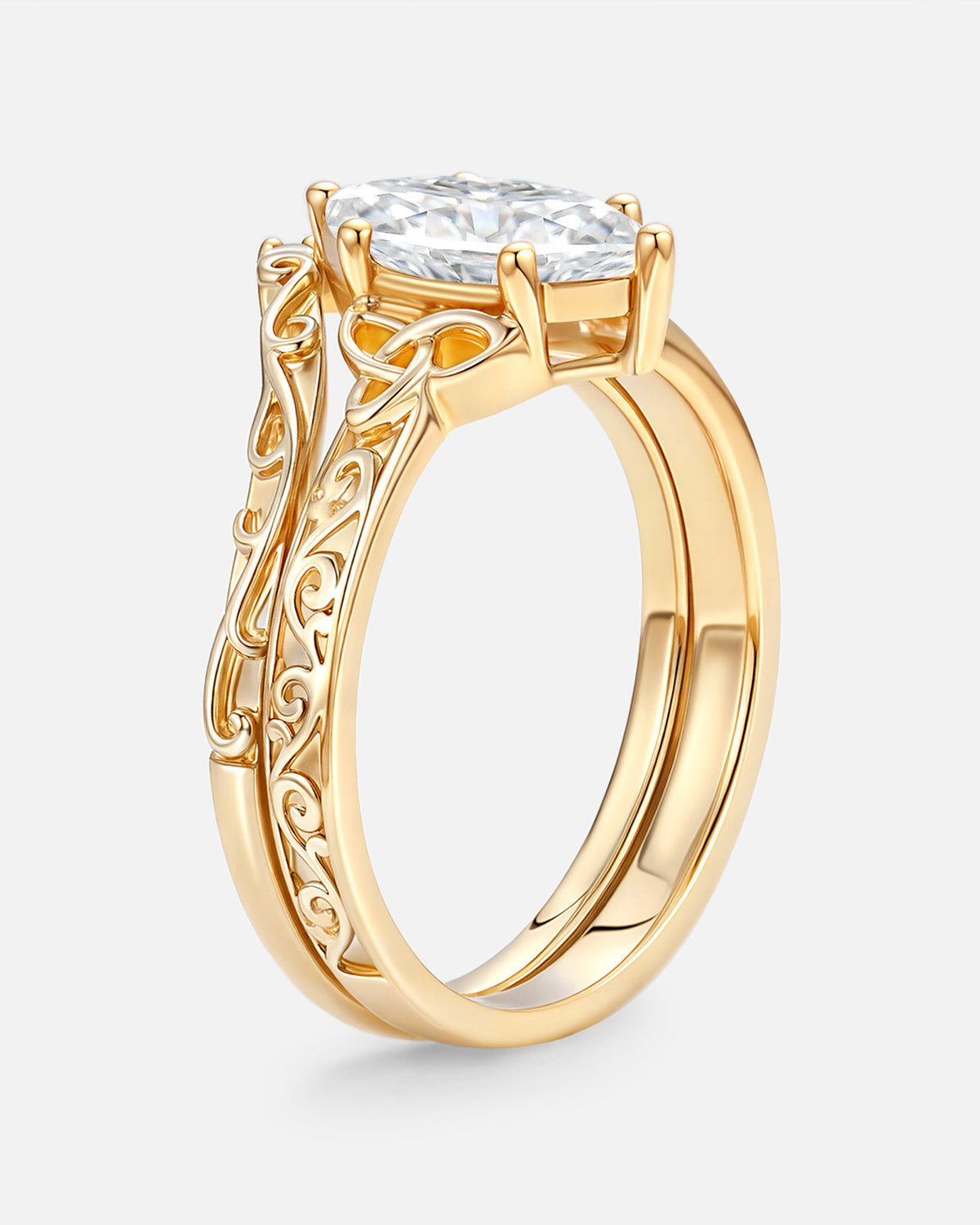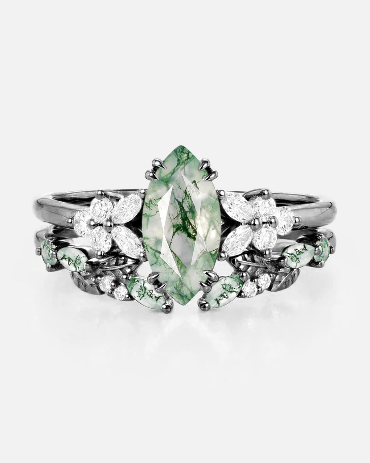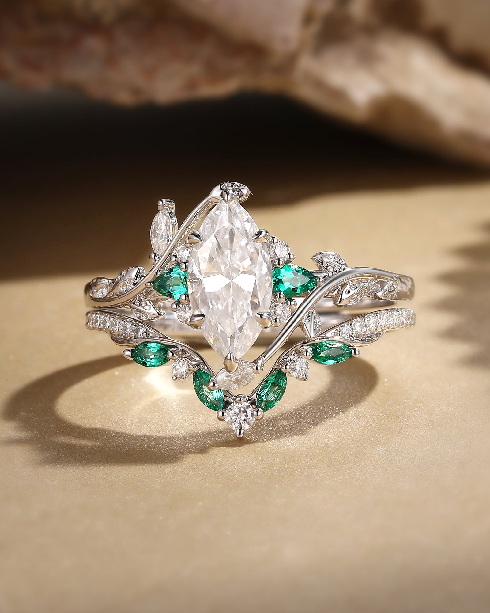 Marquise Cut is a unique and beautiful gemstone rings cut shape, famous for its distinctive marquise and pointed shape. This moissanite marquise bridal set allows the stone to look more graceful and noble, while also enabling the size and weight of the stone to be more significant.