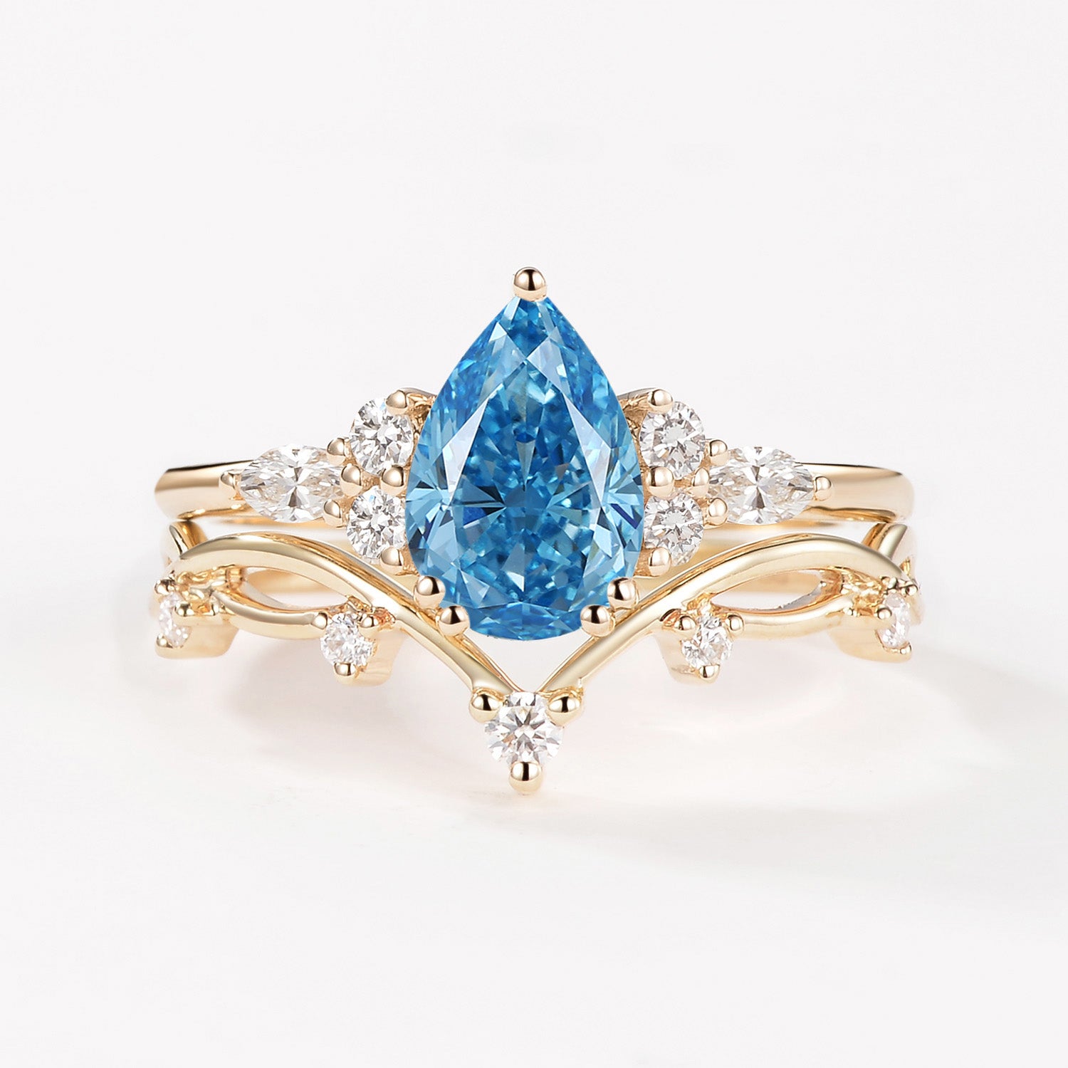1.0ct Pear Blue Lab Grown Diamond Leafy Ring Set 2pcs