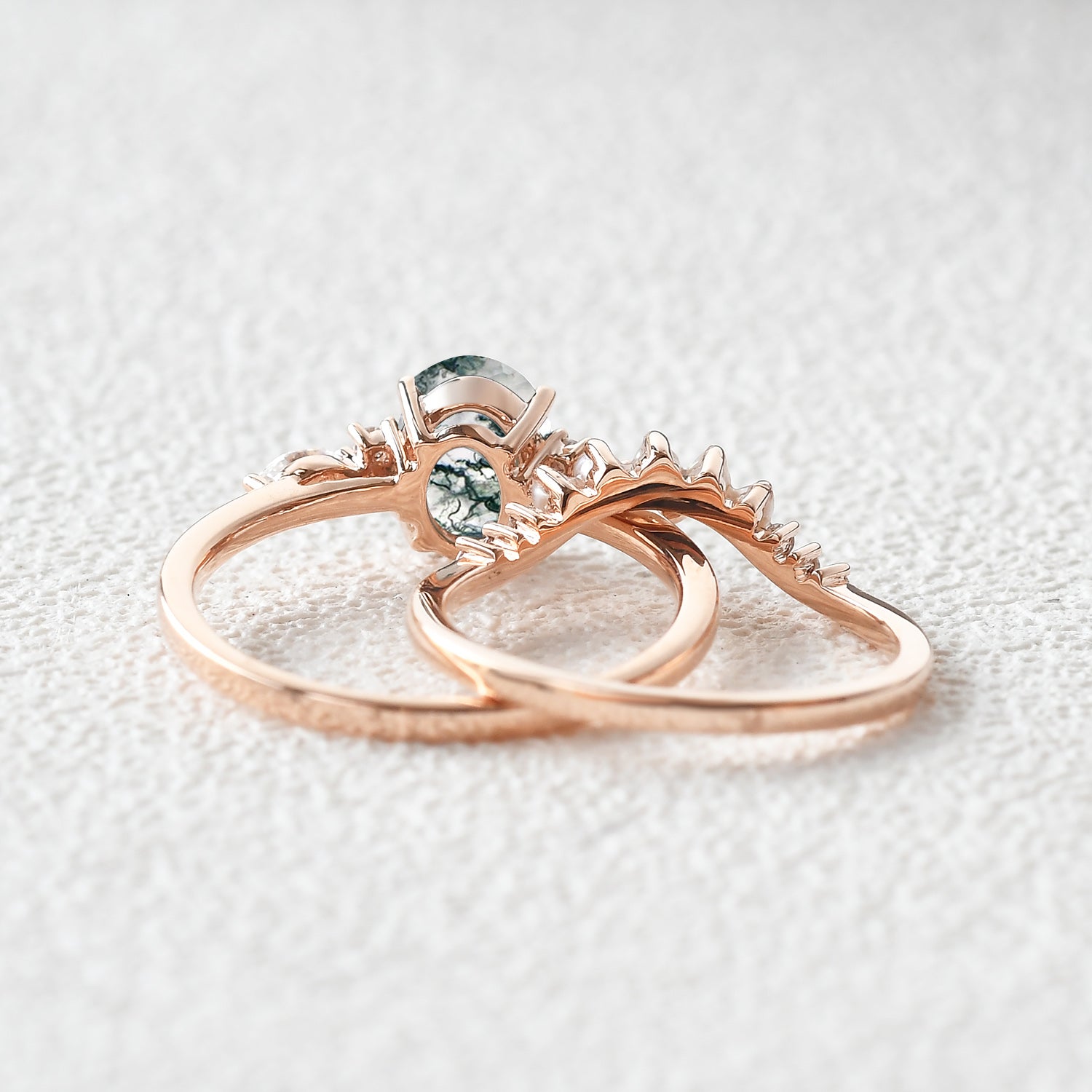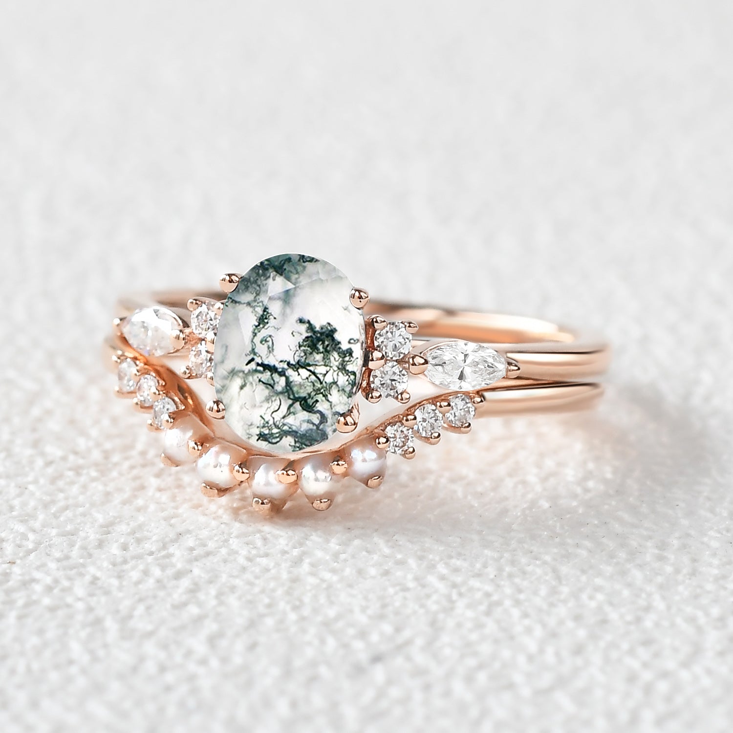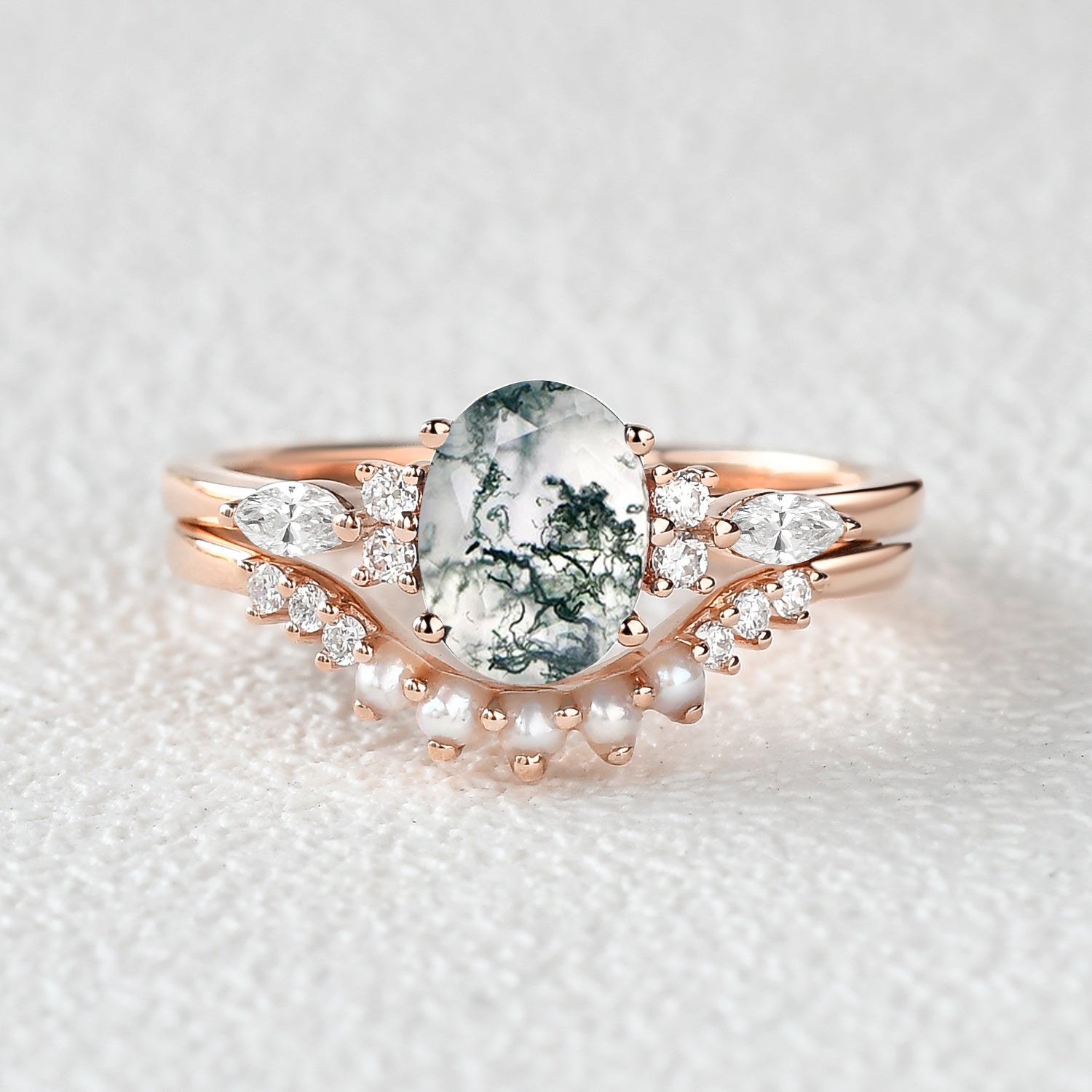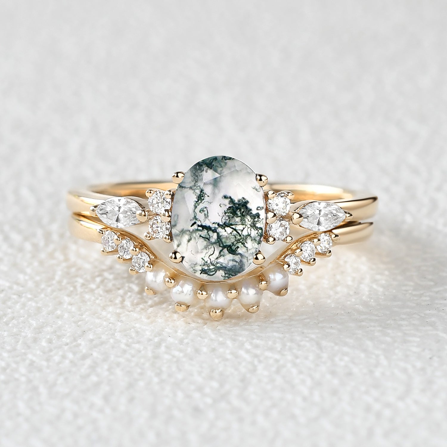 1.5ct Oval Cut Moss Agate & Pearl Engagement Ring Set 2pcs