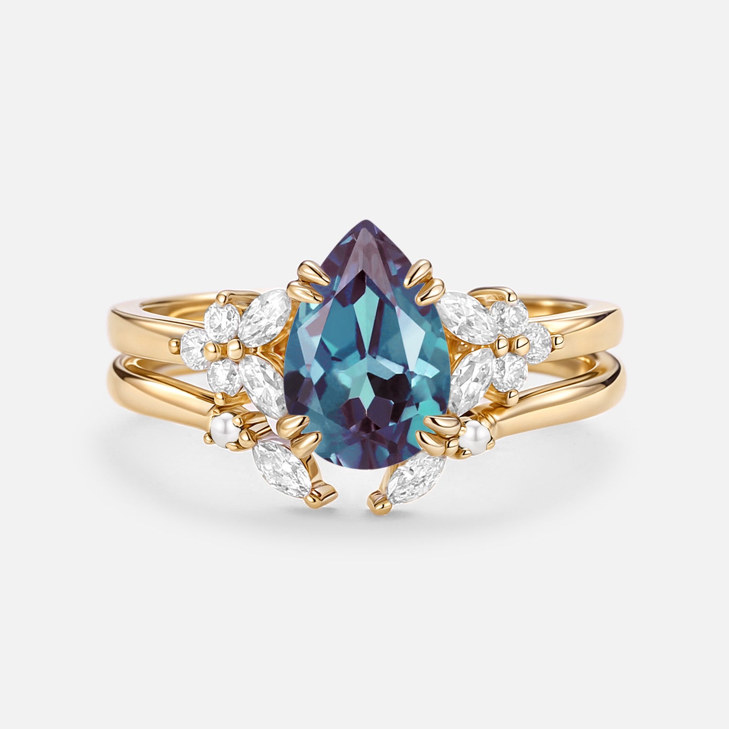 Cluster Pear Shaped Lab Alexandrite Chevron Gold Ring Set 2pcs - Anya