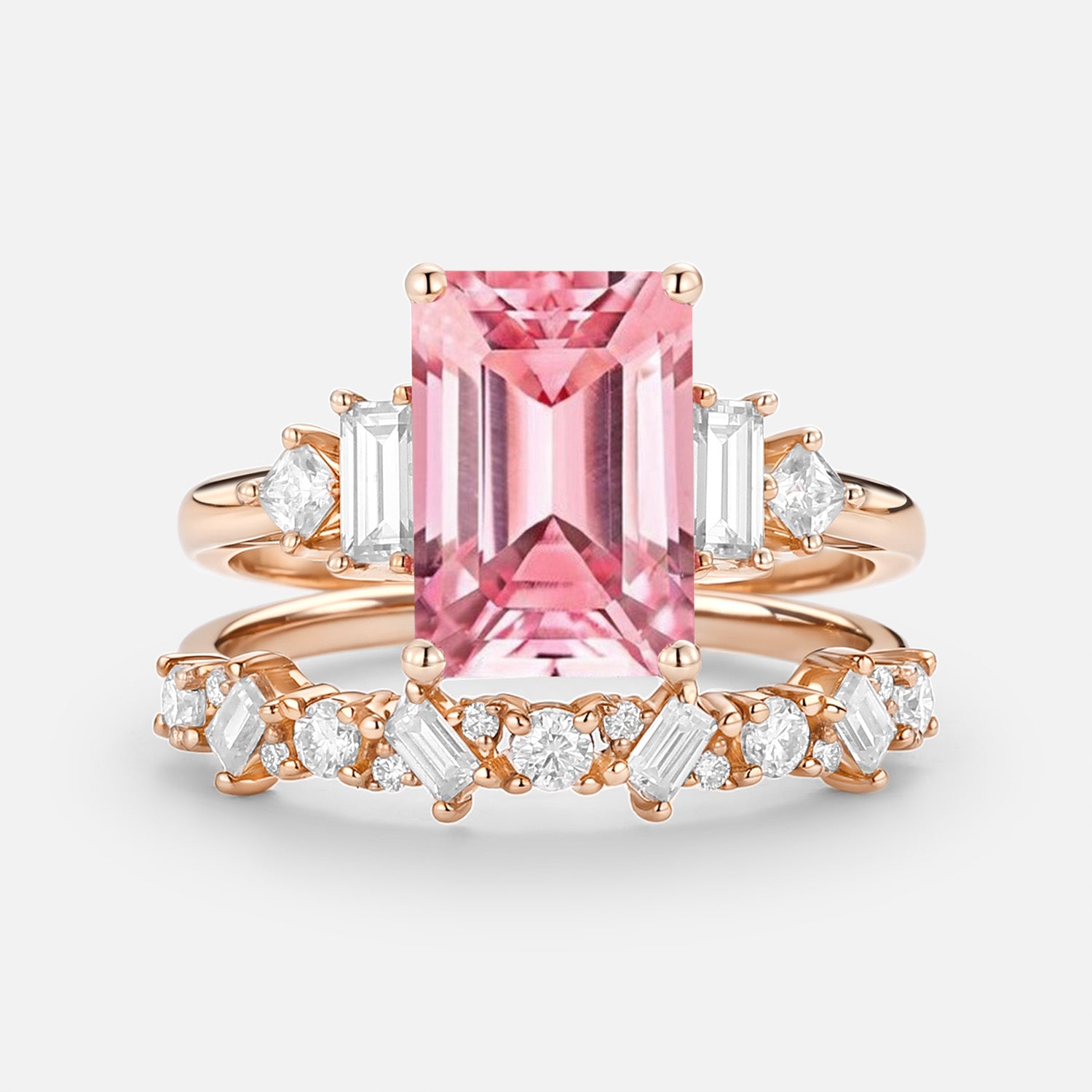 Emerald Cut Cluster Lab Pink Sapphire Yellow Gold Ring Set 2pcs - Peau