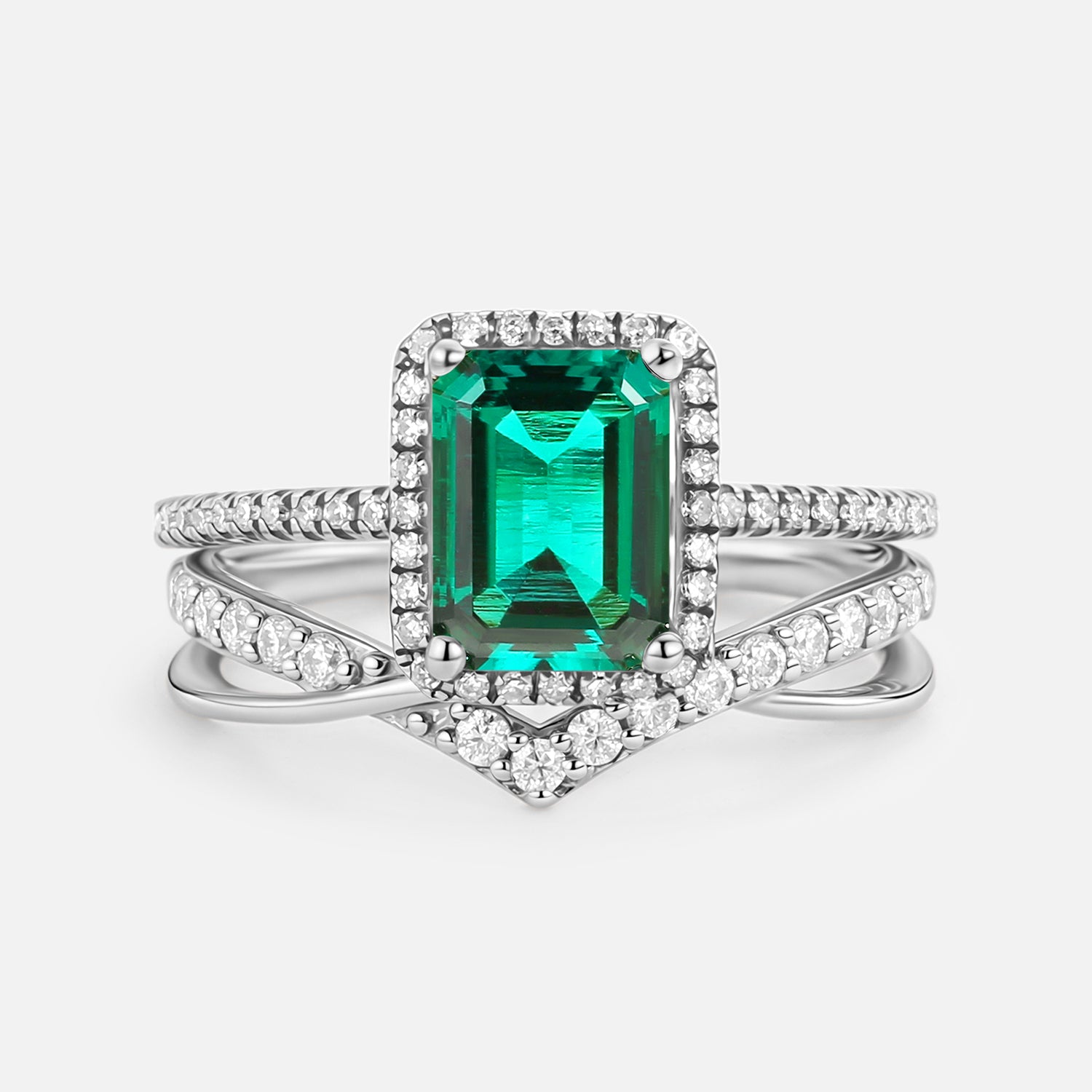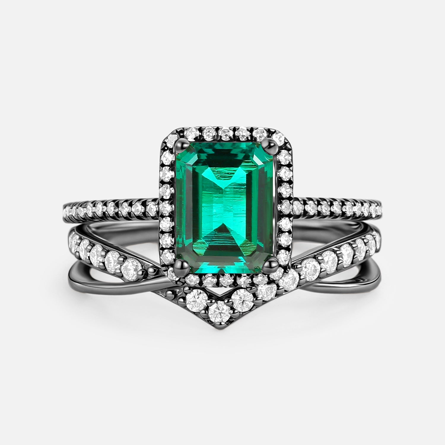 Emerald Cut Emerald & Moissanite Yellow Gold Ring Set