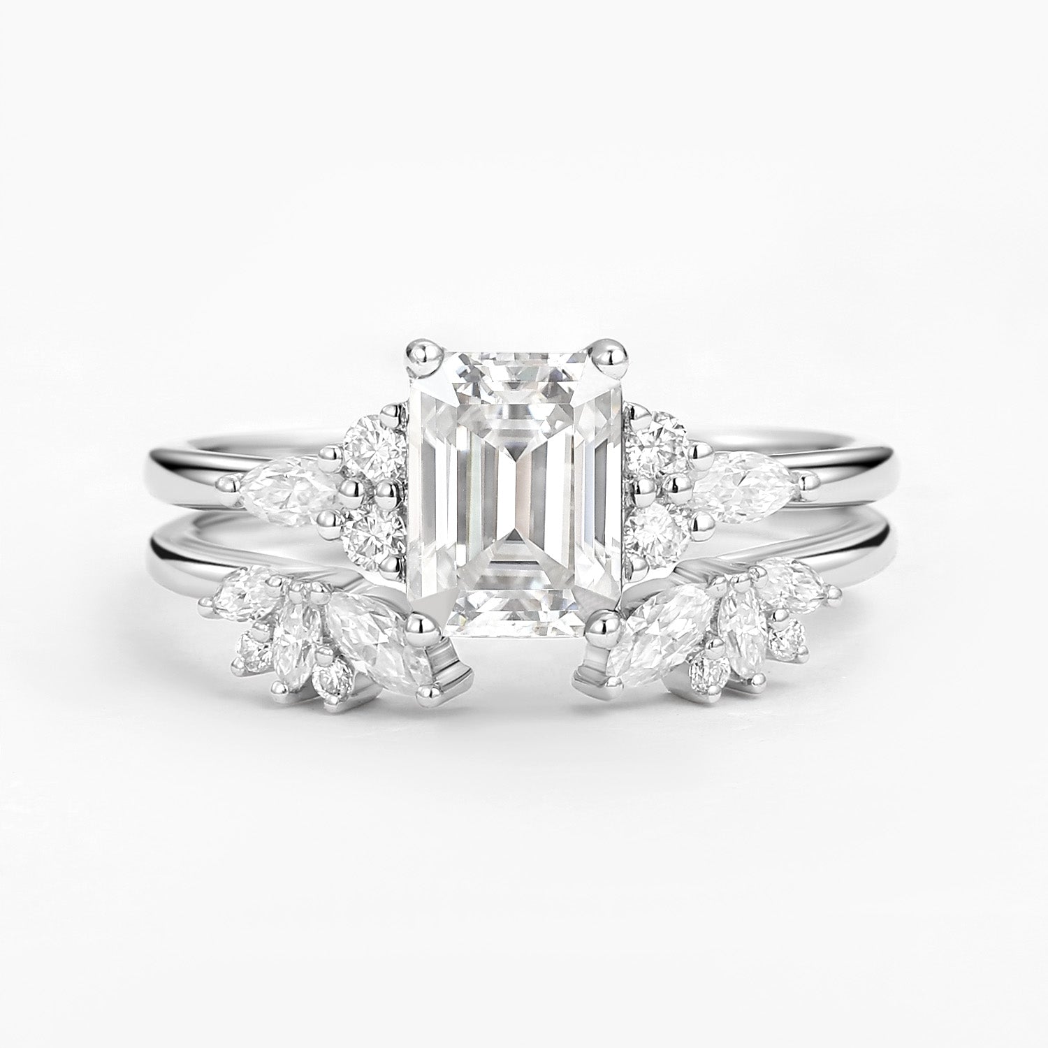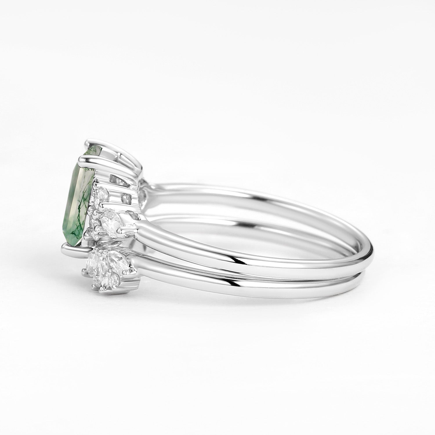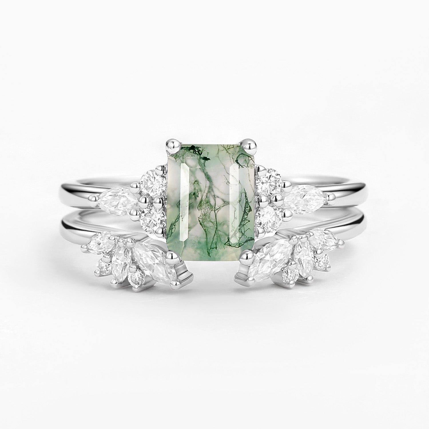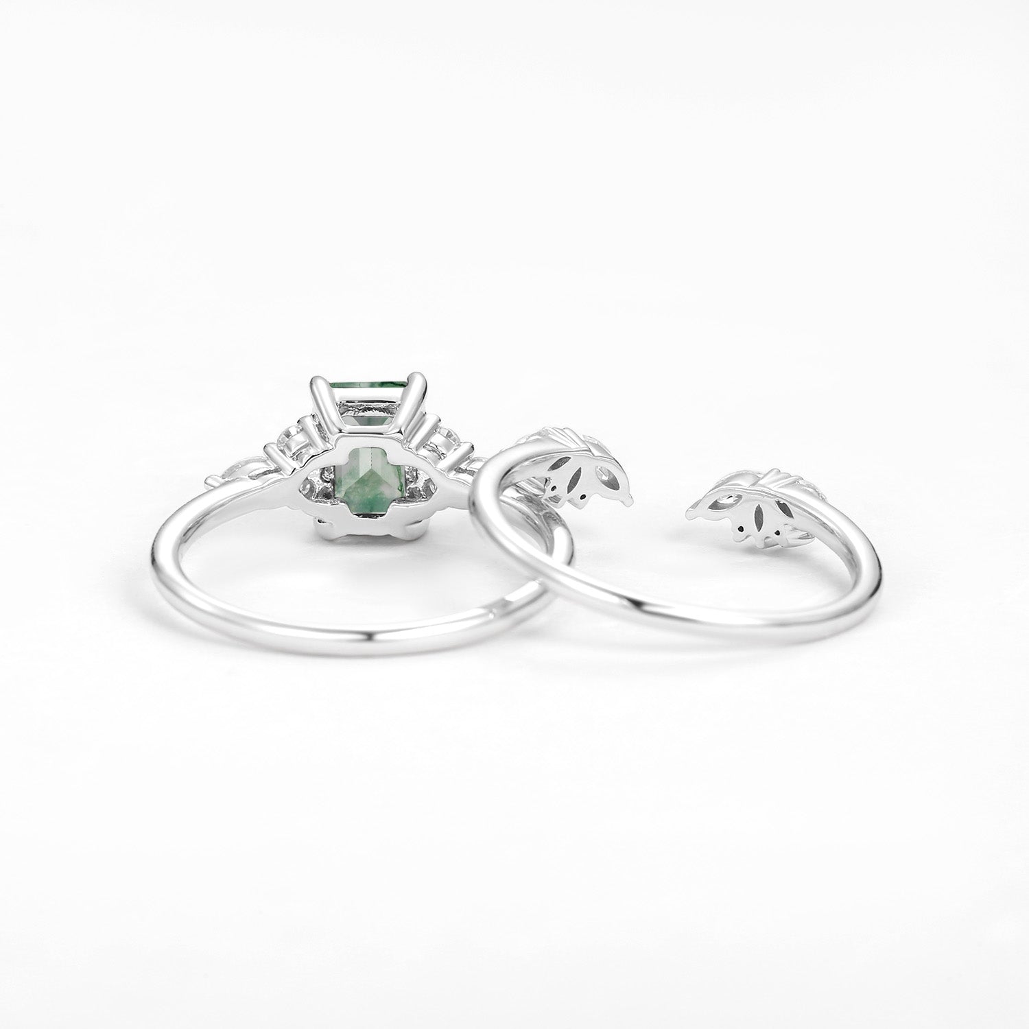 Emerald Cut Green Moss Agate Cluster Engagement Ring Set 2PCS