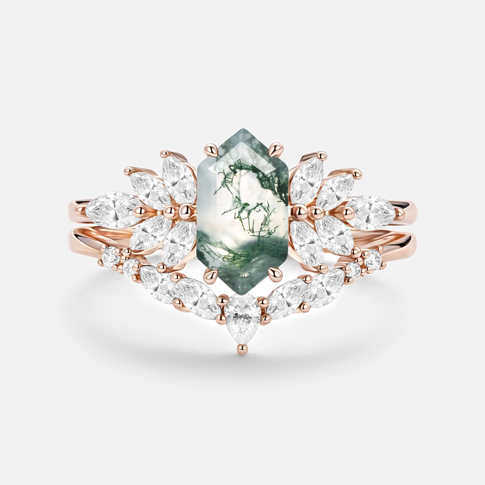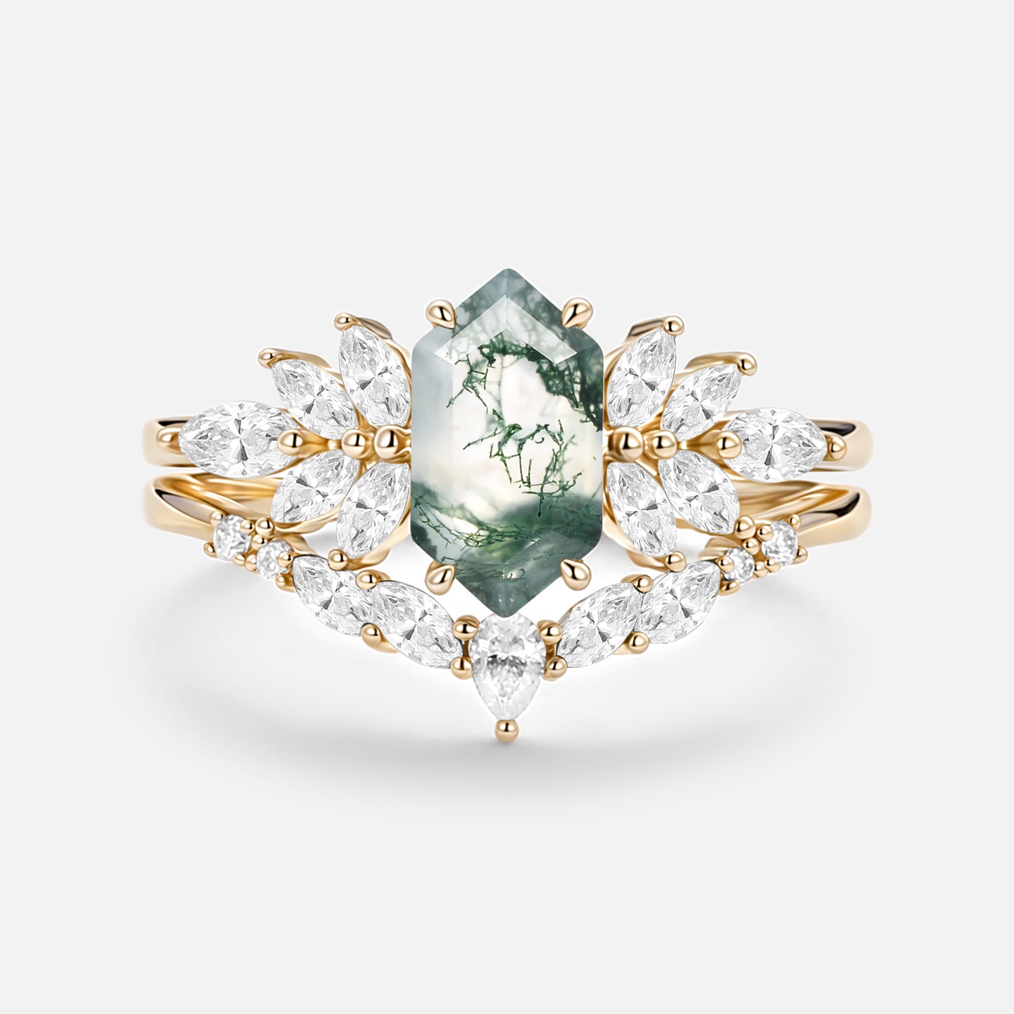 Hexagon Cut Moss Agate Vintage Ring Set 2pcs - Meadow