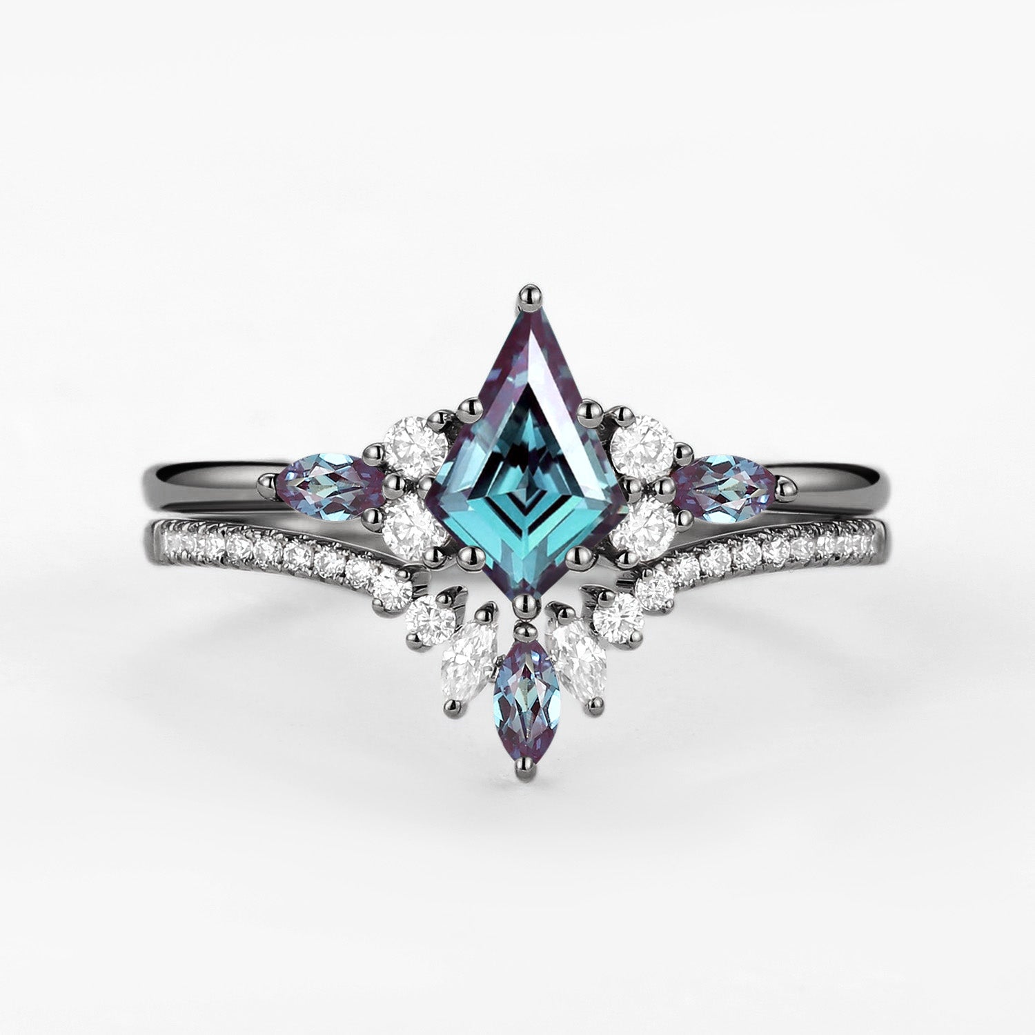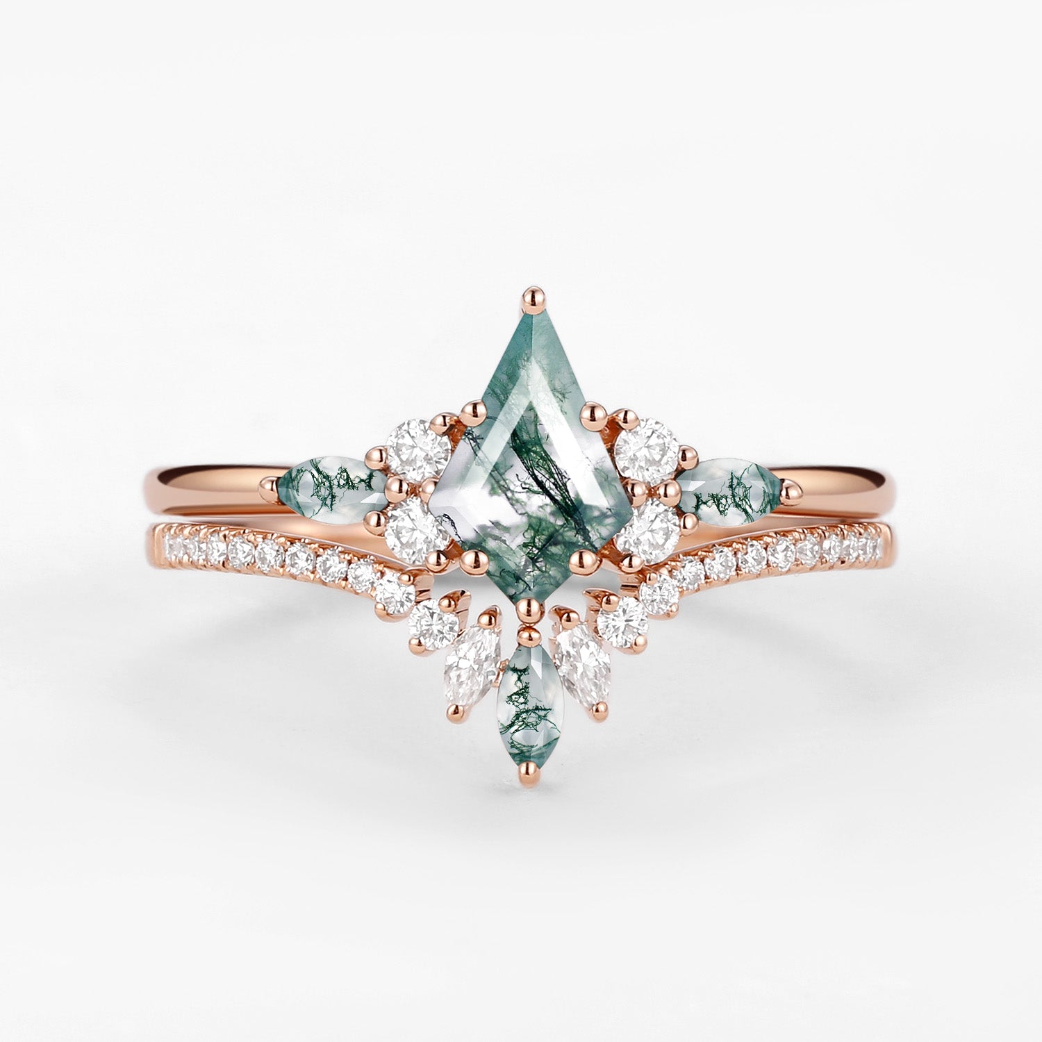 Kite Cut Green Moss Agate Three Stone Engagement Bridal Set 2pcs - Rebecca