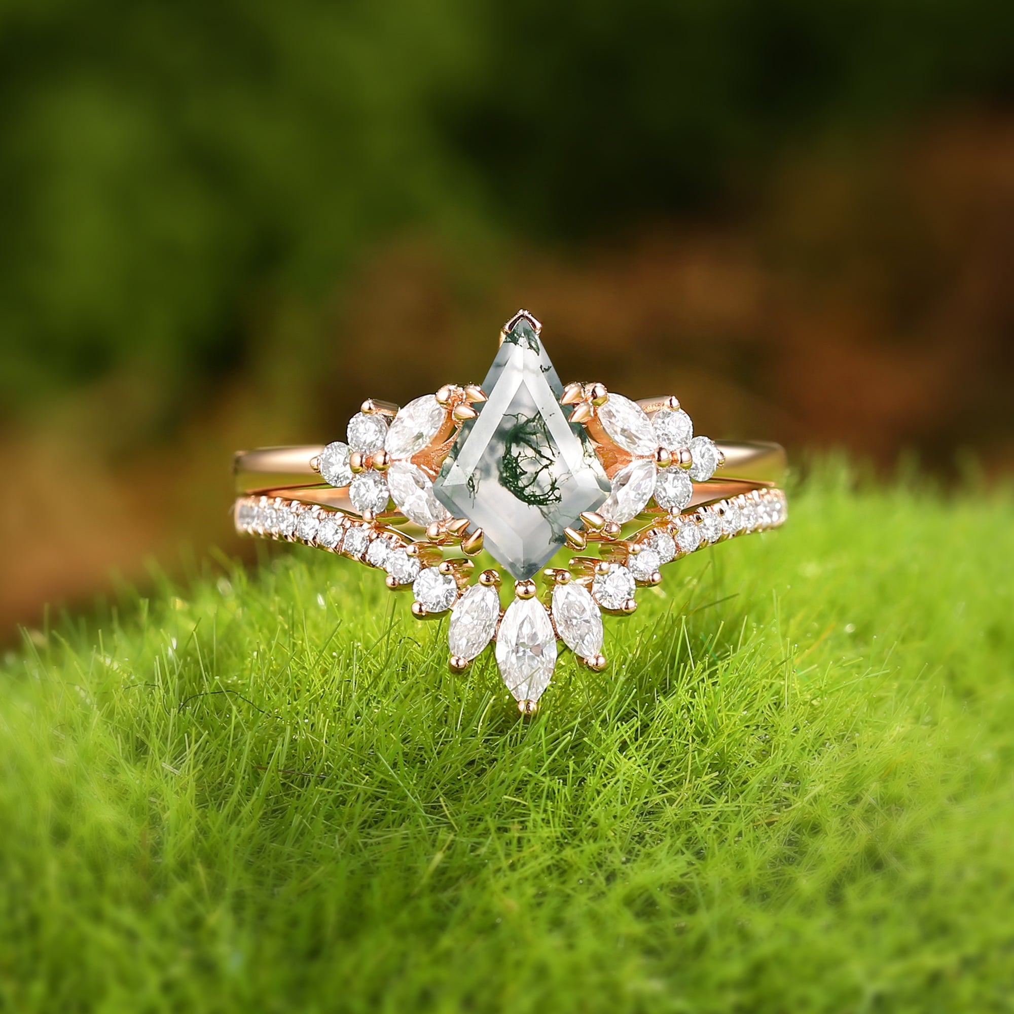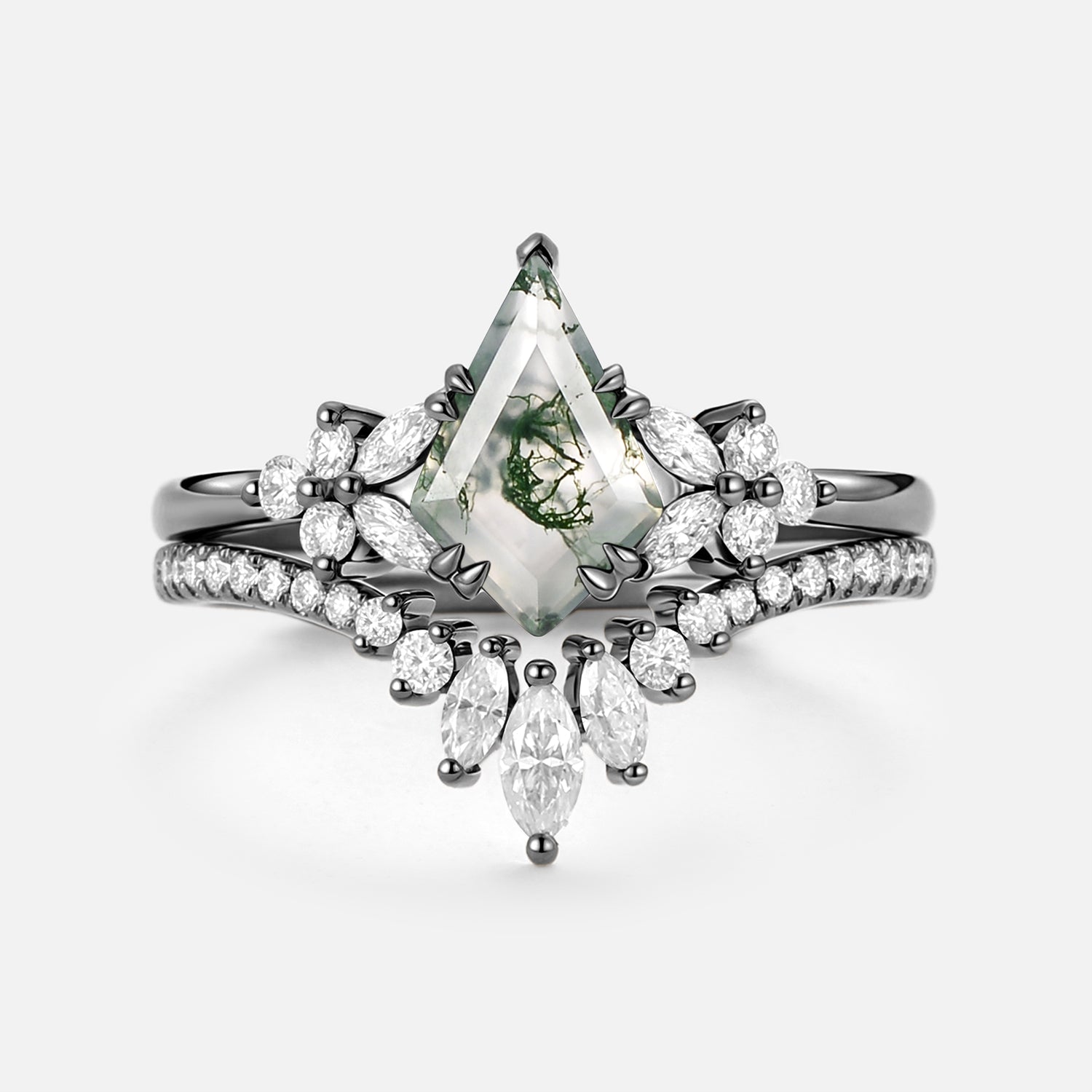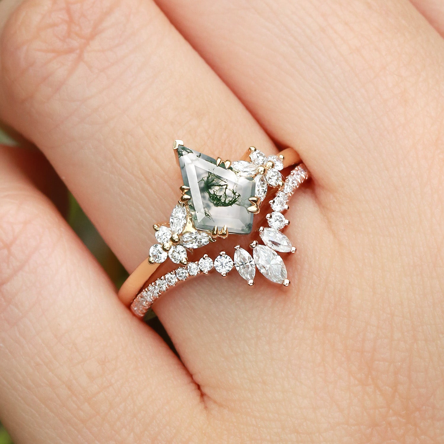 Kite Cut Moss Agate Cluster Engagement Ring Set 2pcs - Sora