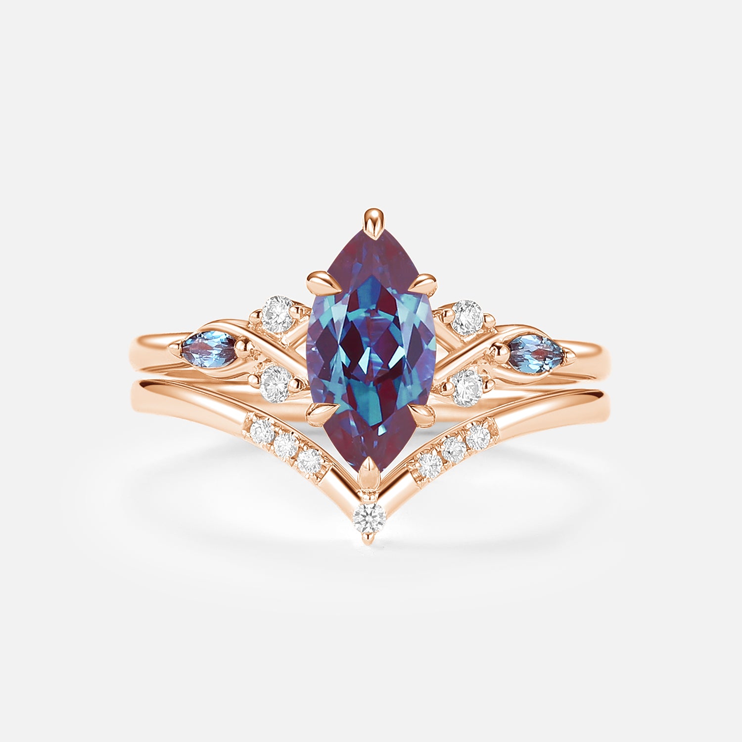 Marquise Cut Minimalist Lab Alexandrite Engagement Ring Sets 2pcs - Mirage