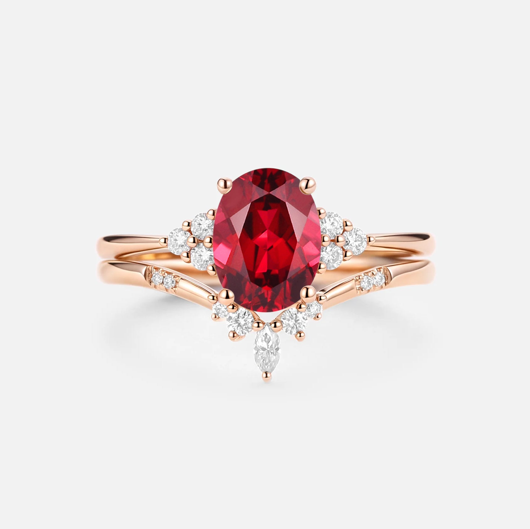 Felicegals Oval Cut Lab Ruby Classic Cluster Gold Ring Set 2pcs Moissanite Stacking Curved Custom Ring Gift for Her