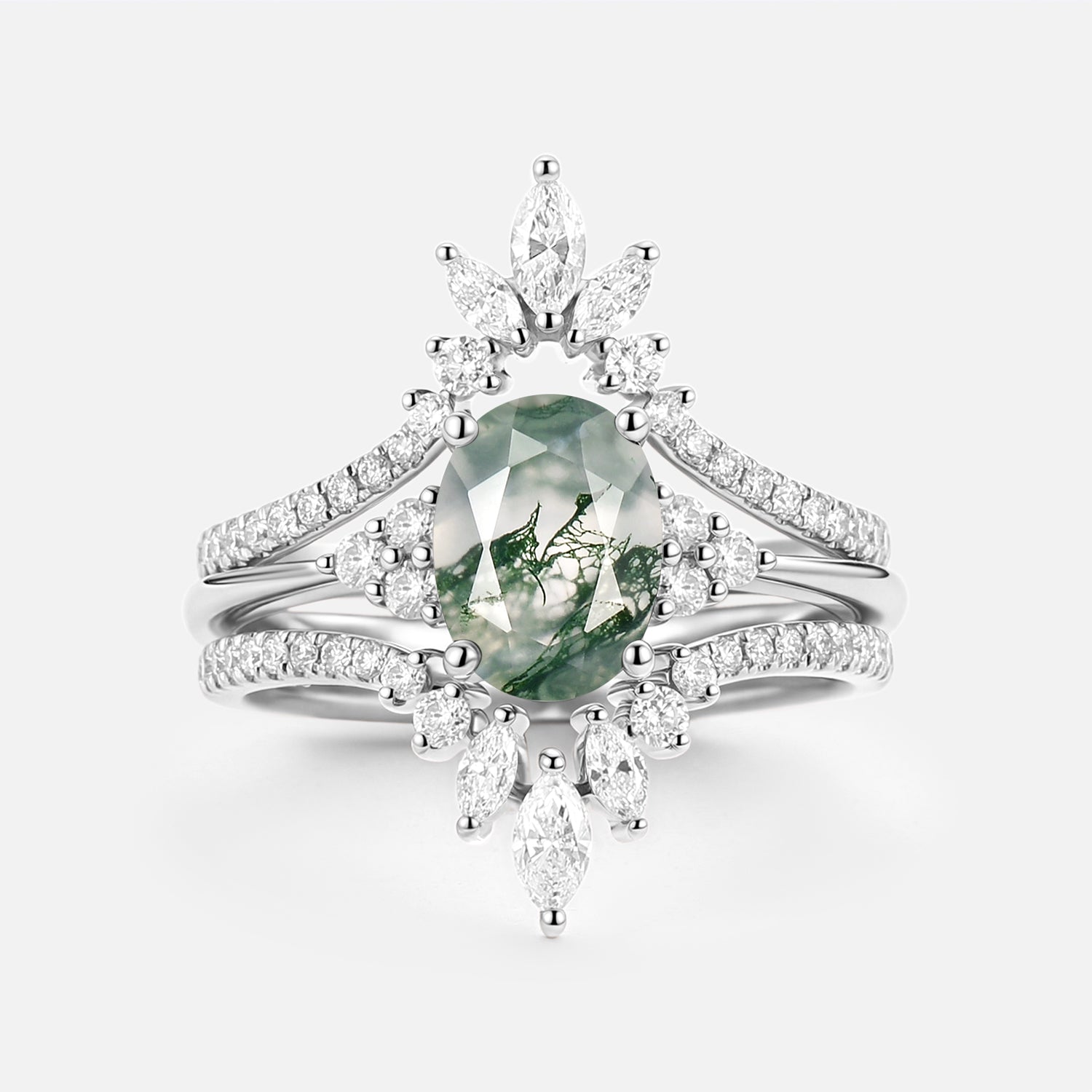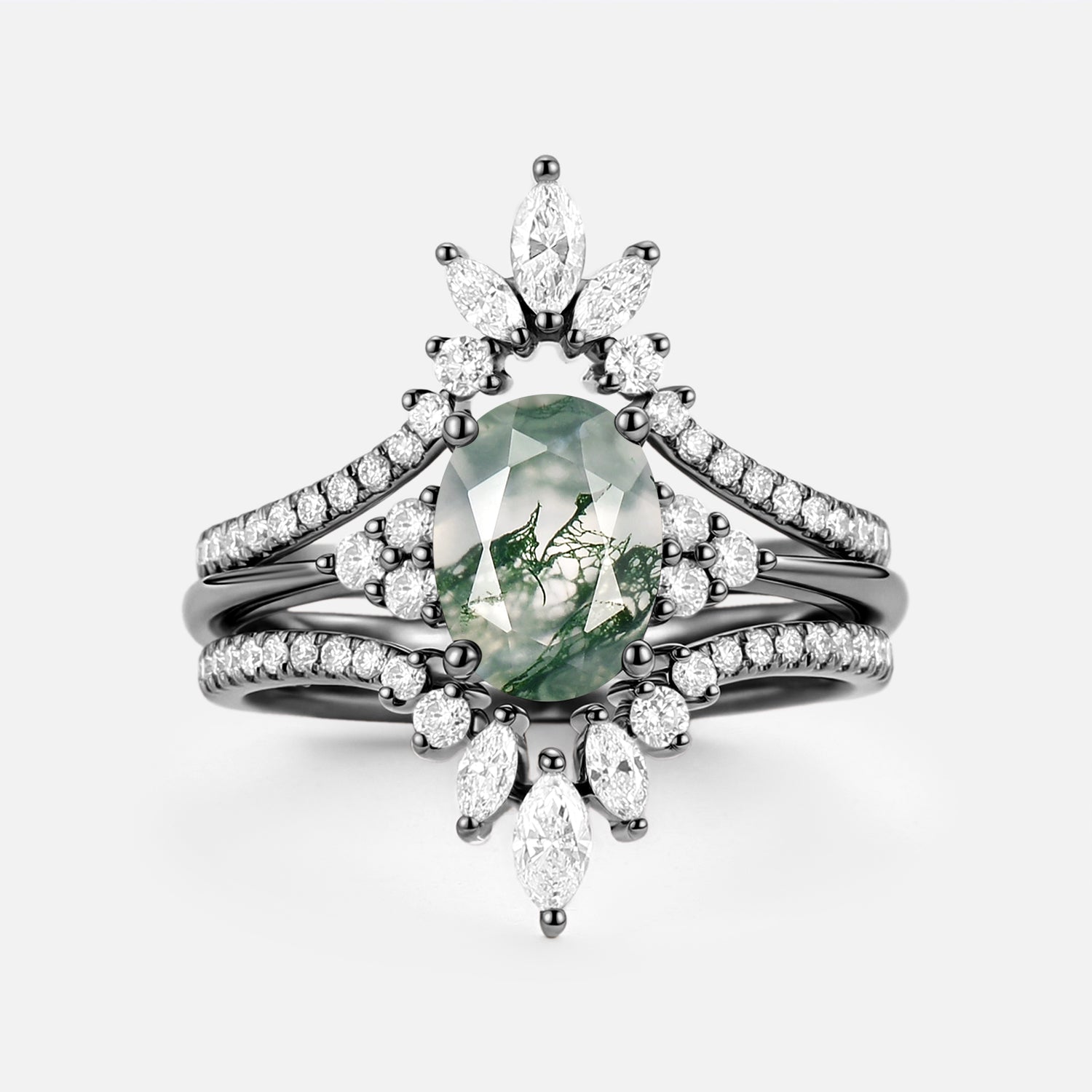 Felicegals Oval Cut Moss Agate Classic Cluster Gold Ring Set 2pcs Moissanite Stacking Curved Custom Ring Gift for Her