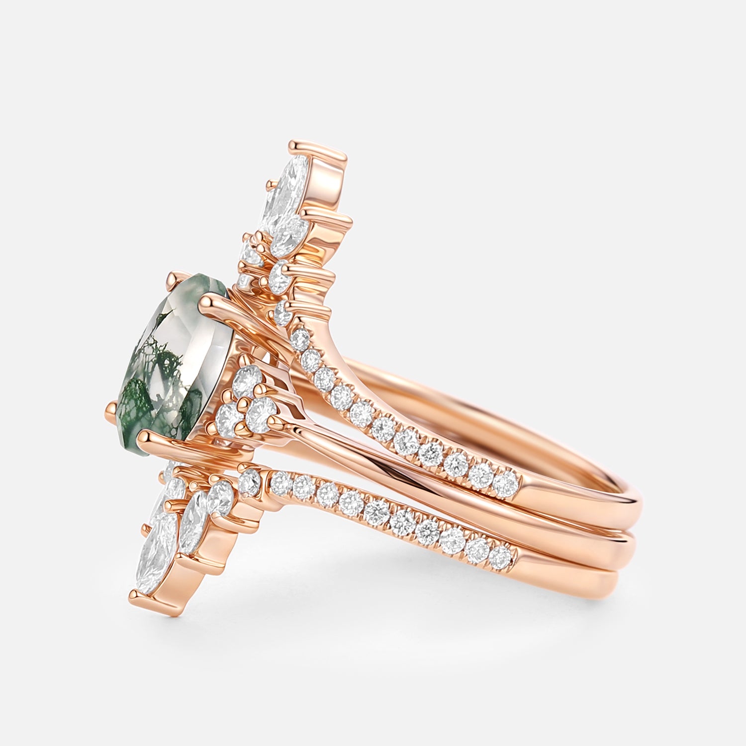 Oval Cut Moss Agate Classic Cluster Gold Ring Set 3pcs - Chroma