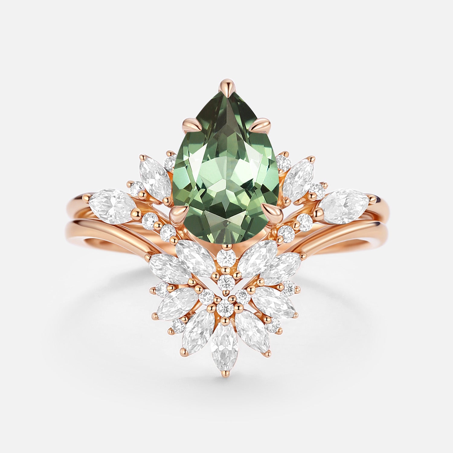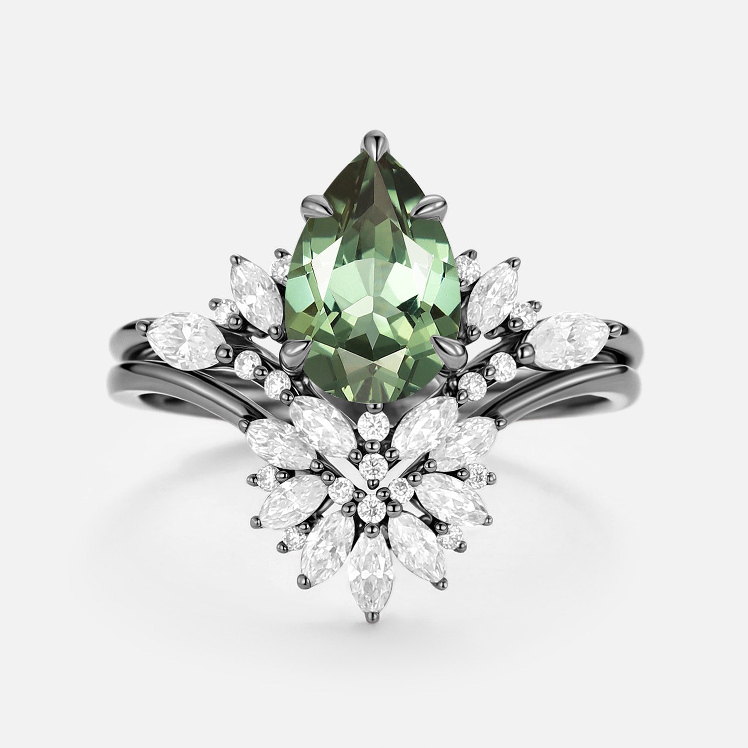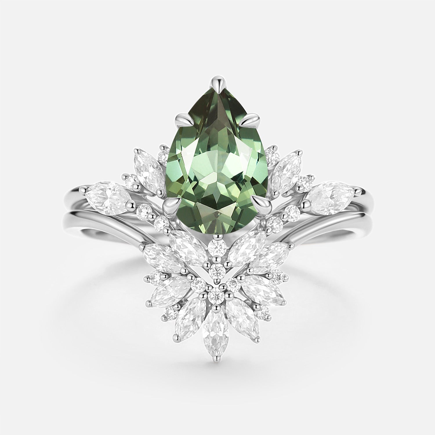 Pear Cut Lab Green Sapphire Cluster Engagement Ring Set 2pcs - Peryn