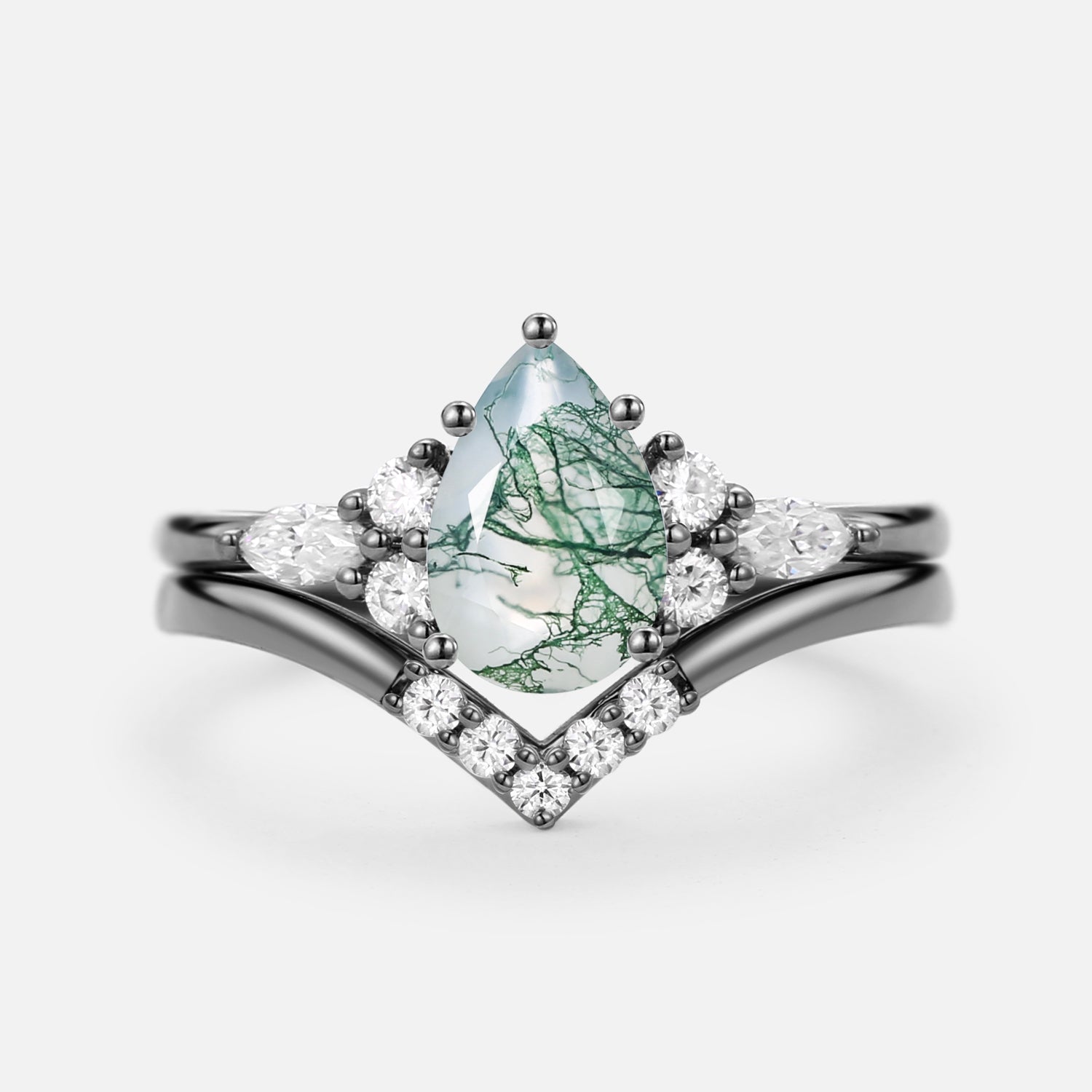 Felicegals Pear Shaped Moss Agate Ring Set 2pcs Chevron Moissanite Stacking Wedding Band Custom Curved Matching Ring Anniversary Gift For Her