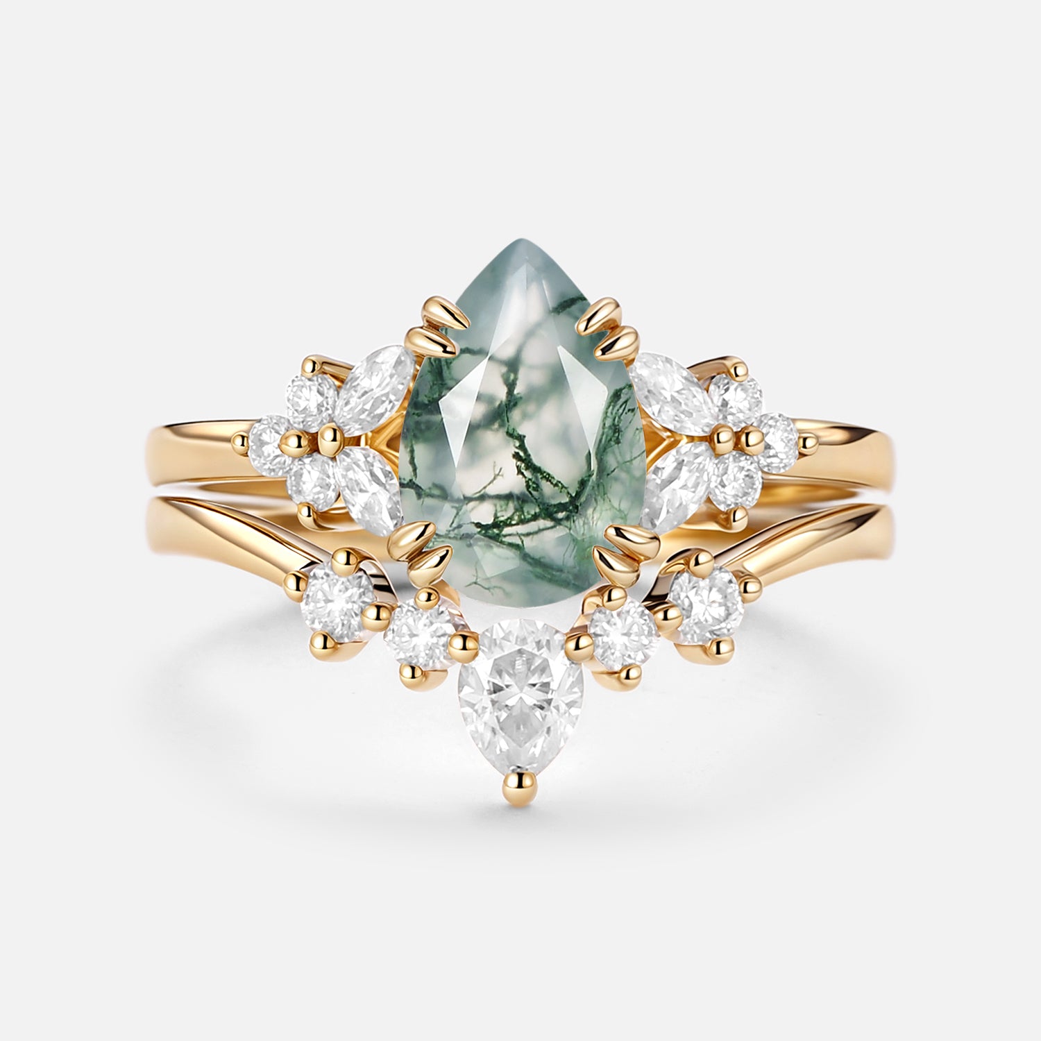 Felicegals Pear Shaped Moss Agate Ring Set 2pcs Chevron Moss Agate Stacking Wedding Band Custom Curved Matching Ring Anniversary Gift For Her