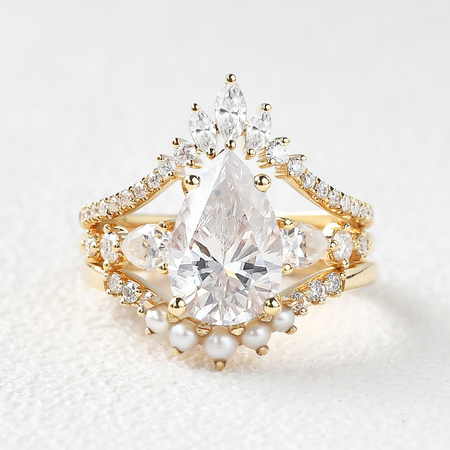 3.0ct Pear Shaped Moss Agate & Pearl Bridal Ring Set 3pcs