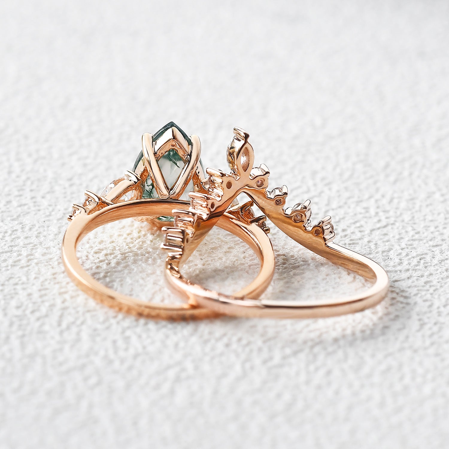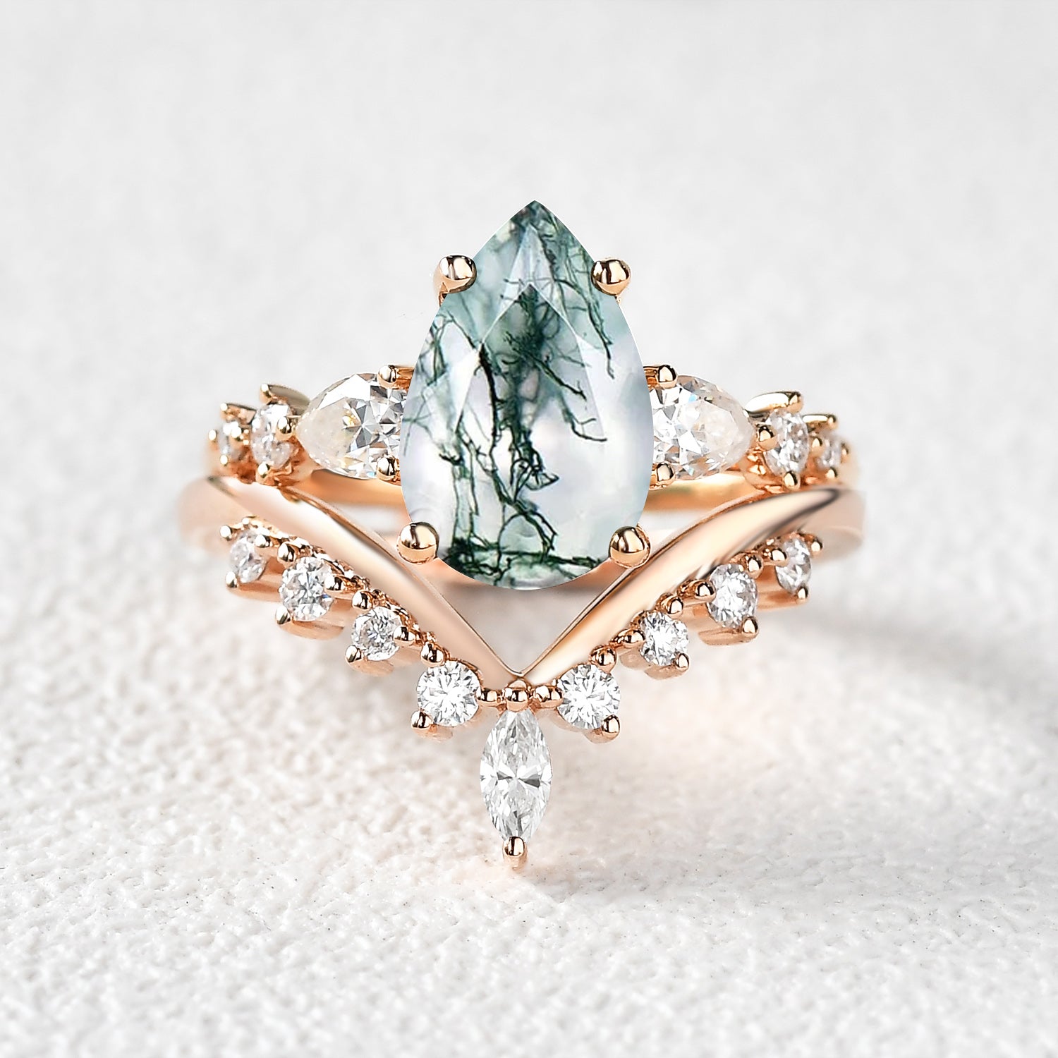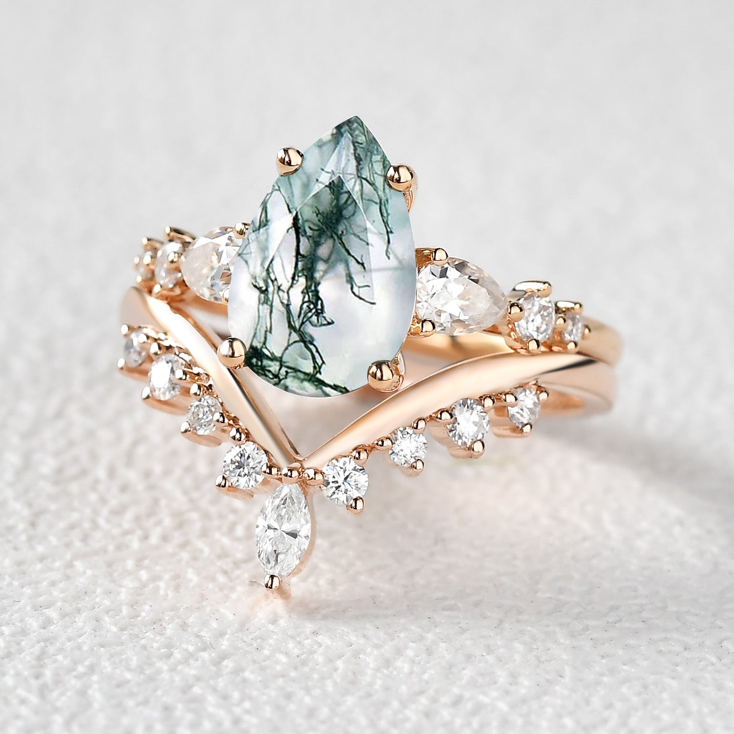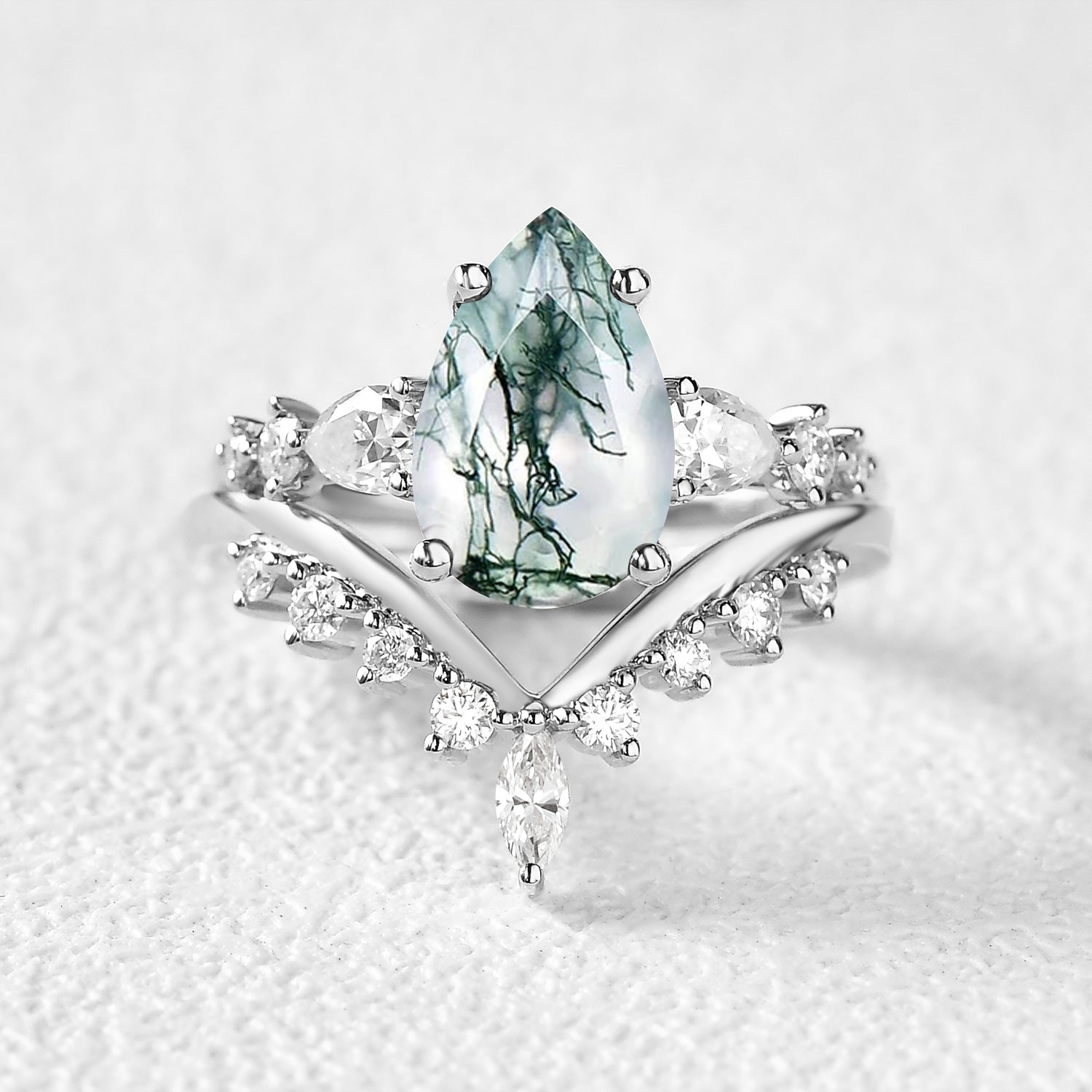Pear Shaped Moss Agate & Pearl Chevron Bridal Ring Set 2pcs