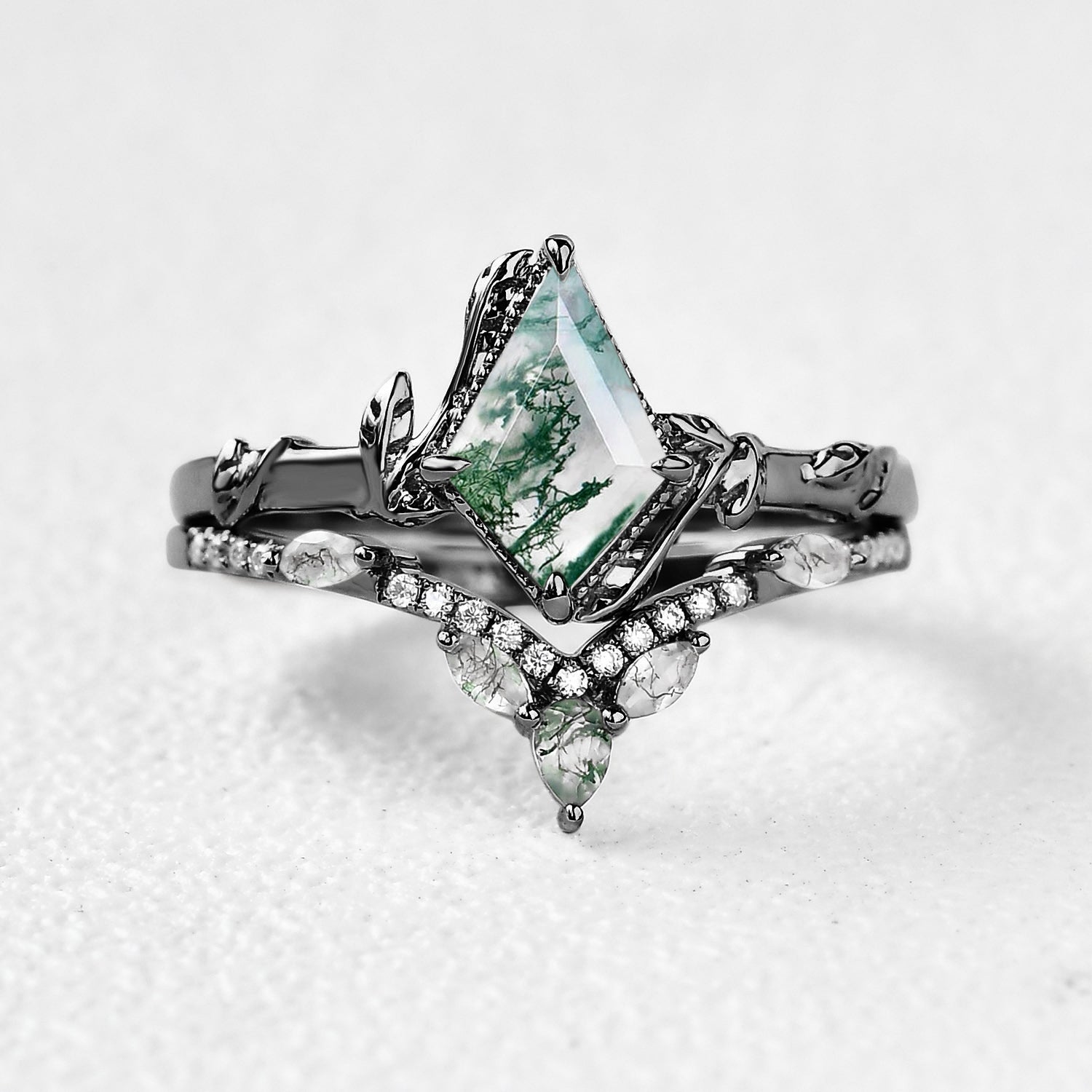 Black Gold Kite Cut Moss Agate Leafy Ring Sets 2pcs - Lark