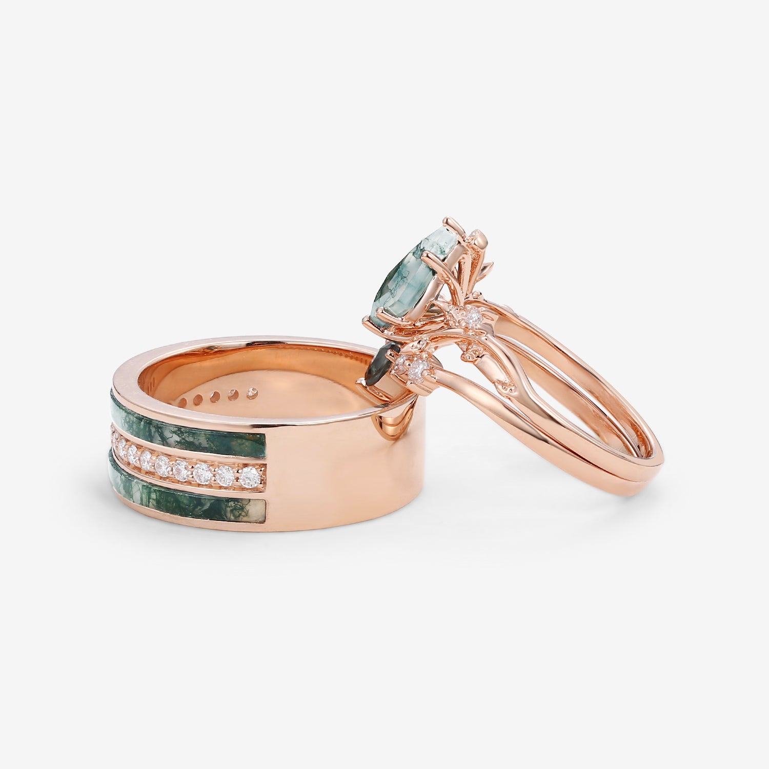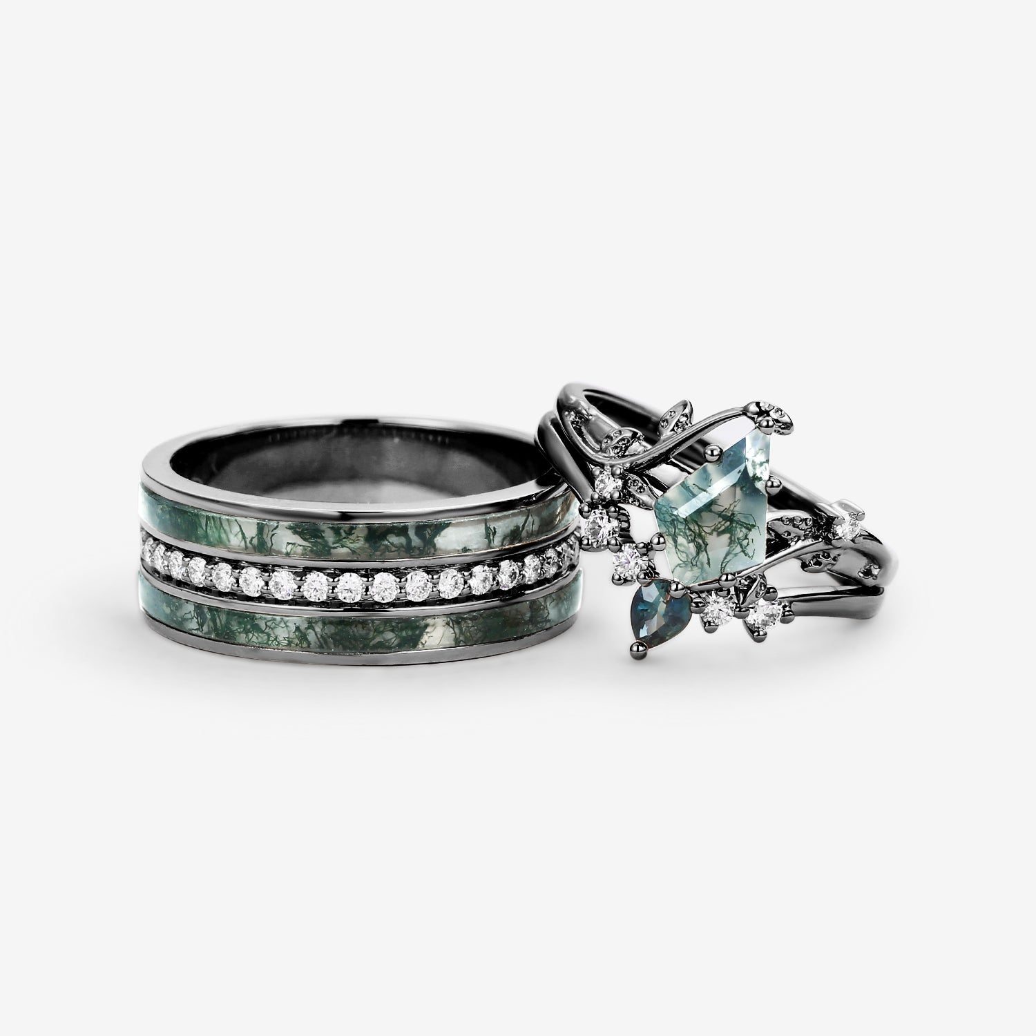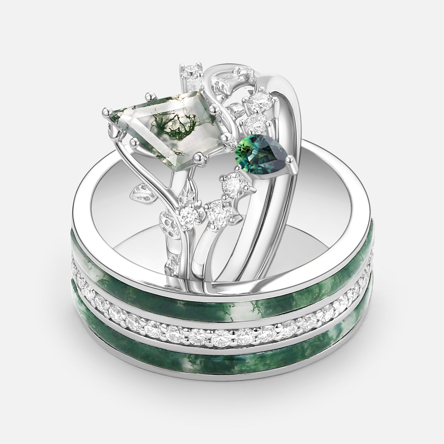 Nature Inspired - Moss Agate & Teal Sapphire Leafy Couple Ring Set 3pcs - Willow