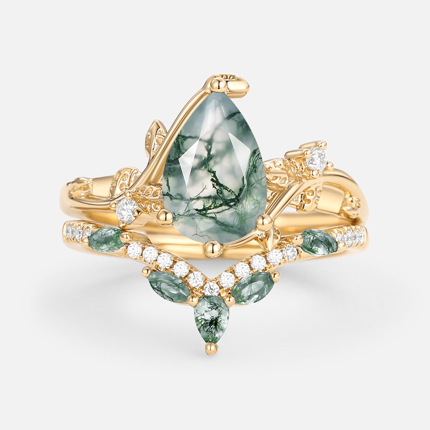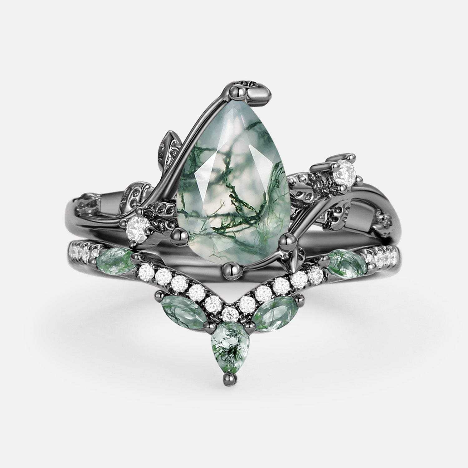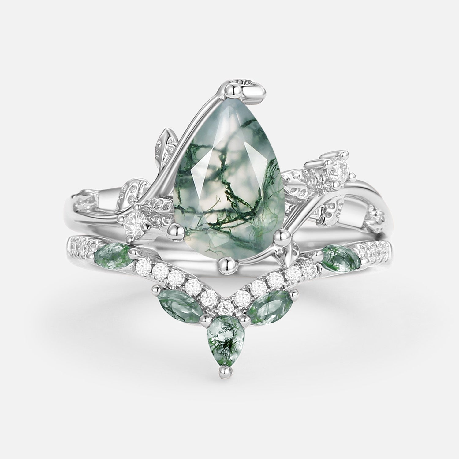Pear Cut Moss Agate Vine Engagement Ring Set 2pcs - Twigs
