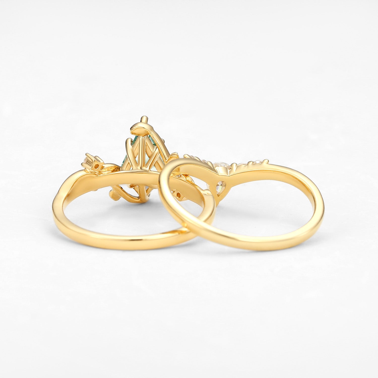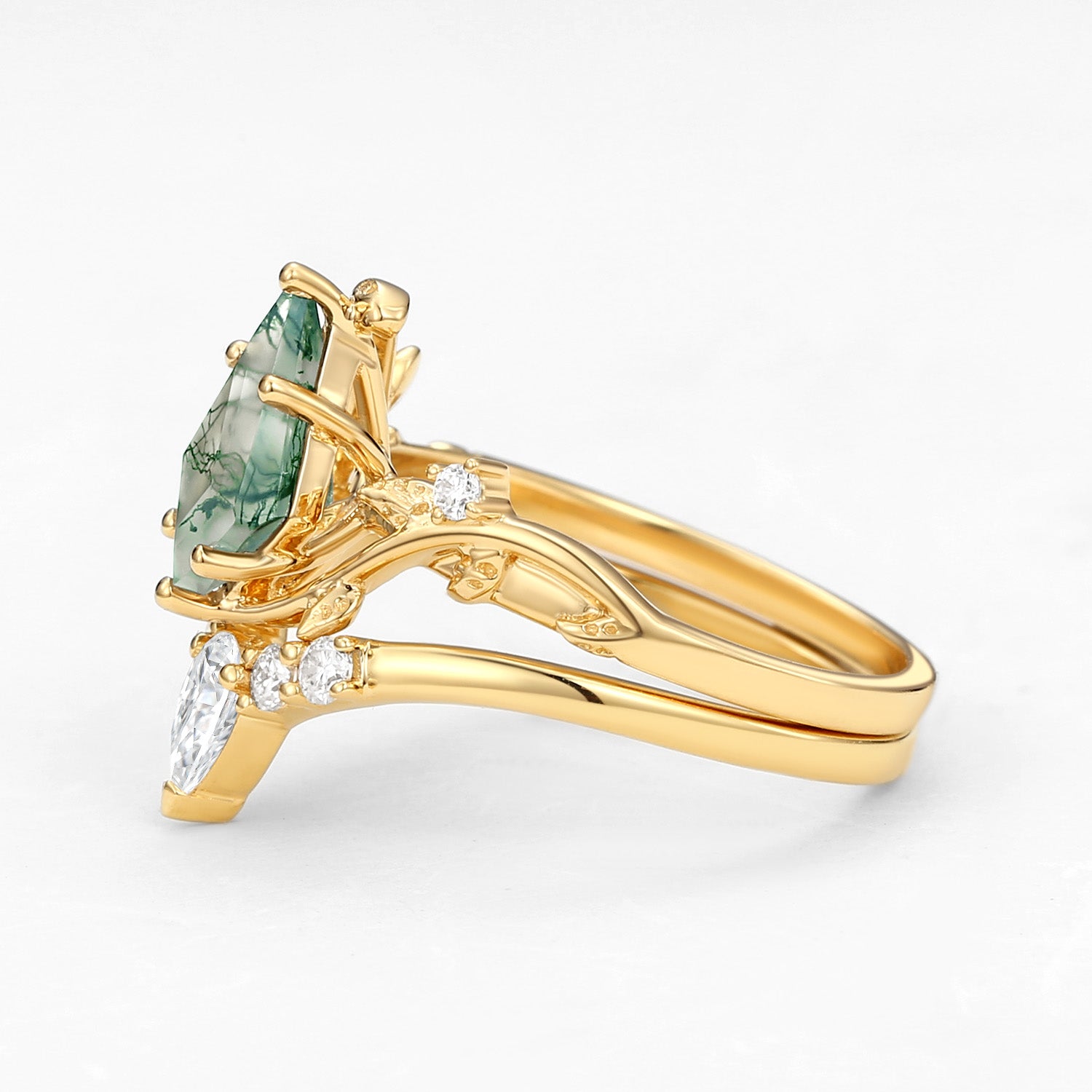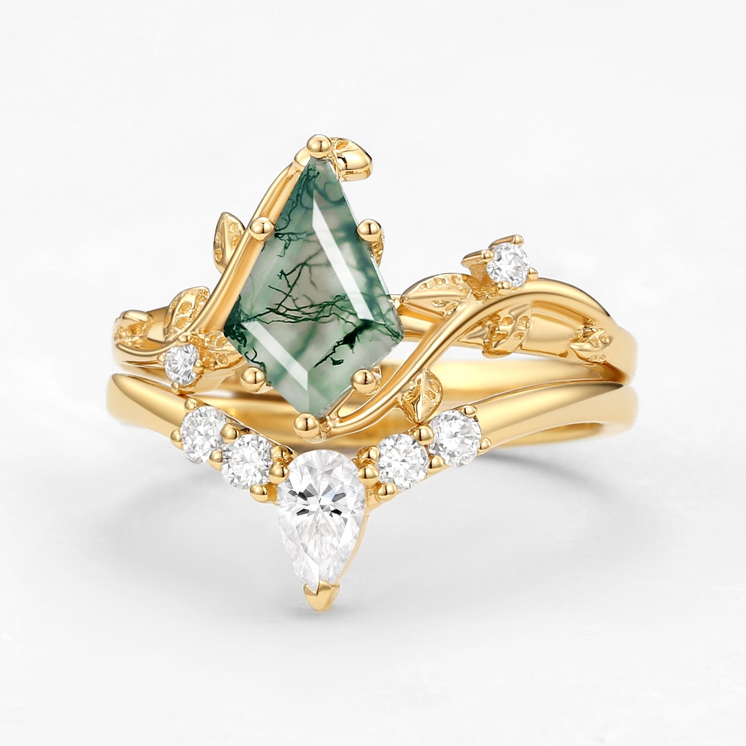 Unique Kite Cut Green Moss Agate Leafy Ring Sets 2pcs