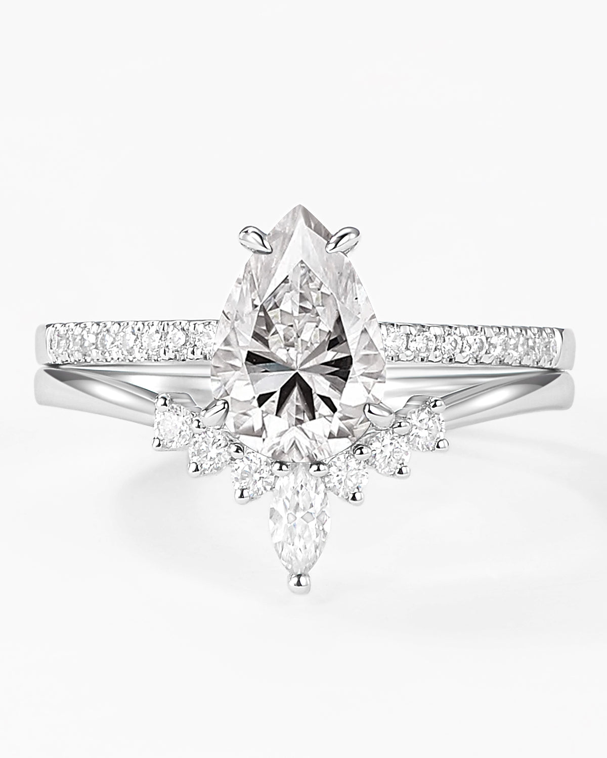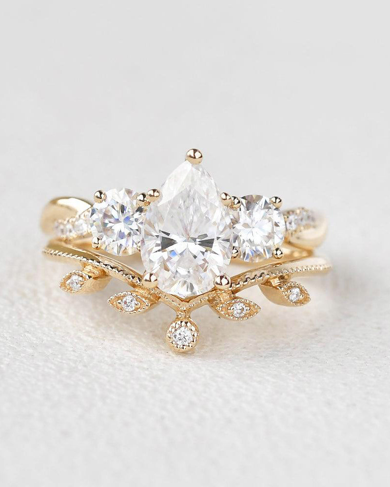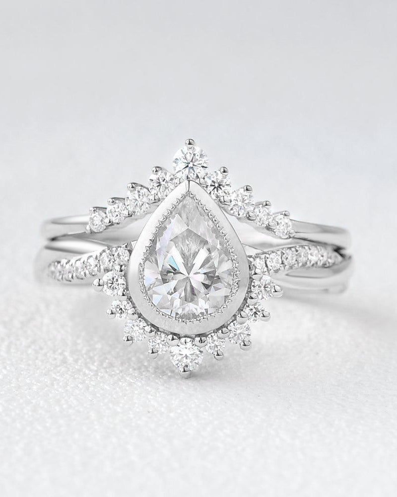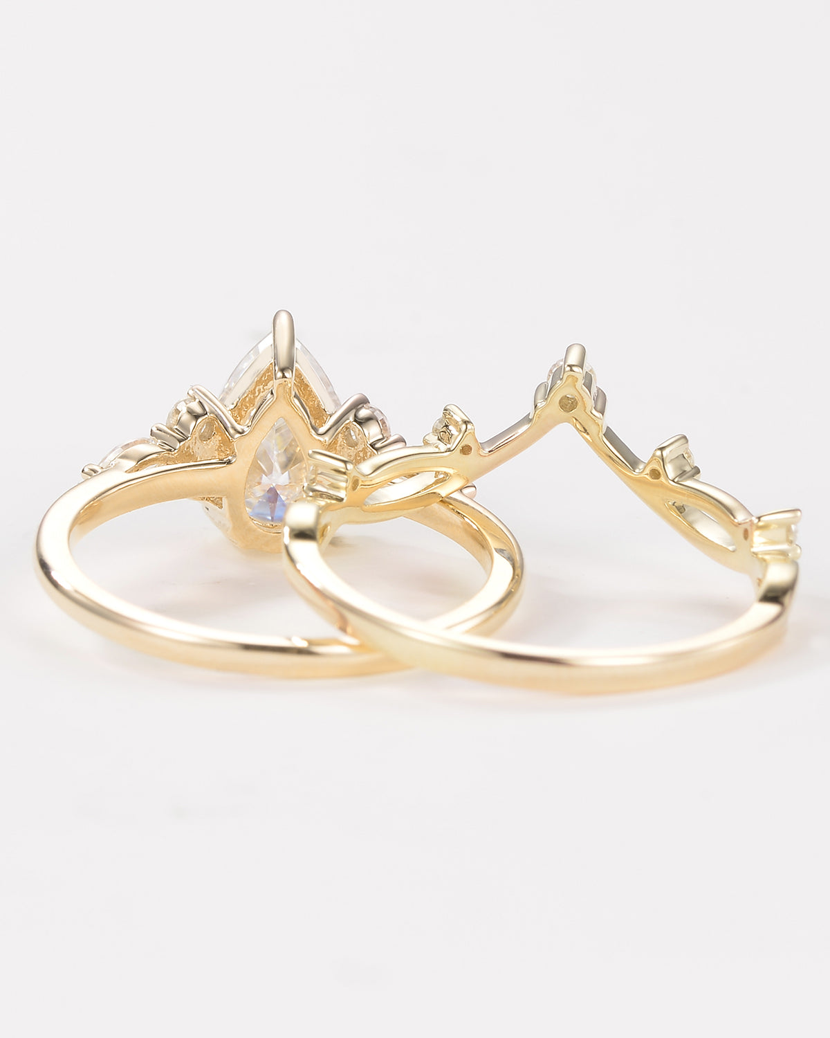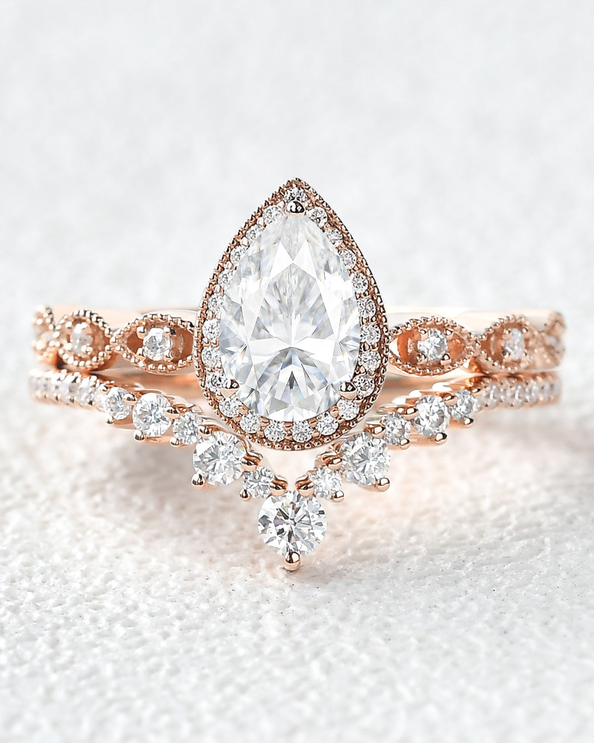 The Vintage Rings collection brings together exquisite rings in a vintage style, adding romance and elegance to your special moments. Each pear ring in this collection has been carefully designed, showcasing the charm of tradition and classic beauty while incorporating modern elements. Our moissanite vintage ring set is one of the highlights of this collection. Featuring high-quality moissanite as the main stone, these rings exude captivating brilliance and shimmer, making your engagement ring truly unique and eye-catching.
