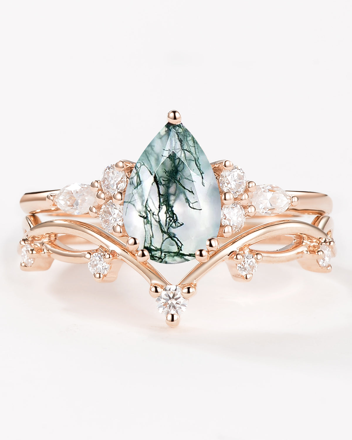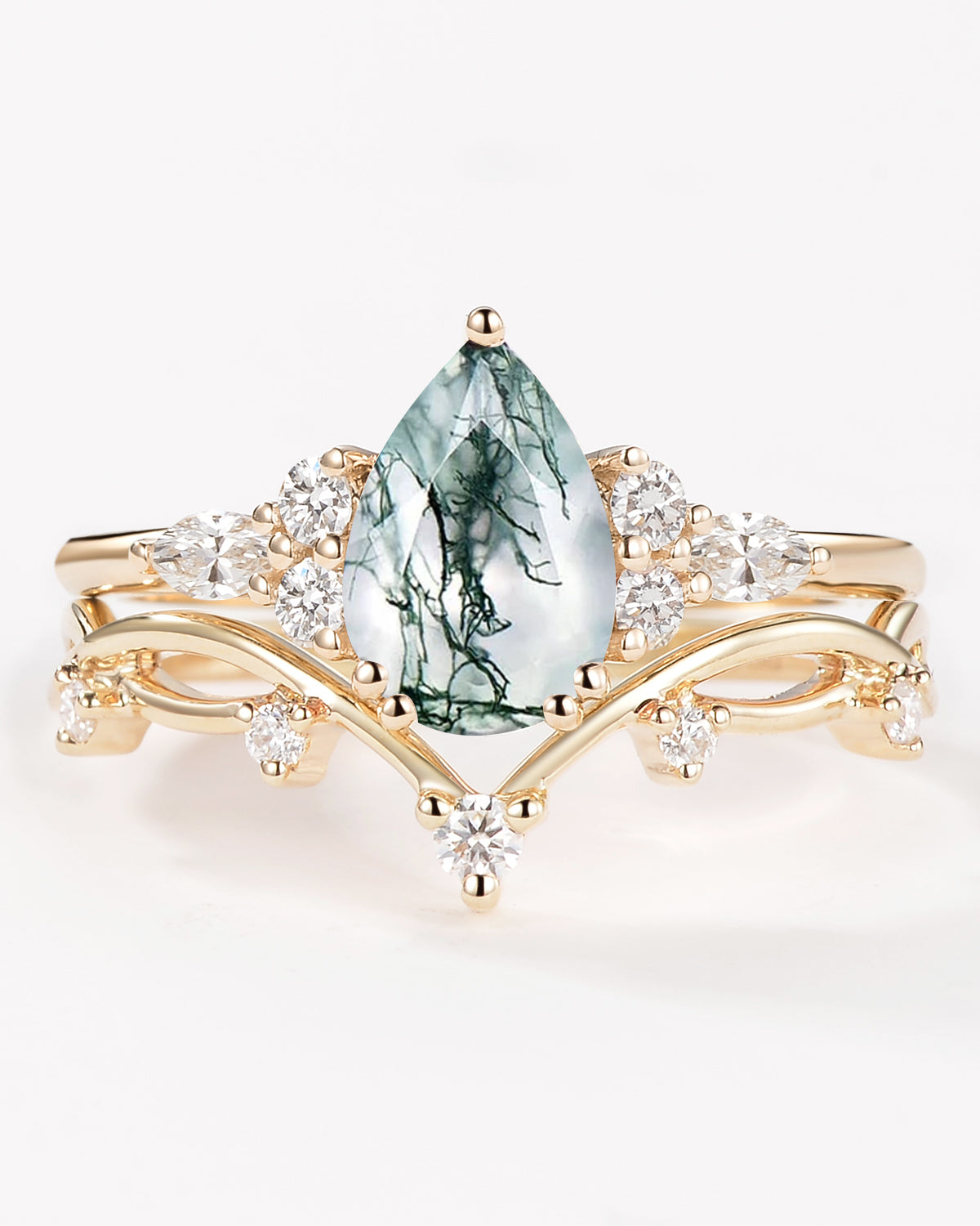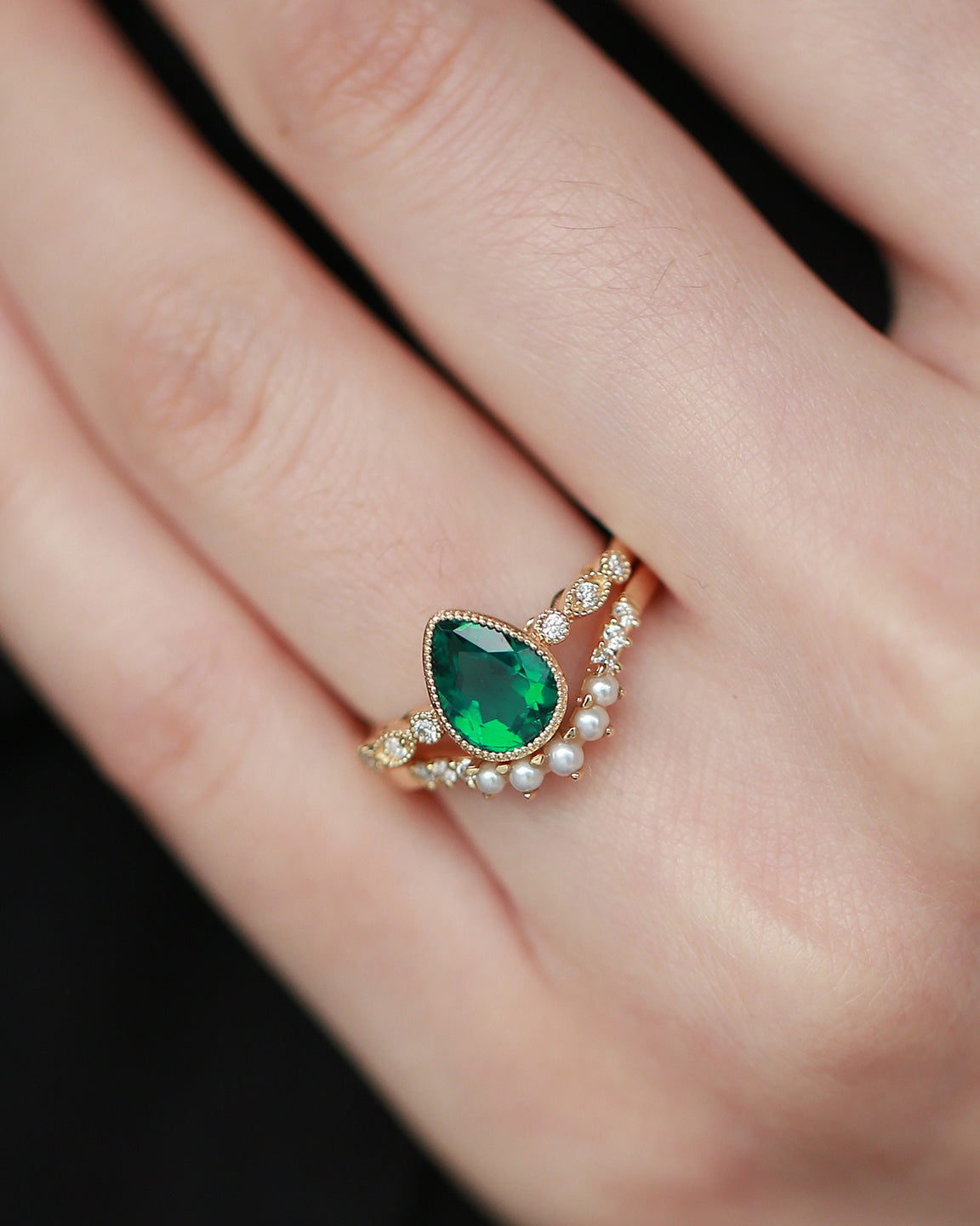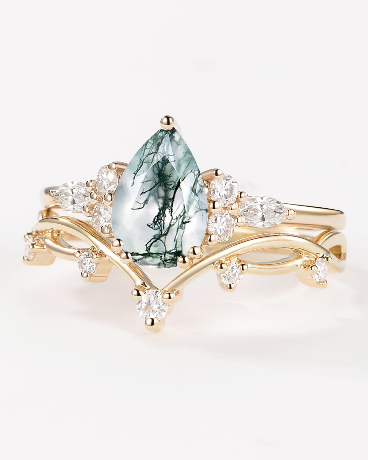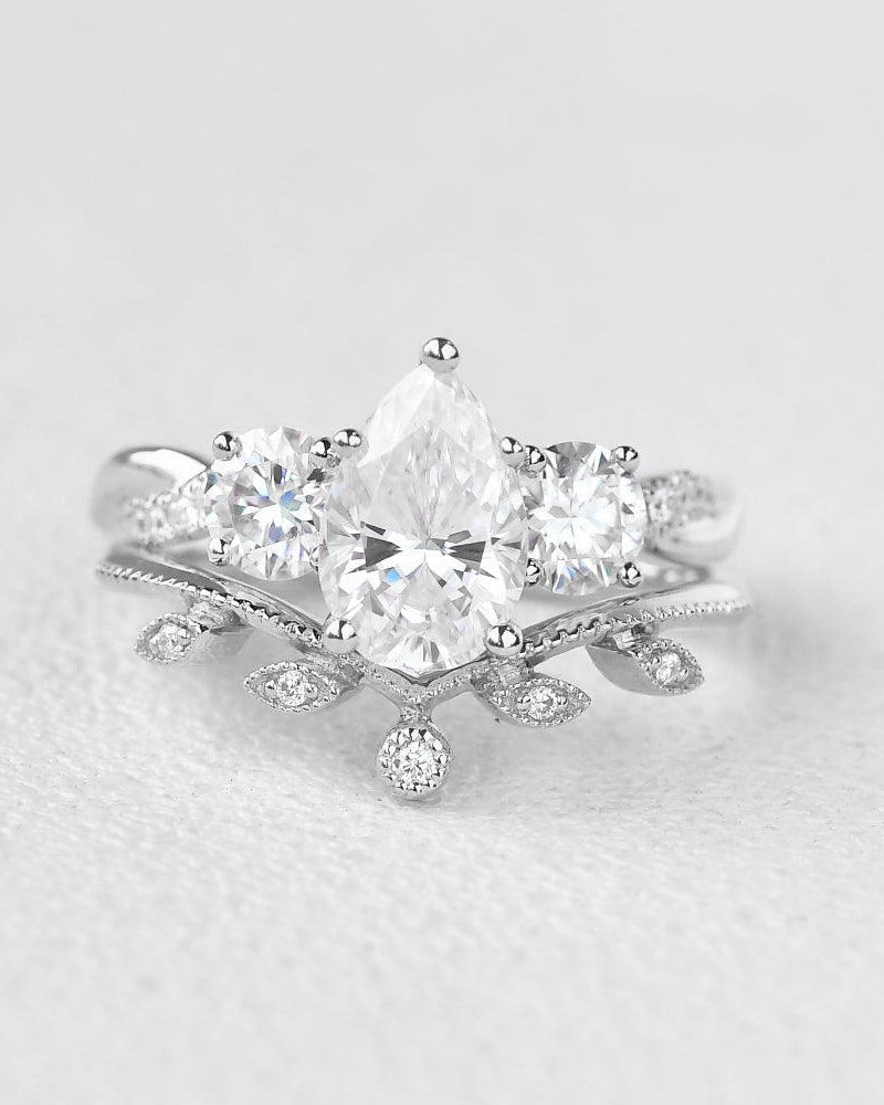 The Vintage Rings collection brings together exquisite rings in a vintage style, adding romance and elegance to your special moments. Each pear ring in this collection has been carefully designed, showcasing the charm of tradition and classic beauty while incorporating modern elements. Our moissanite vintage ring set is one of the highlights of this collection. Featuring high-quality moissanite as the main stone, these rings exude captivating brilliance and shimmer, making your engagement ring truly unique and eye-catching.