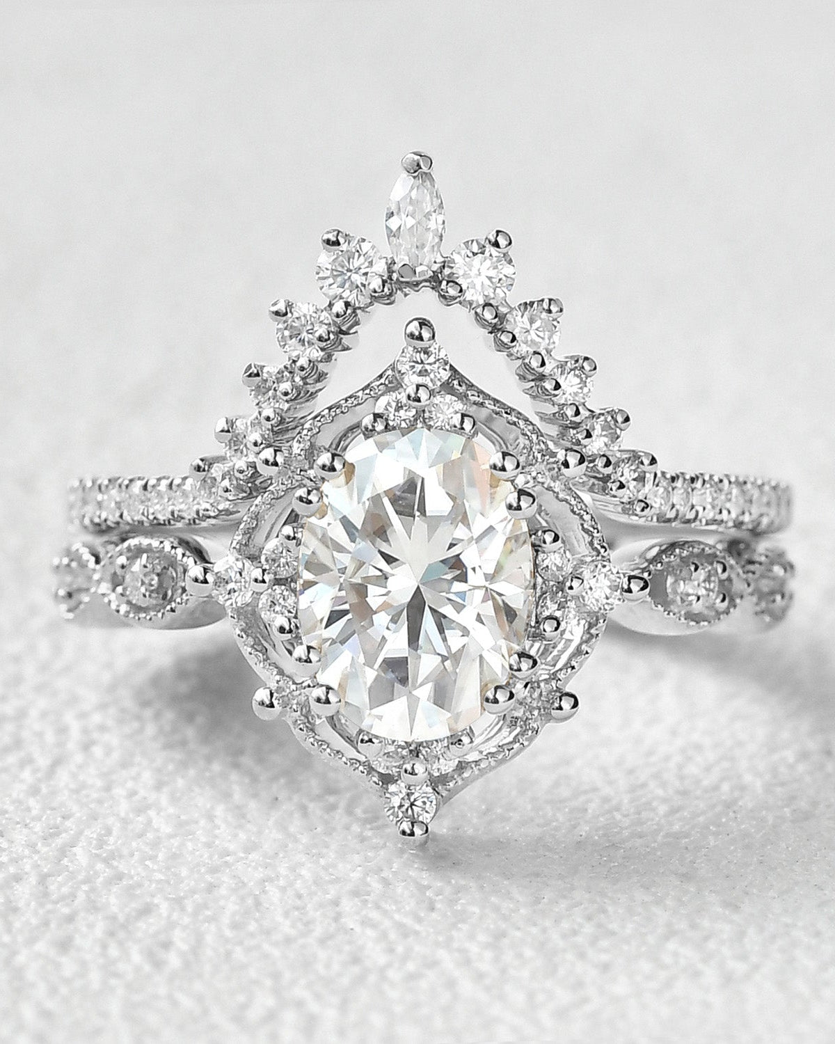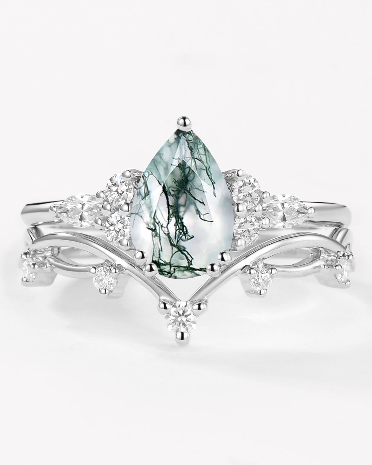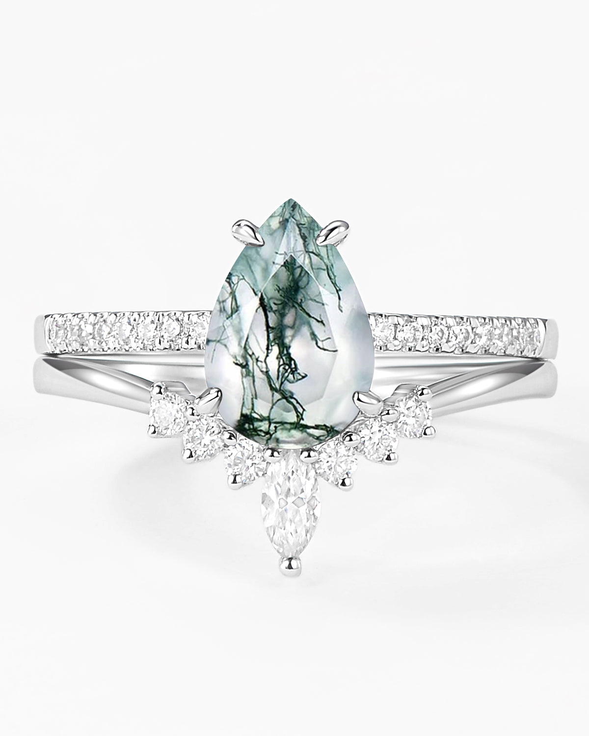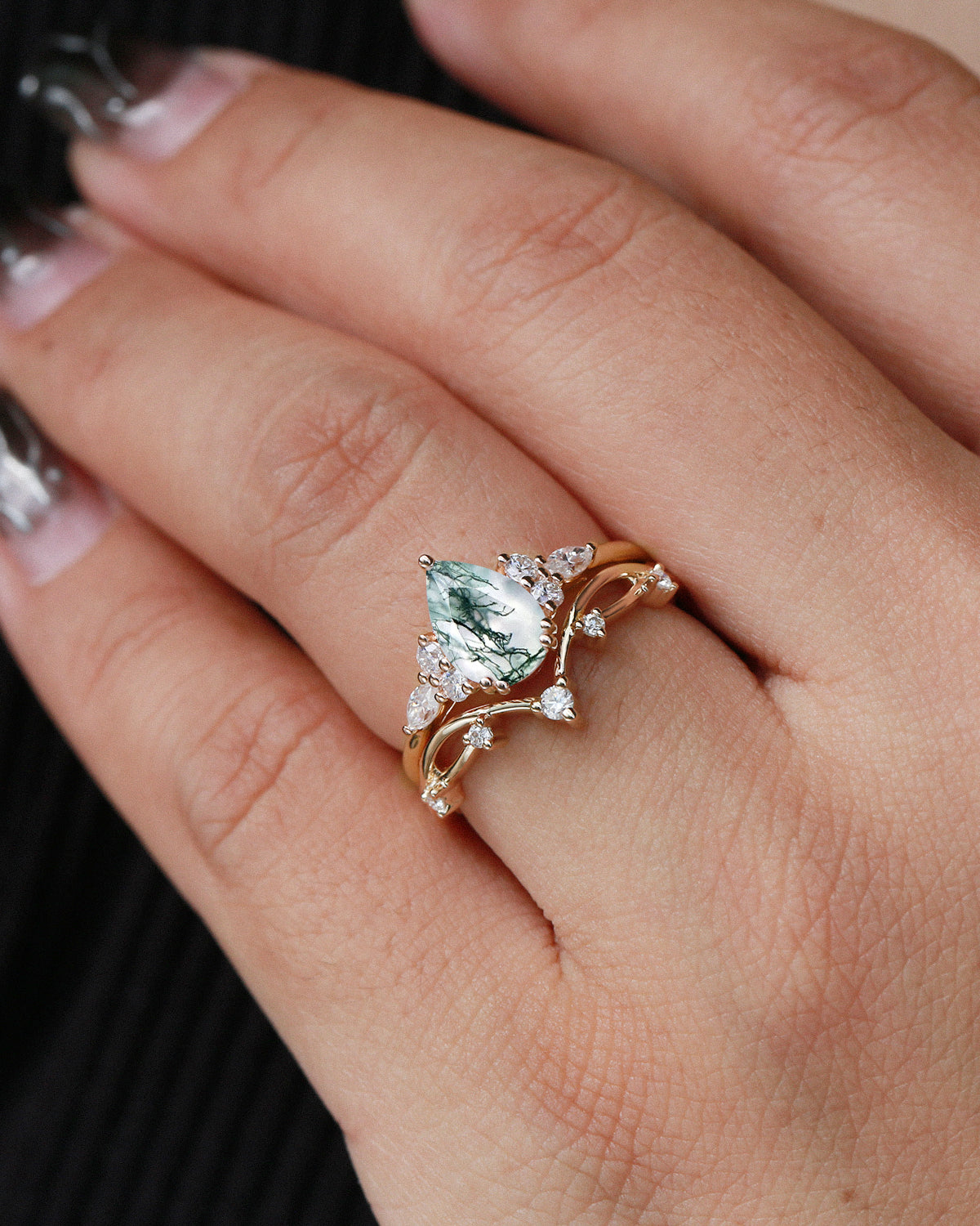 The Vintage Rings collection brings together exquisite rings in a vintage style, adding romance and elegance to your special moments. Each pear ring in this collection has been carefully designed, showcasing the charm of tradition and classic beauty while incorporating modern elements. Our moissanite vintage ring set is one of the highlights of this collection. Featuring high-quality moissanite as the main stone, these rings exude captivating brilliance and shimmer, making your engagement ring truly unique and eye-catching.