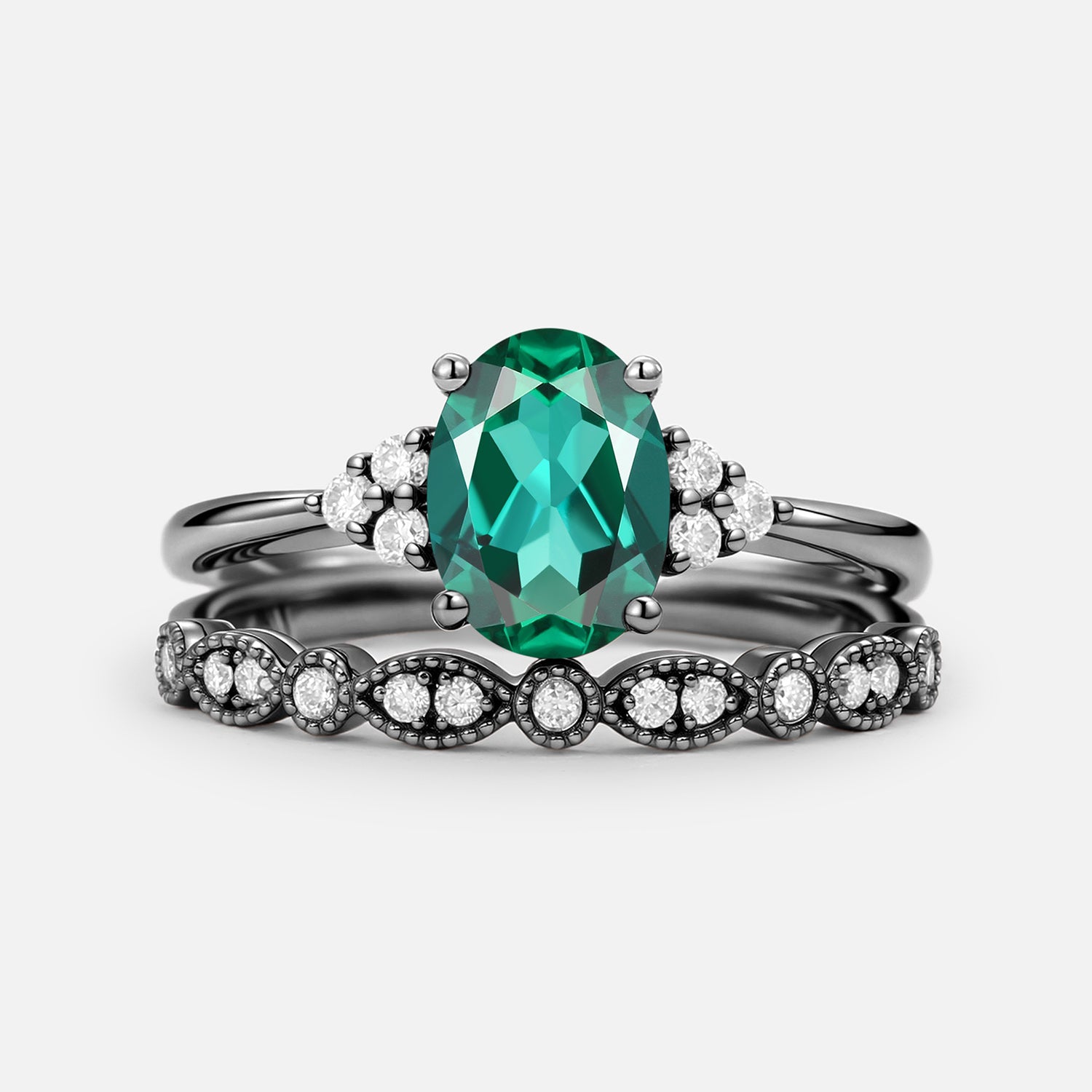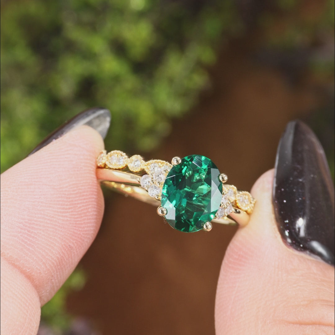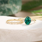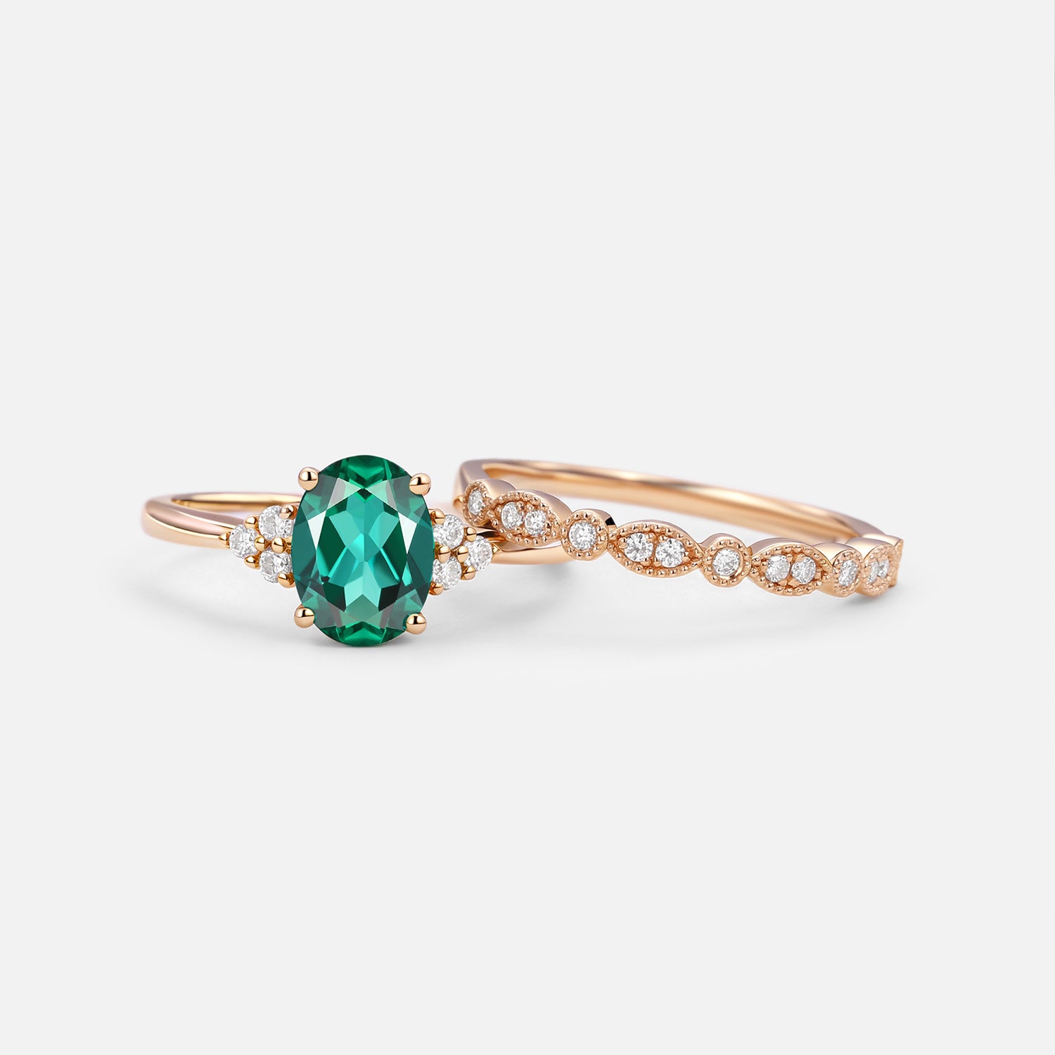 1.5ct Lab Emerald Oval Cut Yellow Gold Ring Set 2pcs - Elora