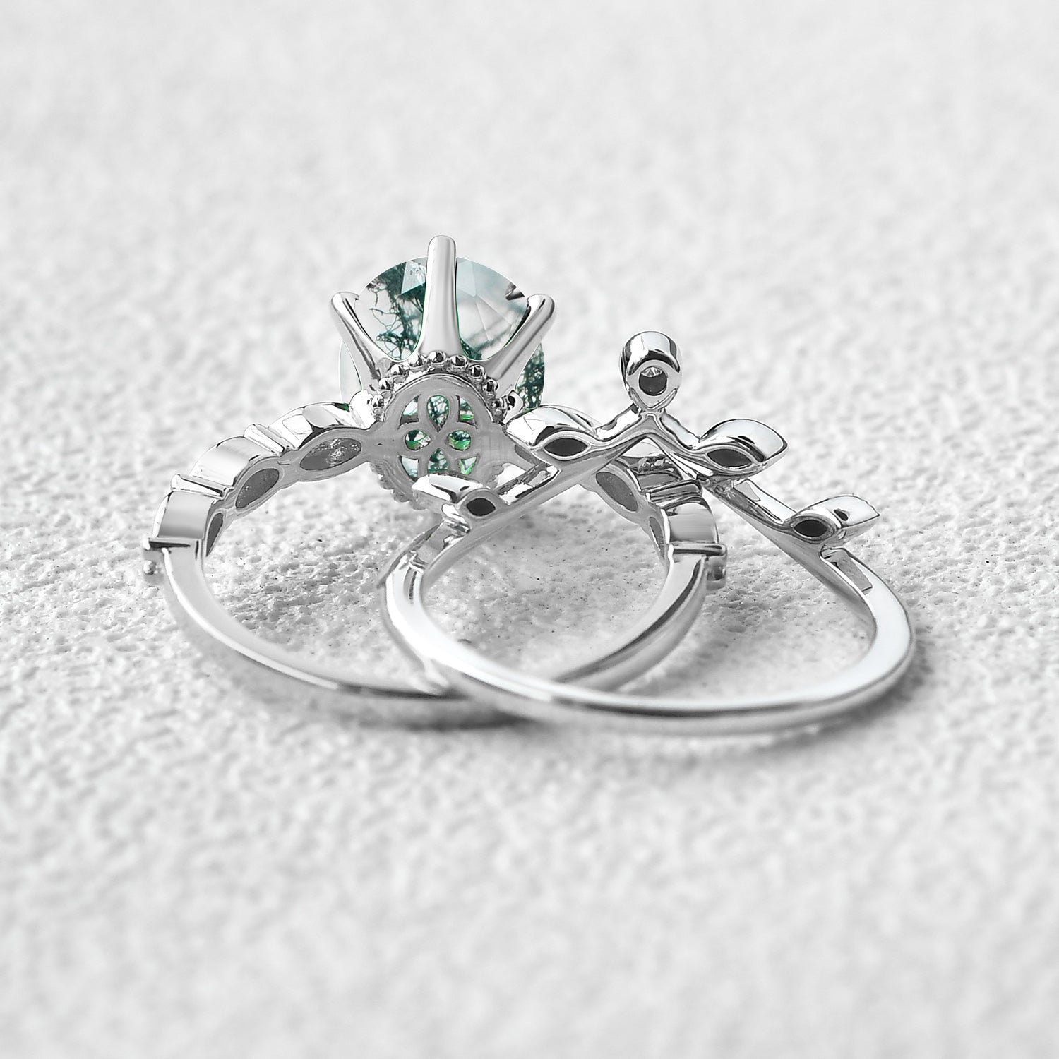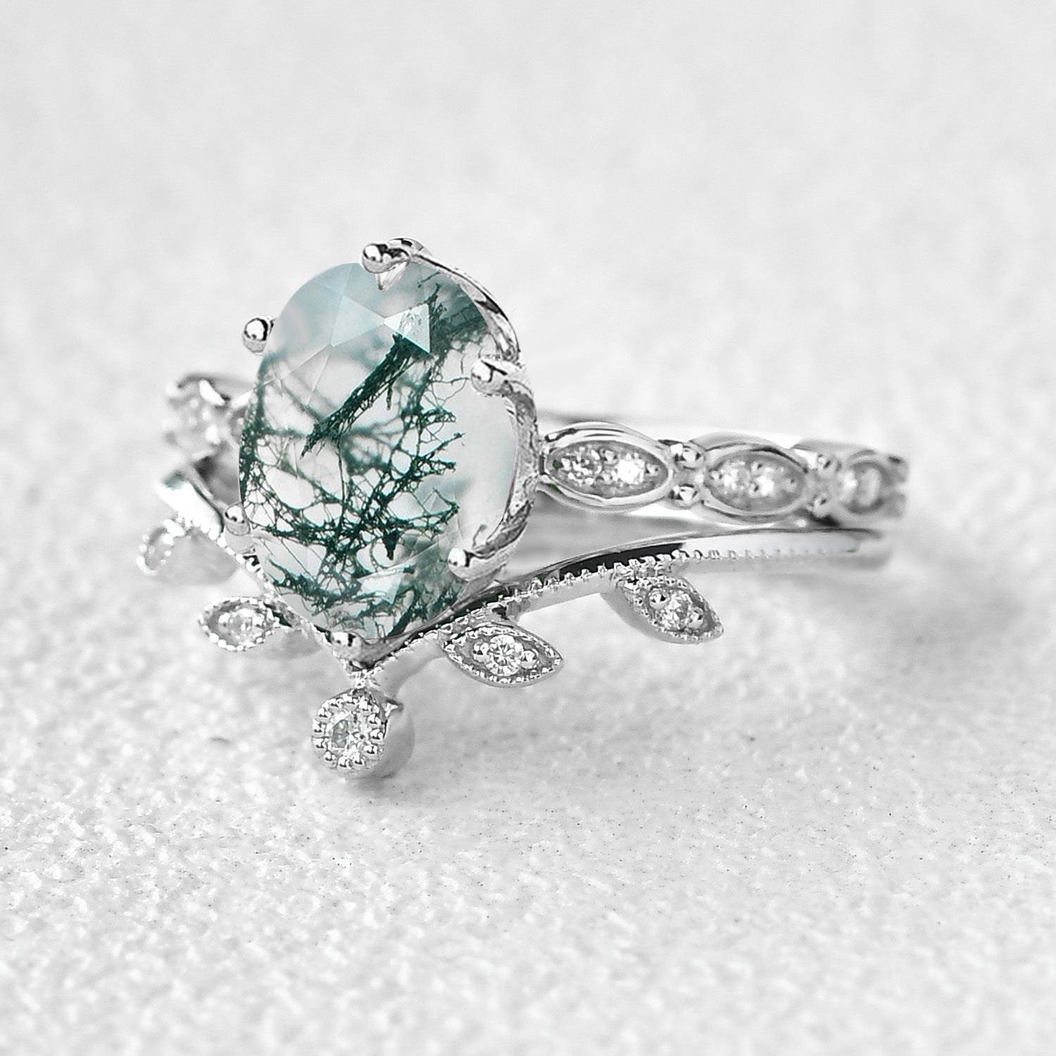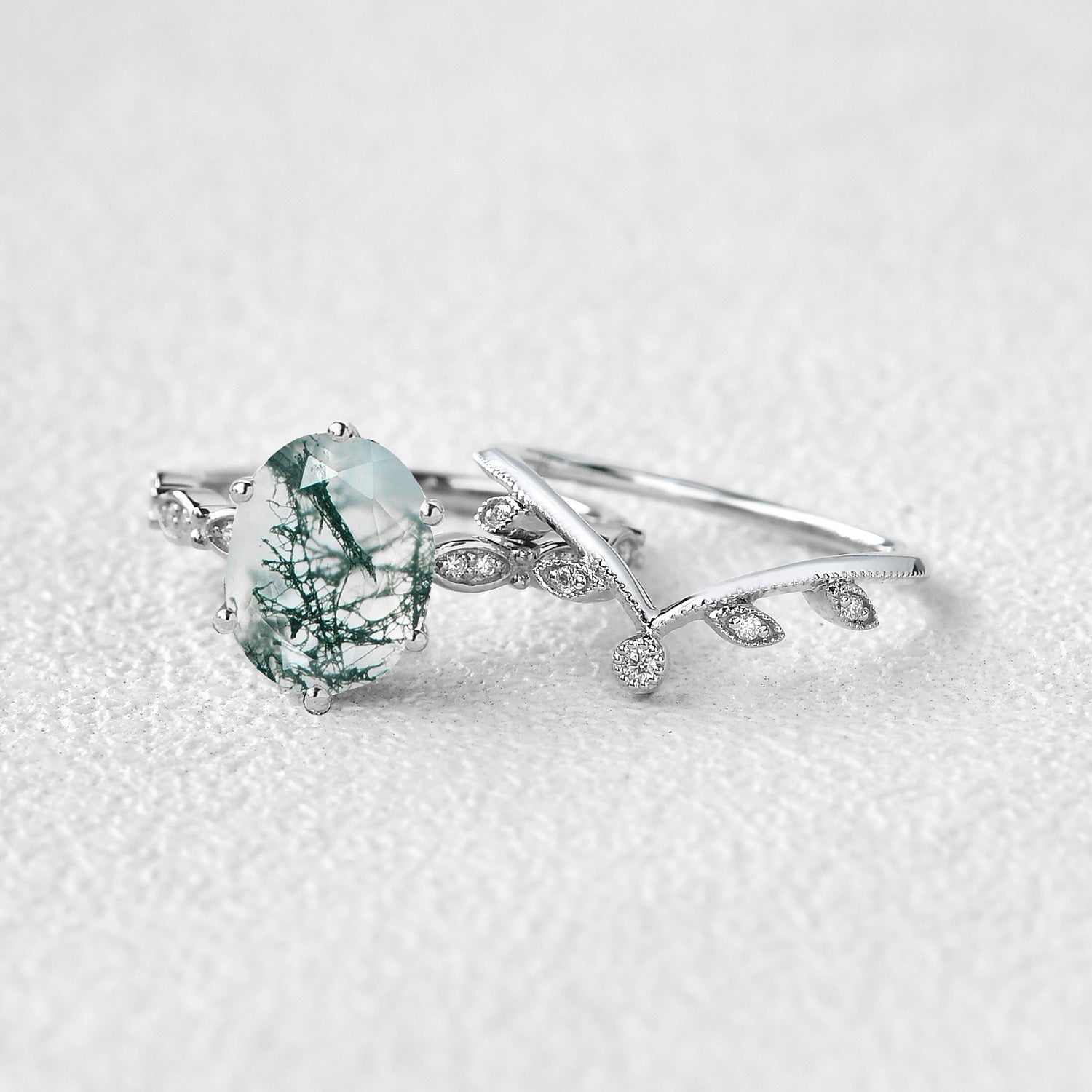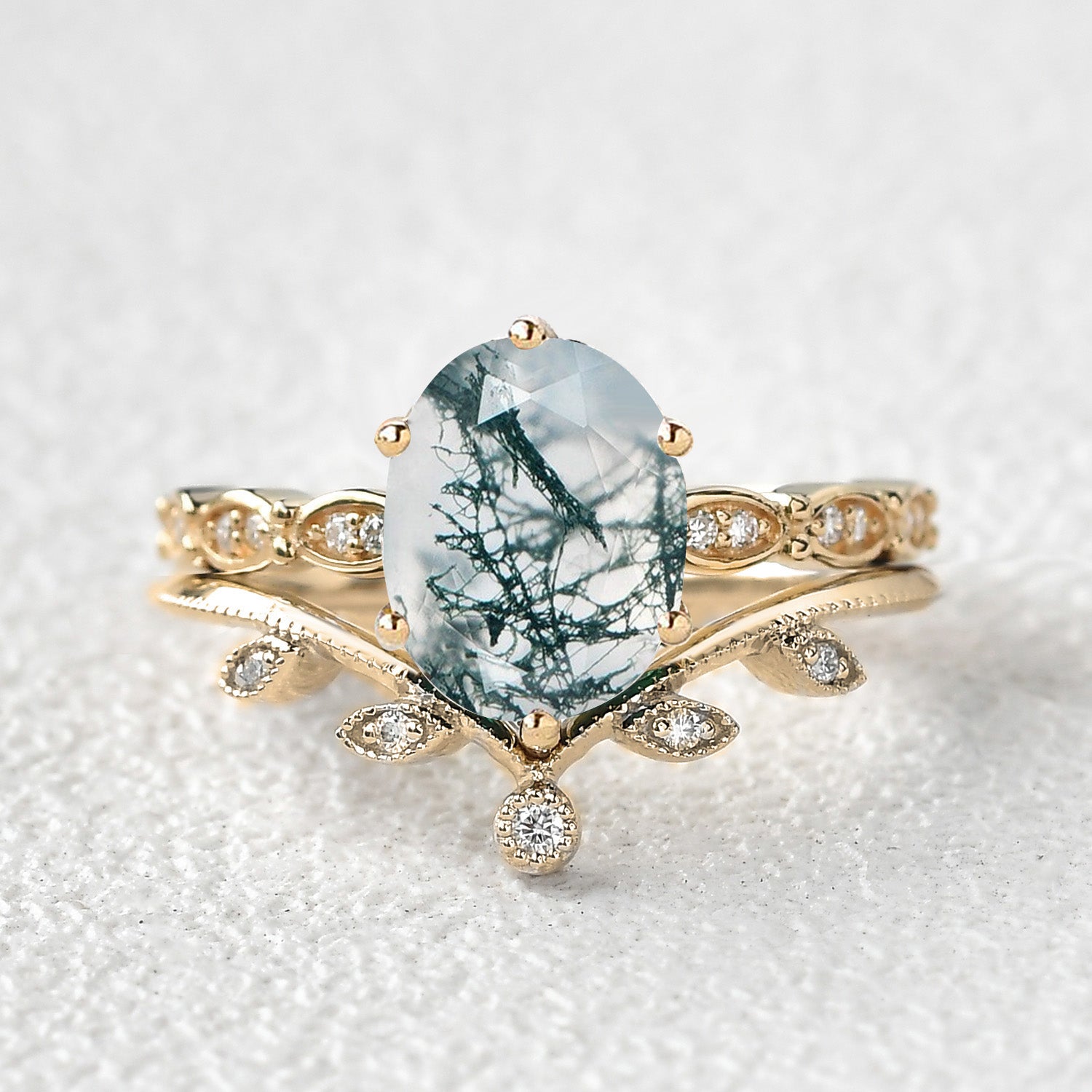 2.0ct Oval Cut Moss Agate Rose Gold Vine Leafy Ring Set 2pcs