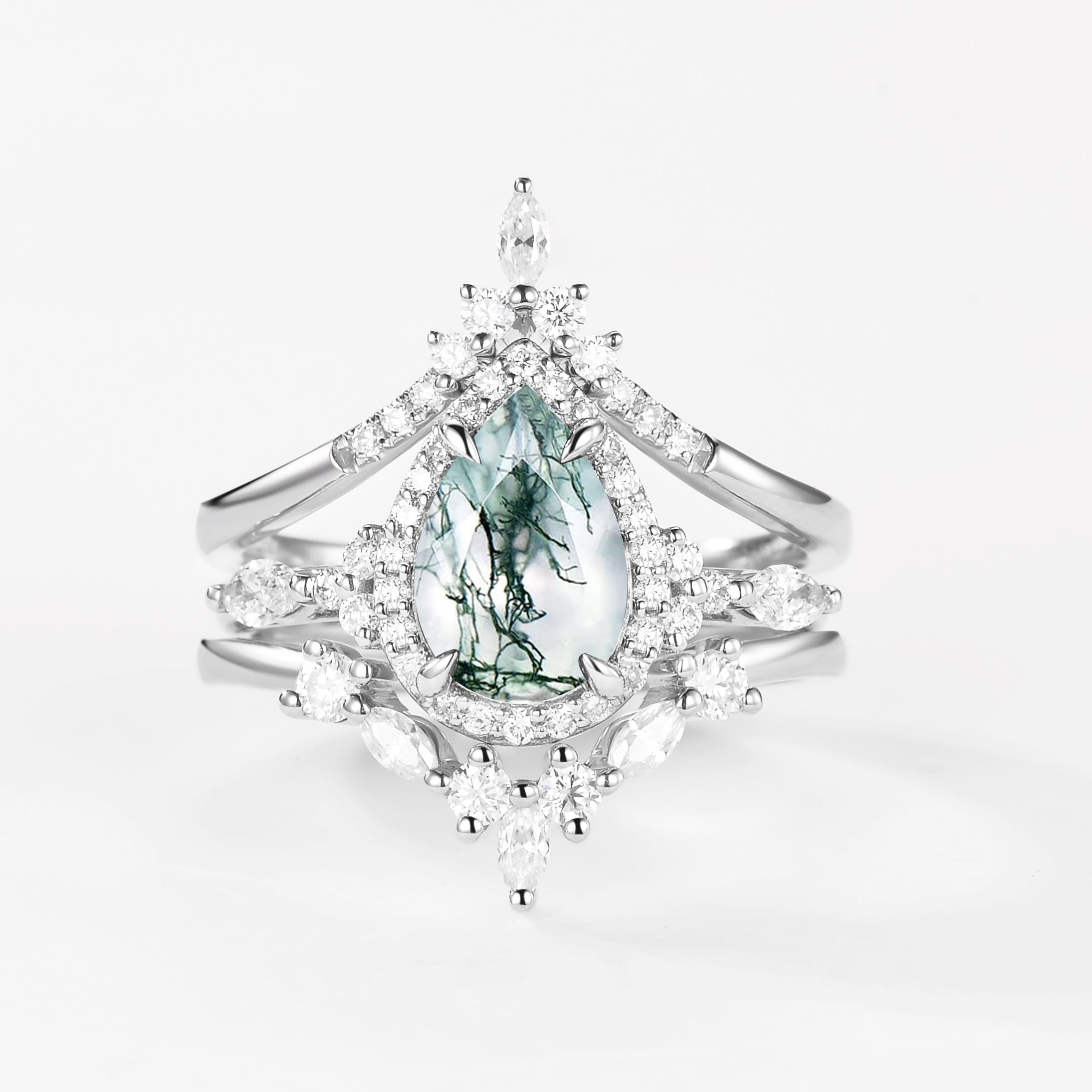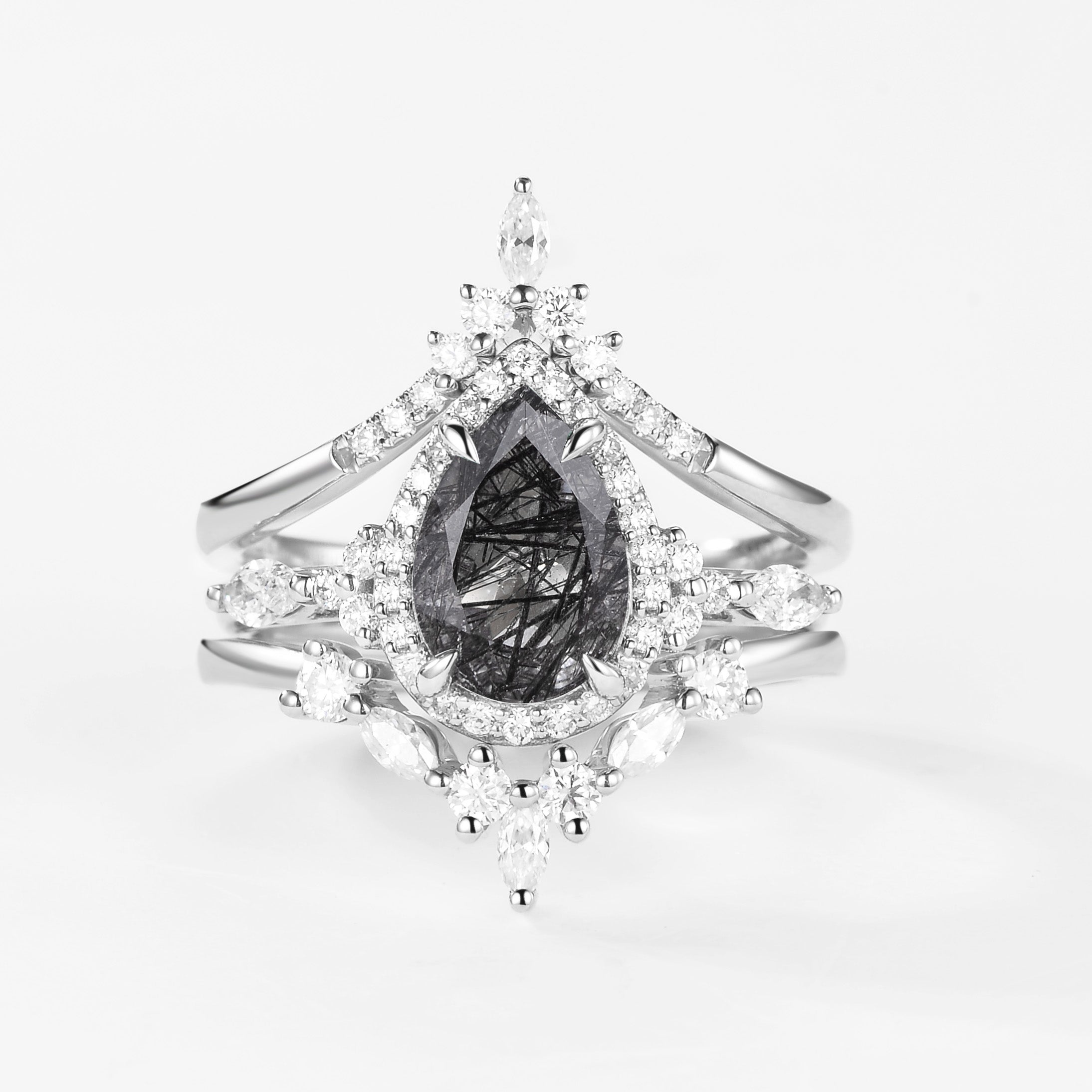 Felicegals 1.5ct Pear Shaped Black Rutilated Quartz Gold Ring Set 3pcs Marquise Moissanite Ring Custom Curved Band Halo Ring