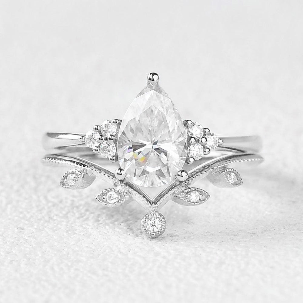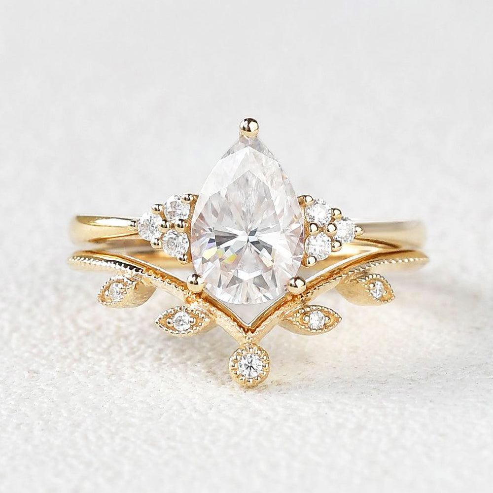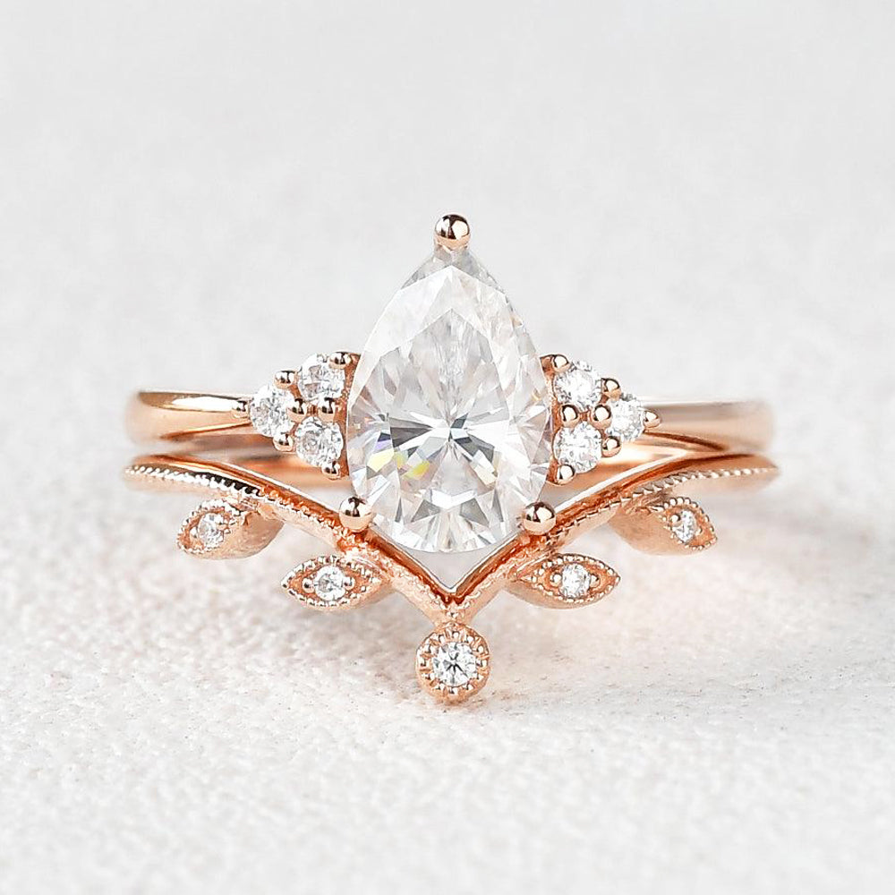 Felicegals Pear Shaped Moss Agate Leafy Rose Gold Ring Set 2pcs Chevron Moissanite Stacking Wedding Band Custom Curved Matching Ring Anniversary Gift For Her