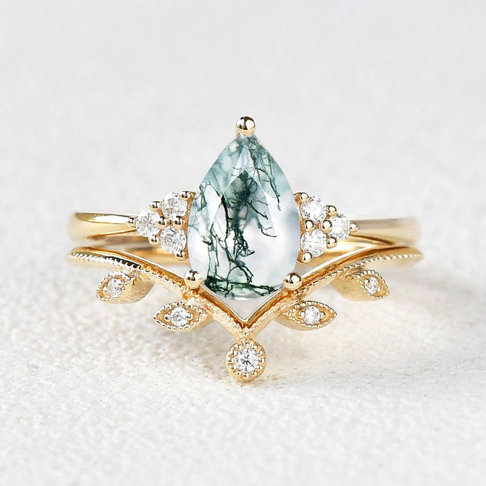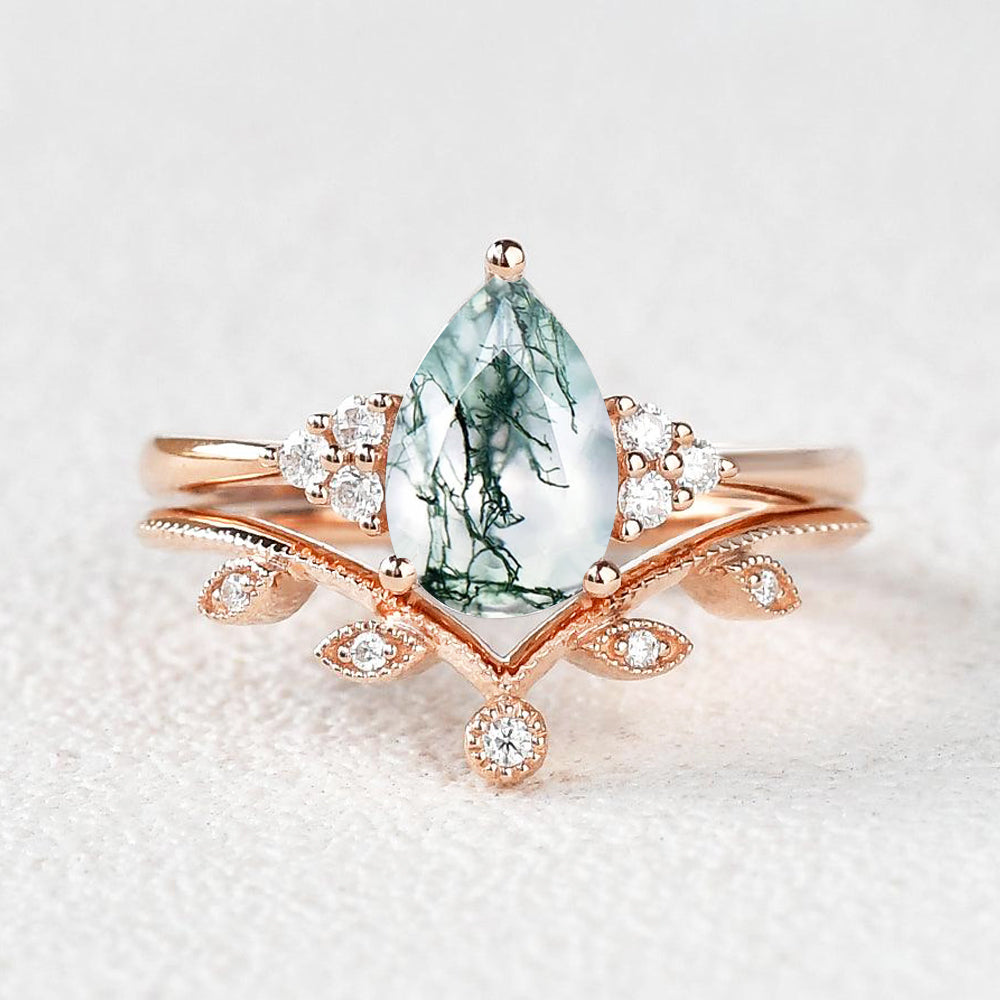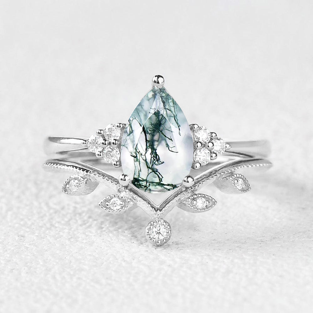 1.5ct Pear Moss Agate Leafy Ring Set 2pcs