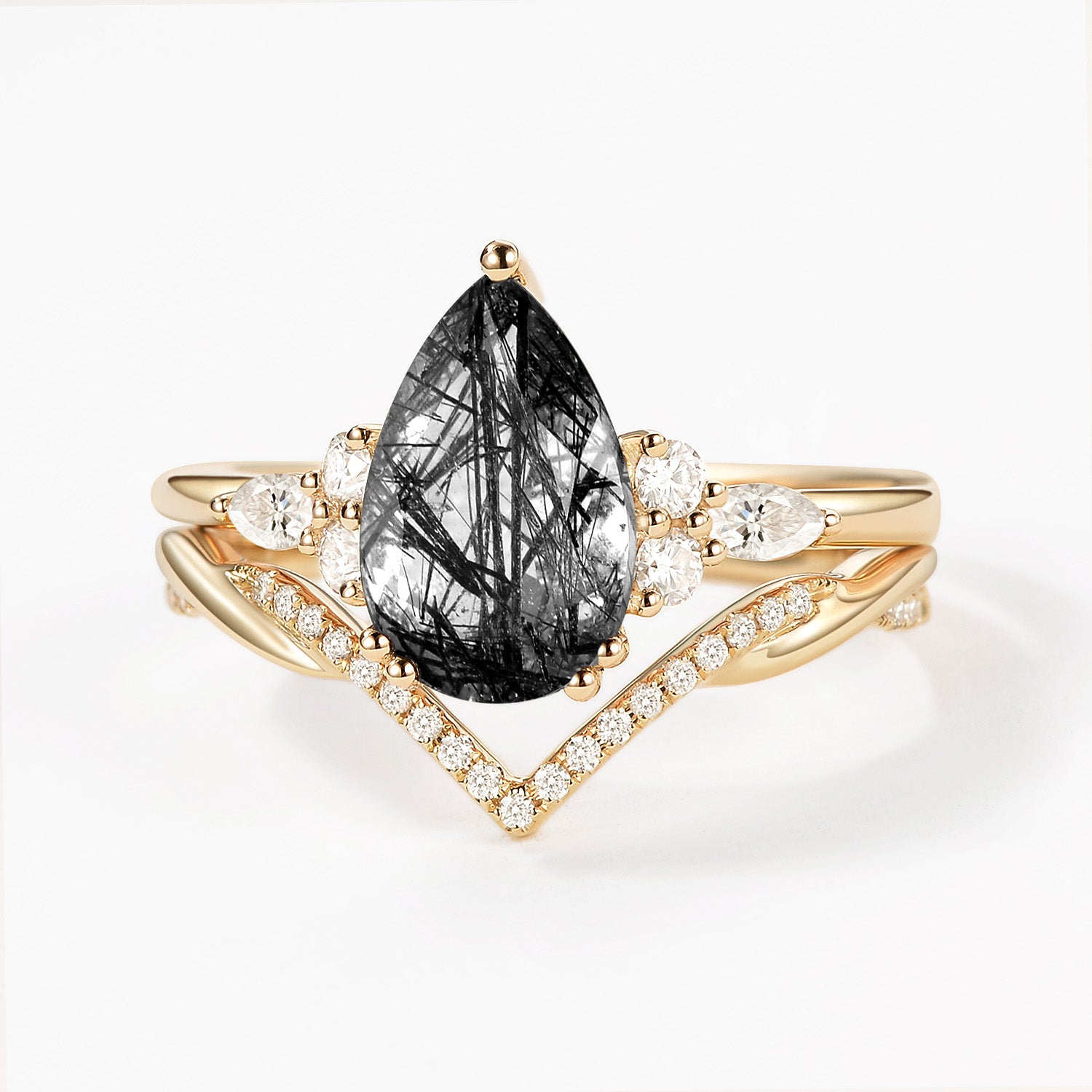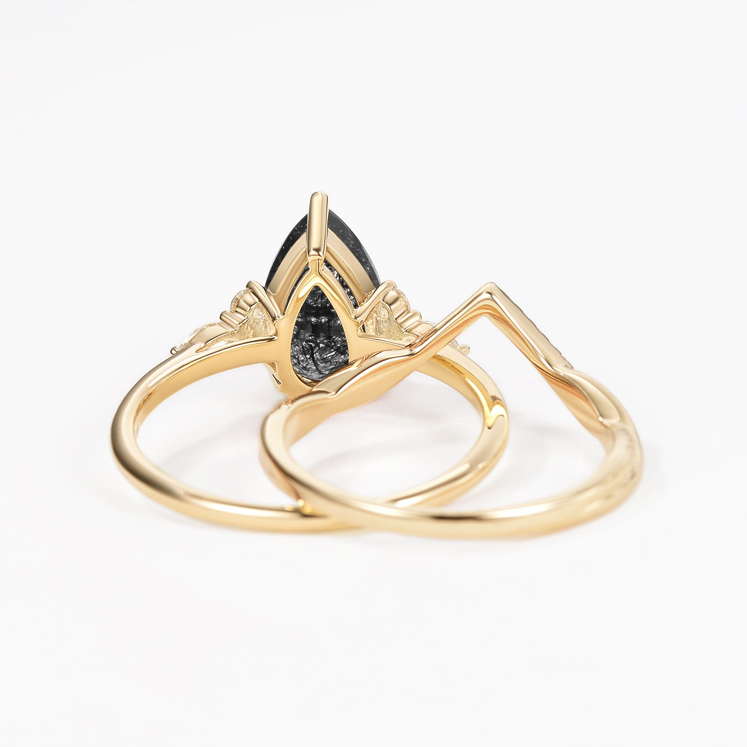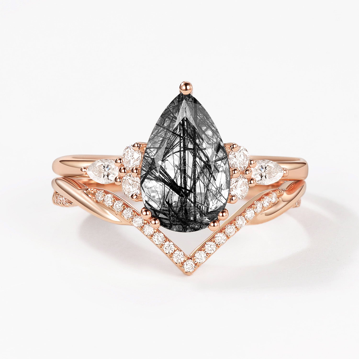 2.0CT Pear Shaped Black Rutilated Quartz Infinity Stacking Ring Set 2pcs