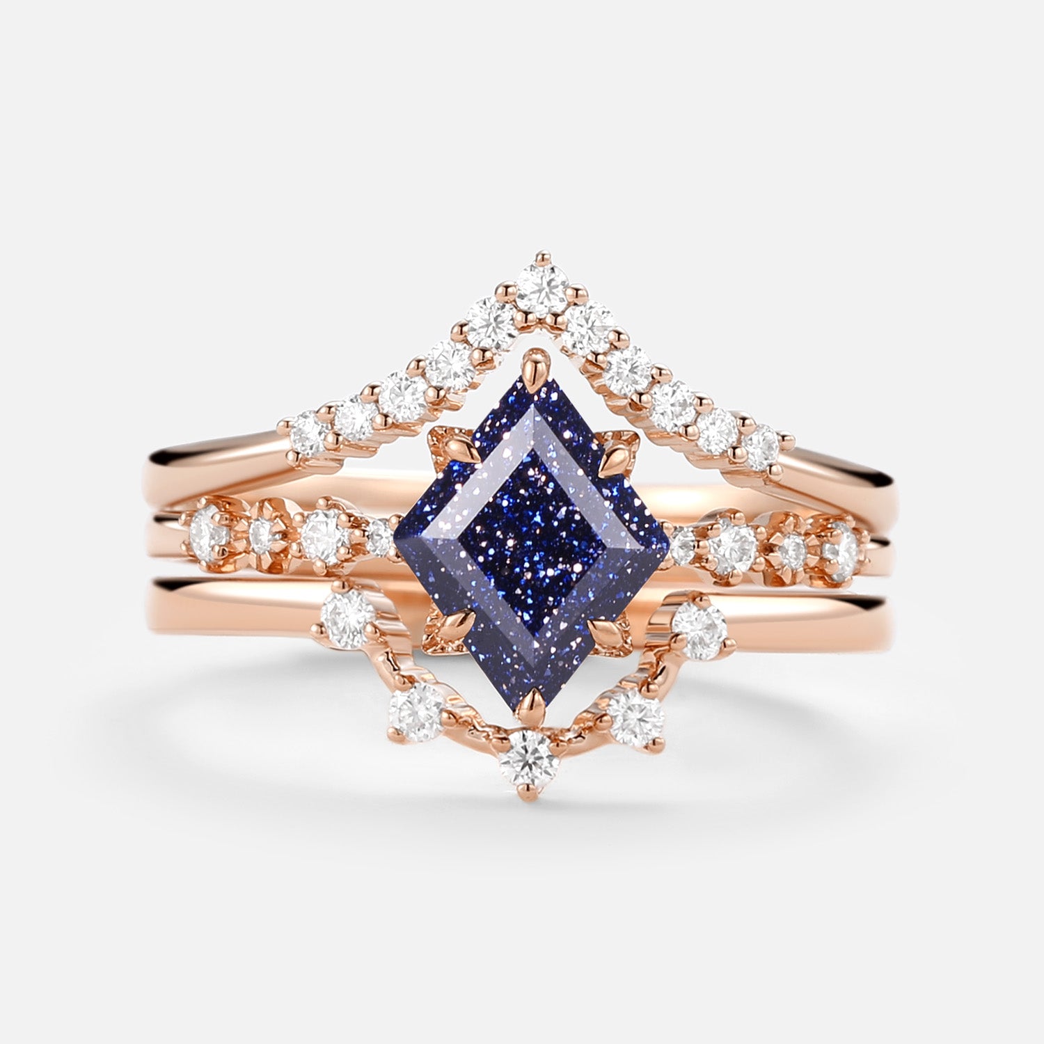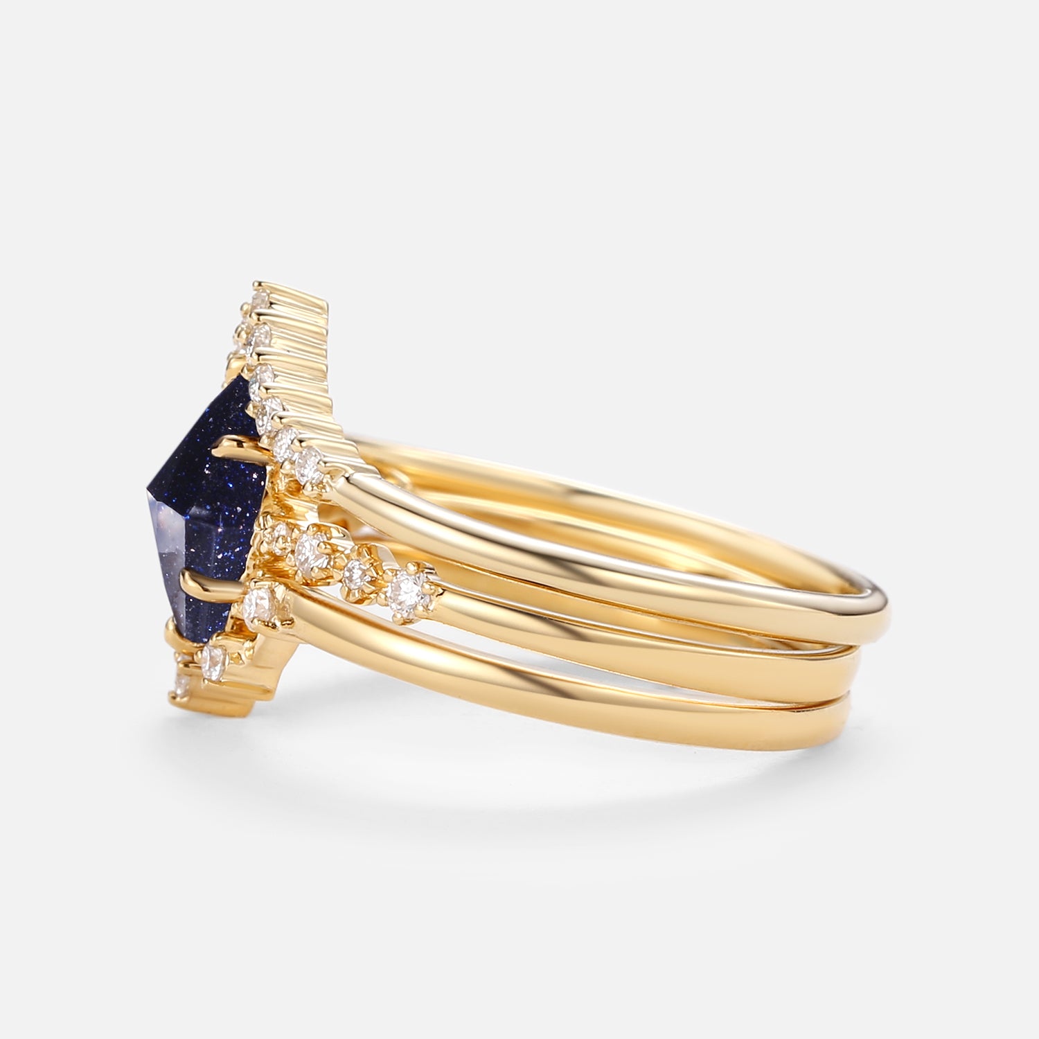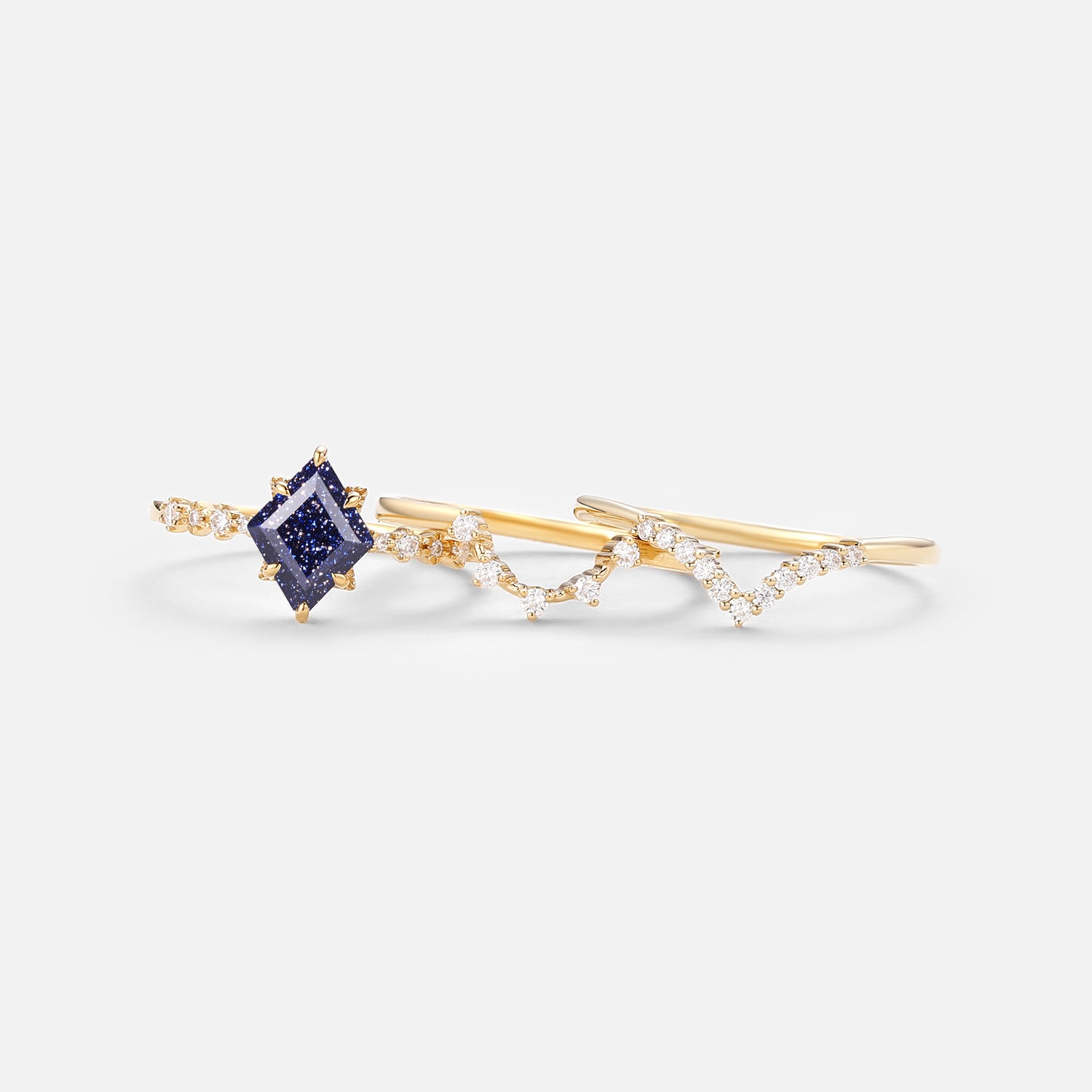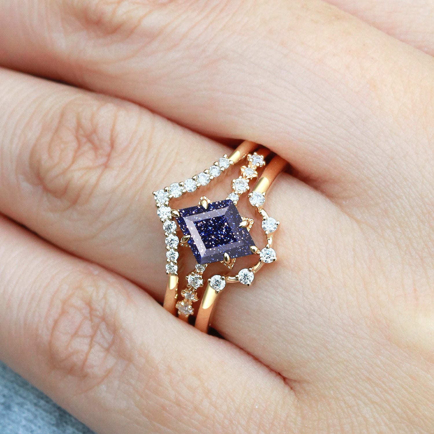 Felicegals 6*8mm Polygon Blue Sandstone & Moissanite Solid Gold Ring Set 3pcs U Shaped Moissanite Wedding Ring