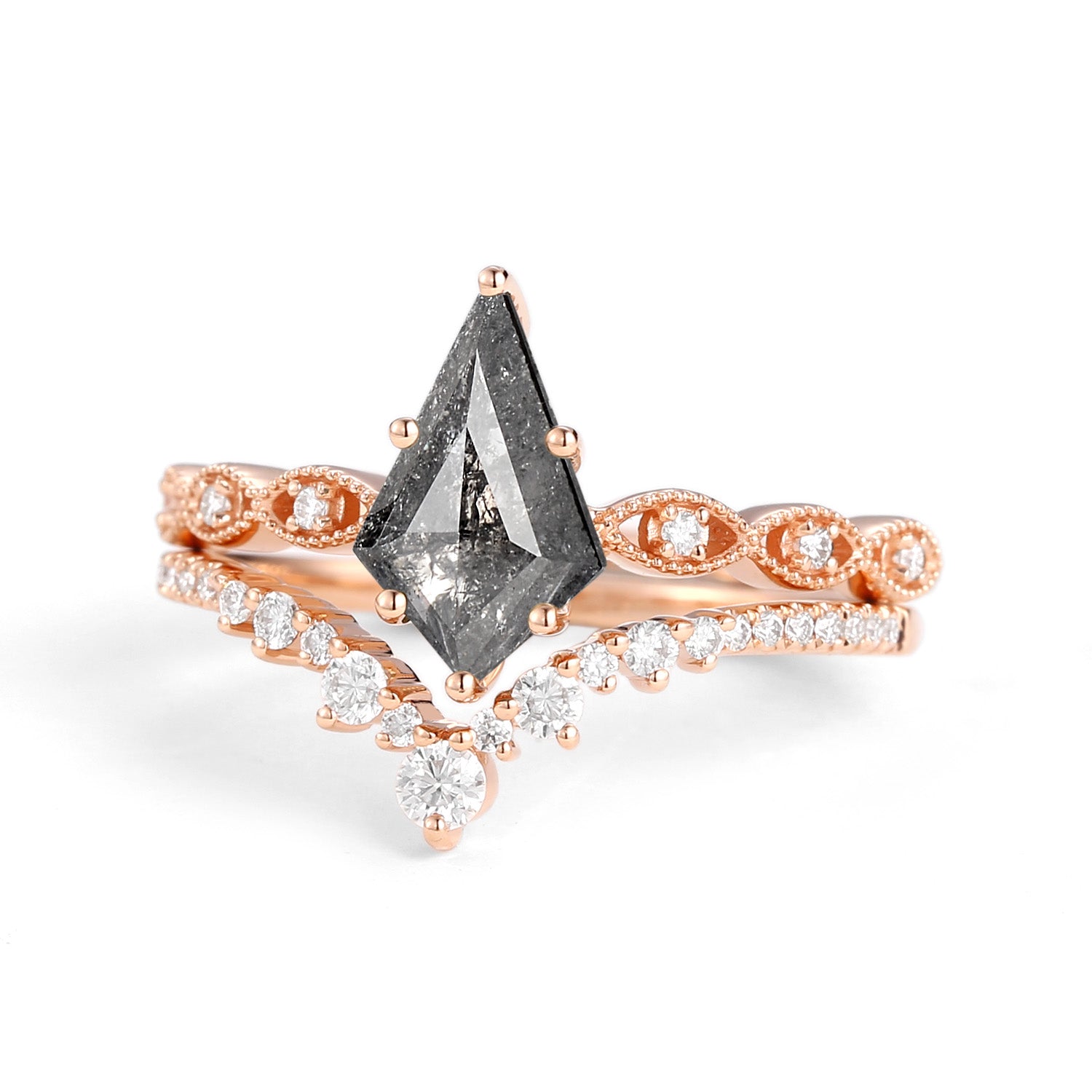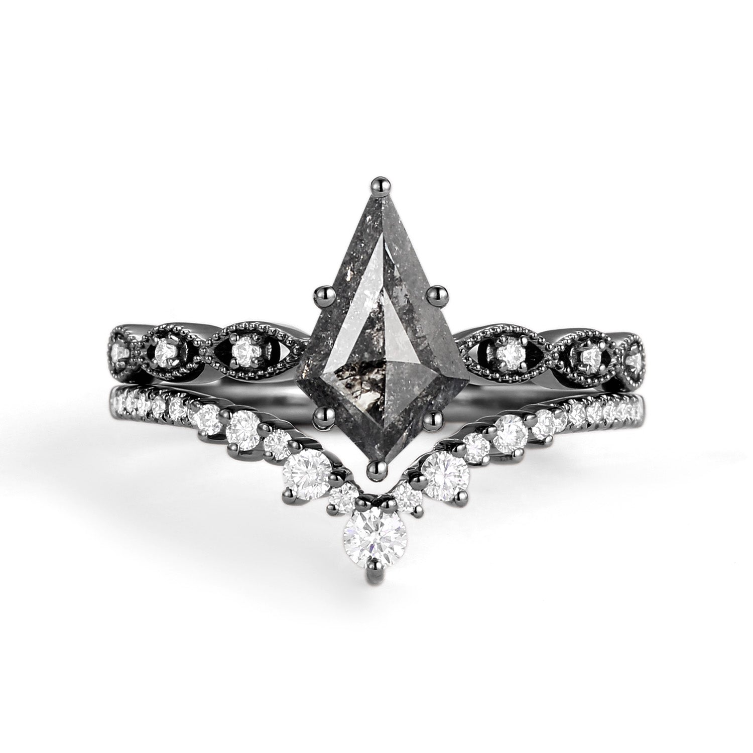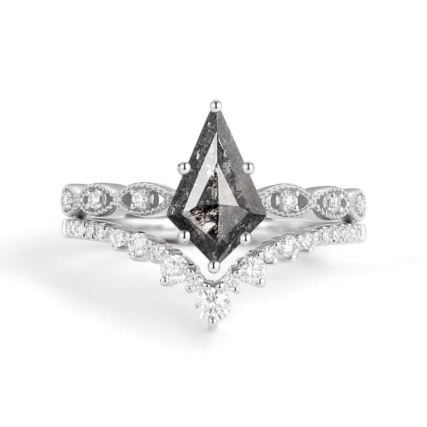 Kite Cut Salt and Pepper Diamonds Vintage Engagement Ring Set 2pcs - Winona