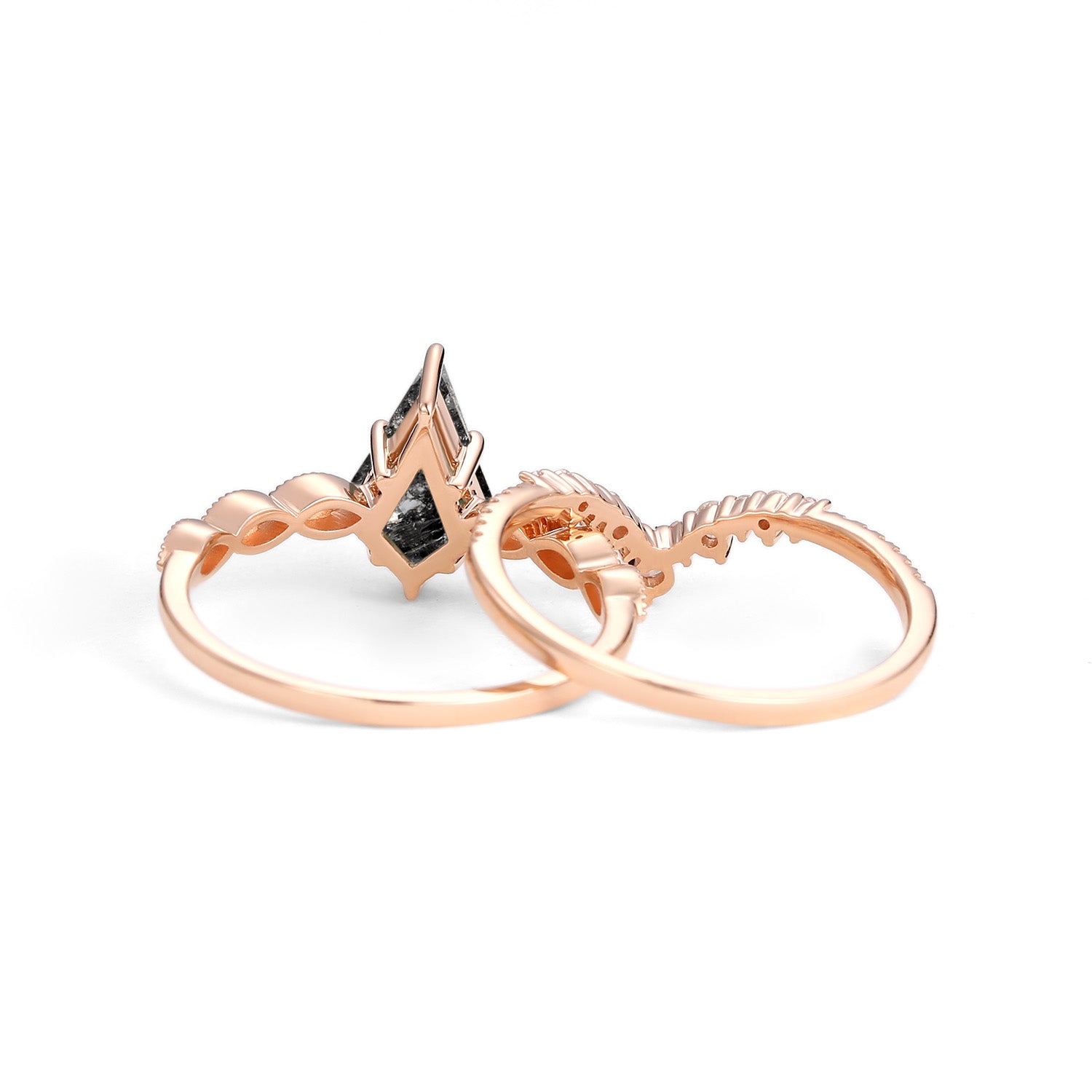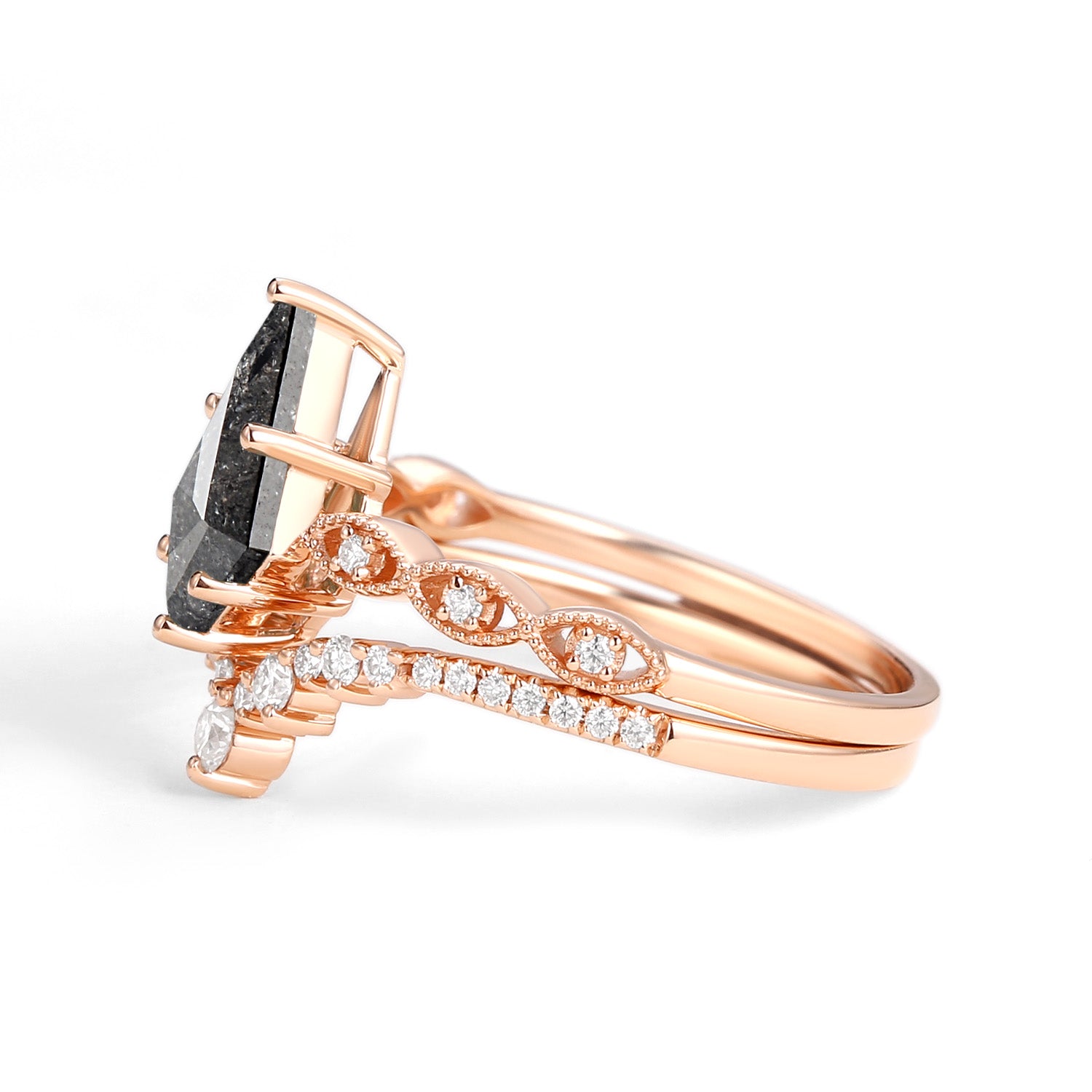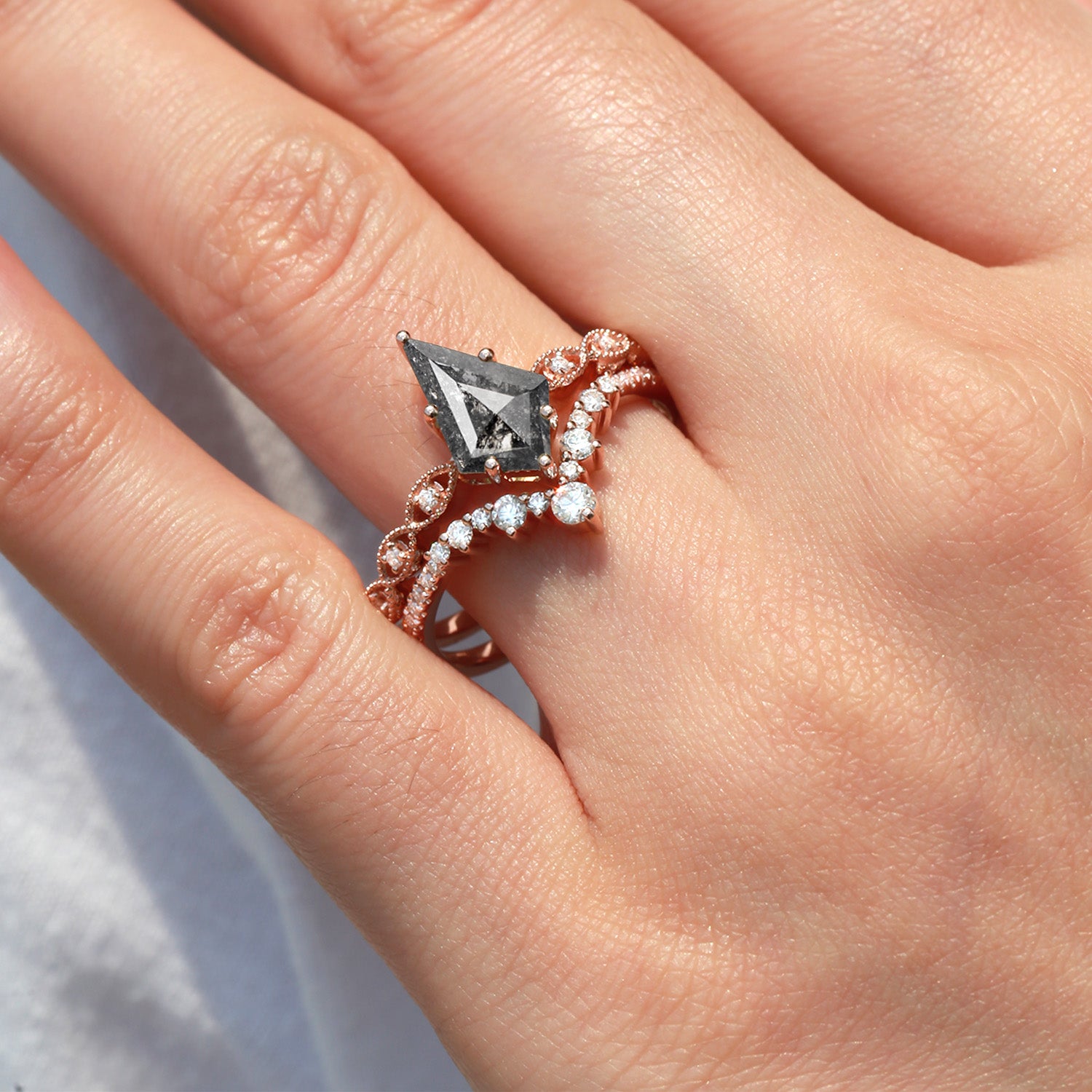 Kite Cut Salt and Pepper Diamonds Vintage Engagement Ring Set 2pcs - Winona