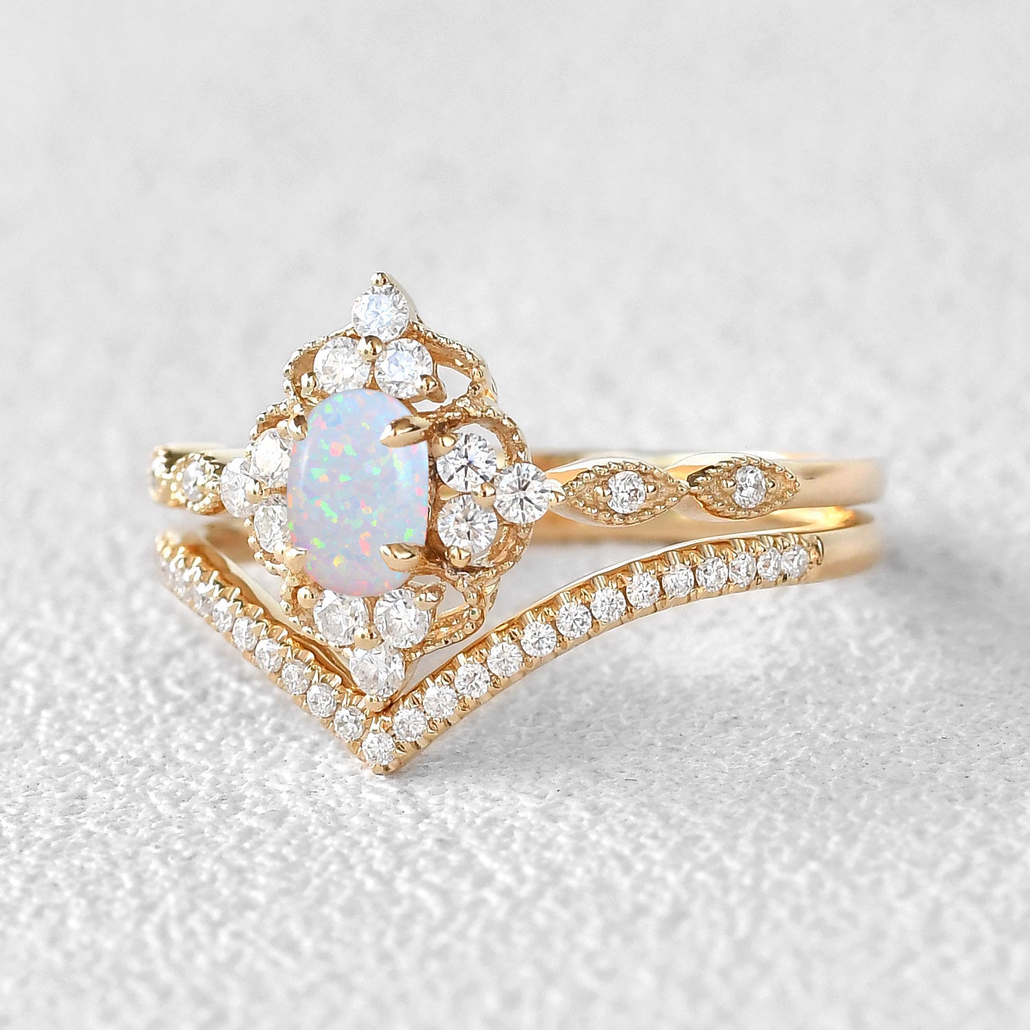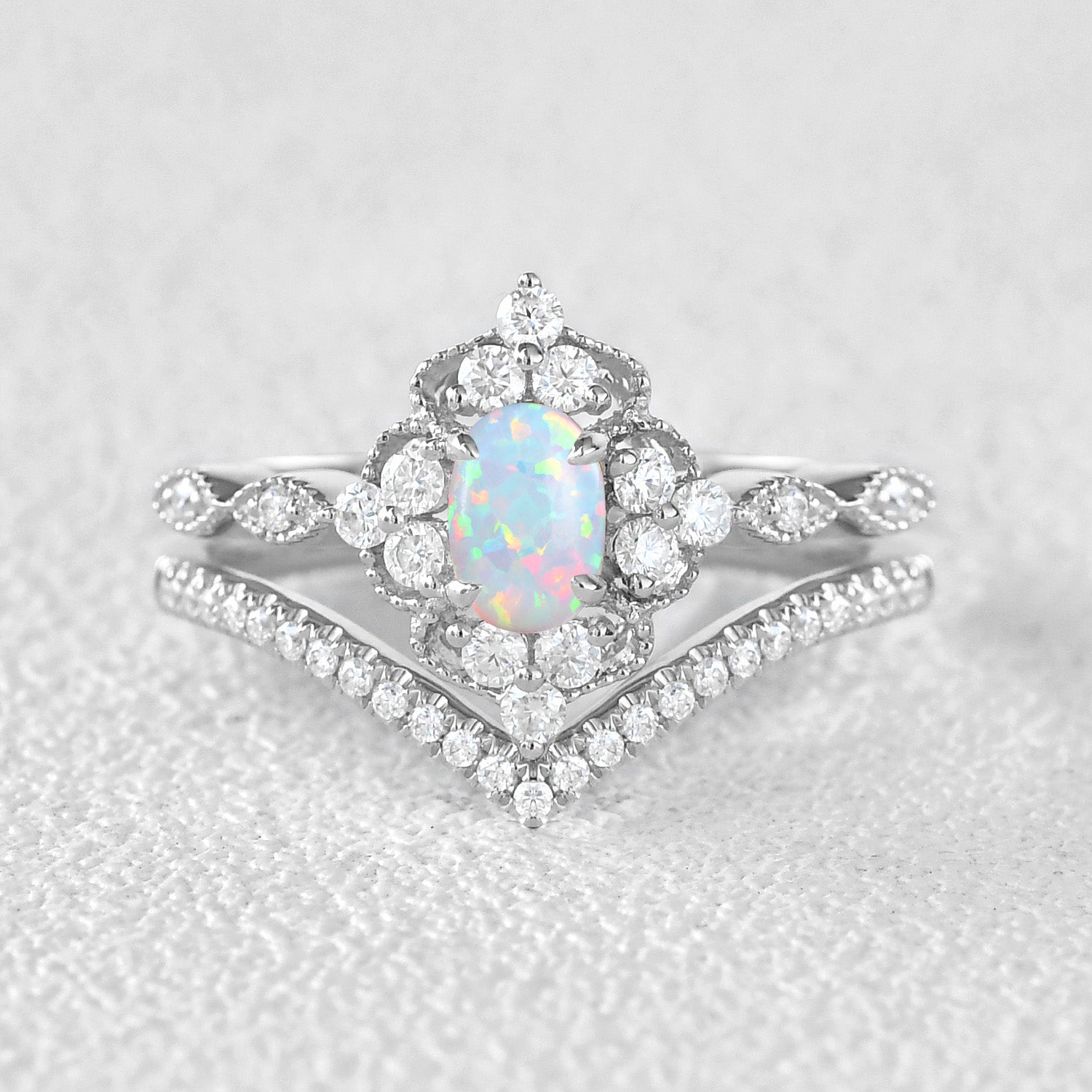 Felicegals Lab Opal & Moissanite Vintage Inspired Engagement Ring Set 2pcs Chevron Moissanite Stacking Wedding Band Art Deco Bridal Anniversary Gift Promise Vintage Inspired Style