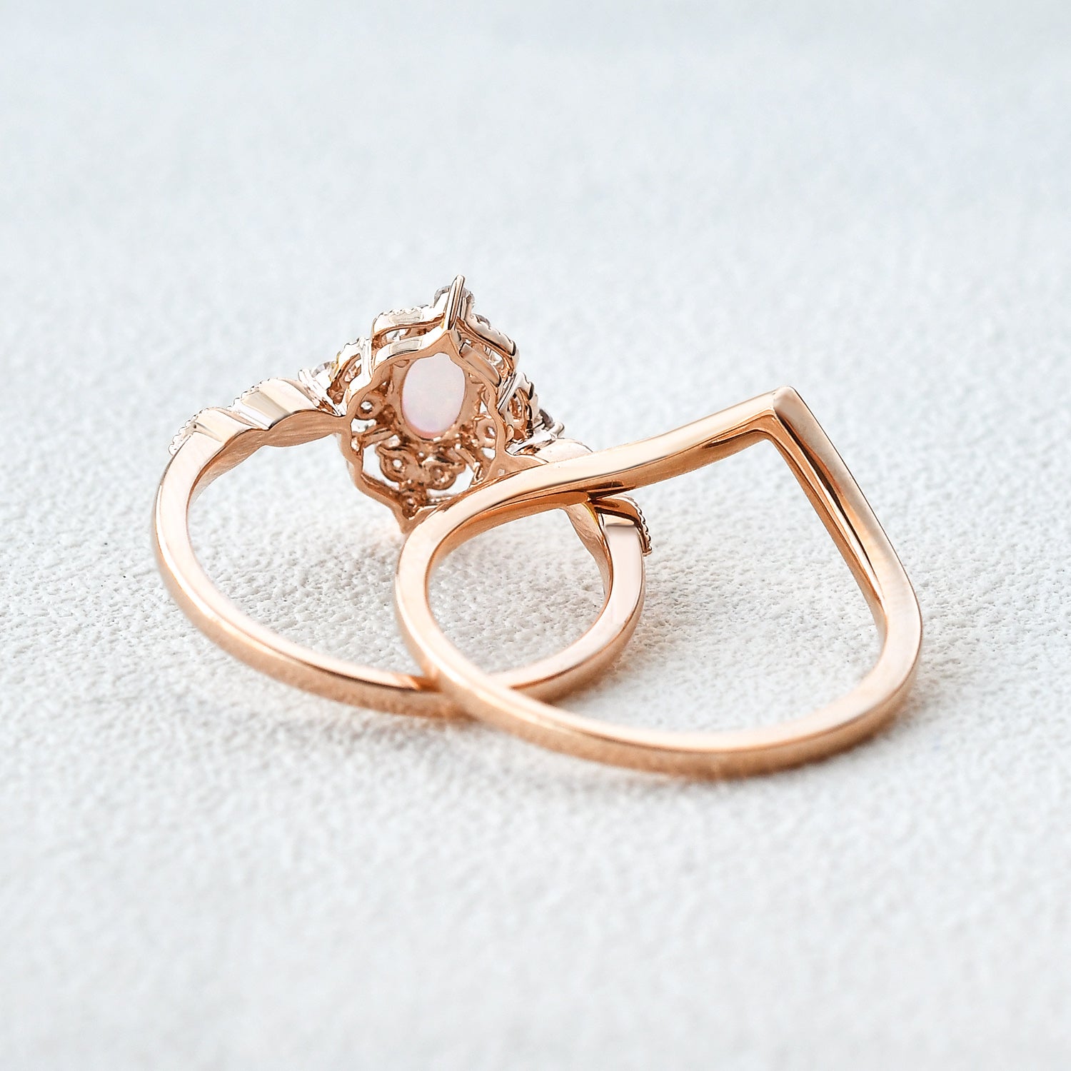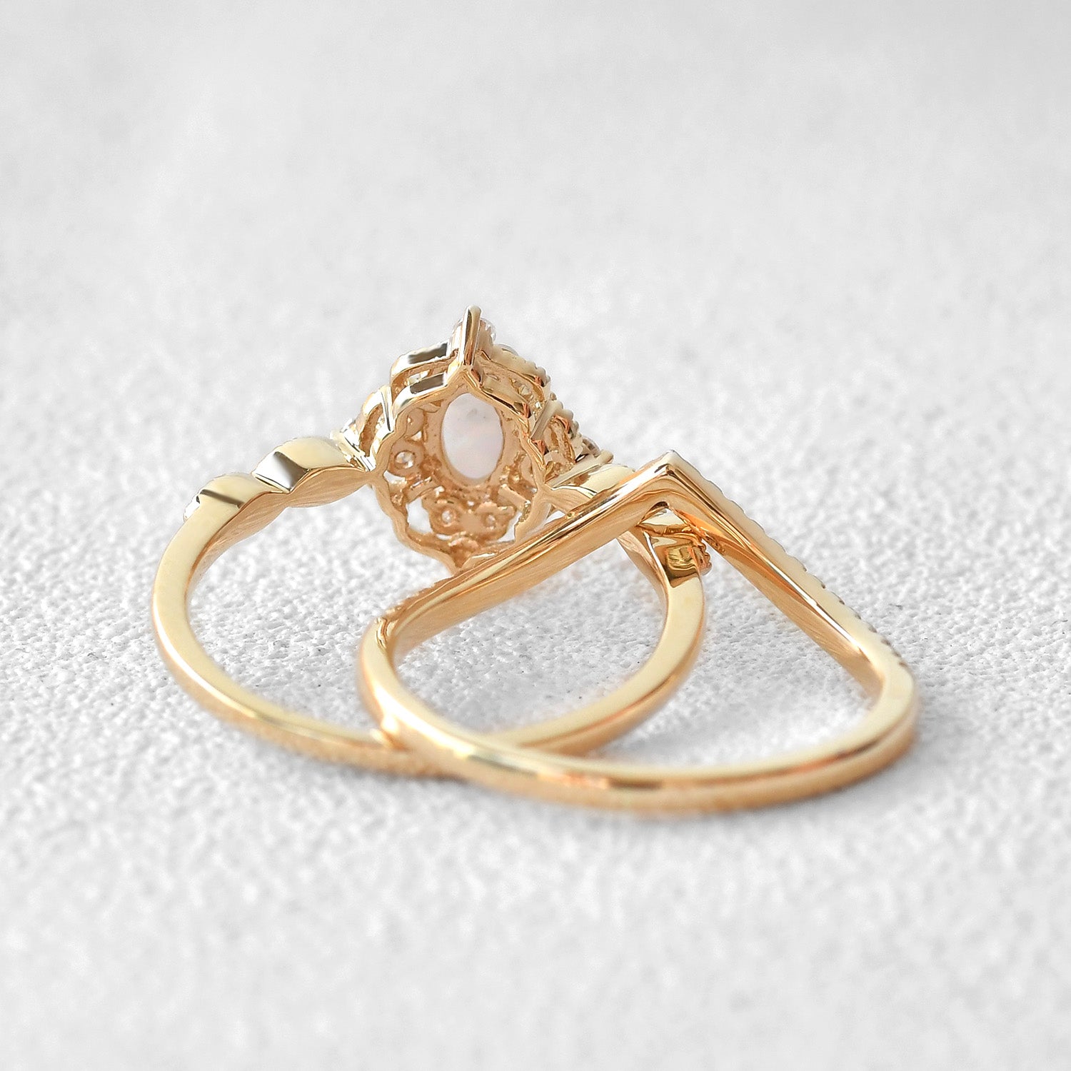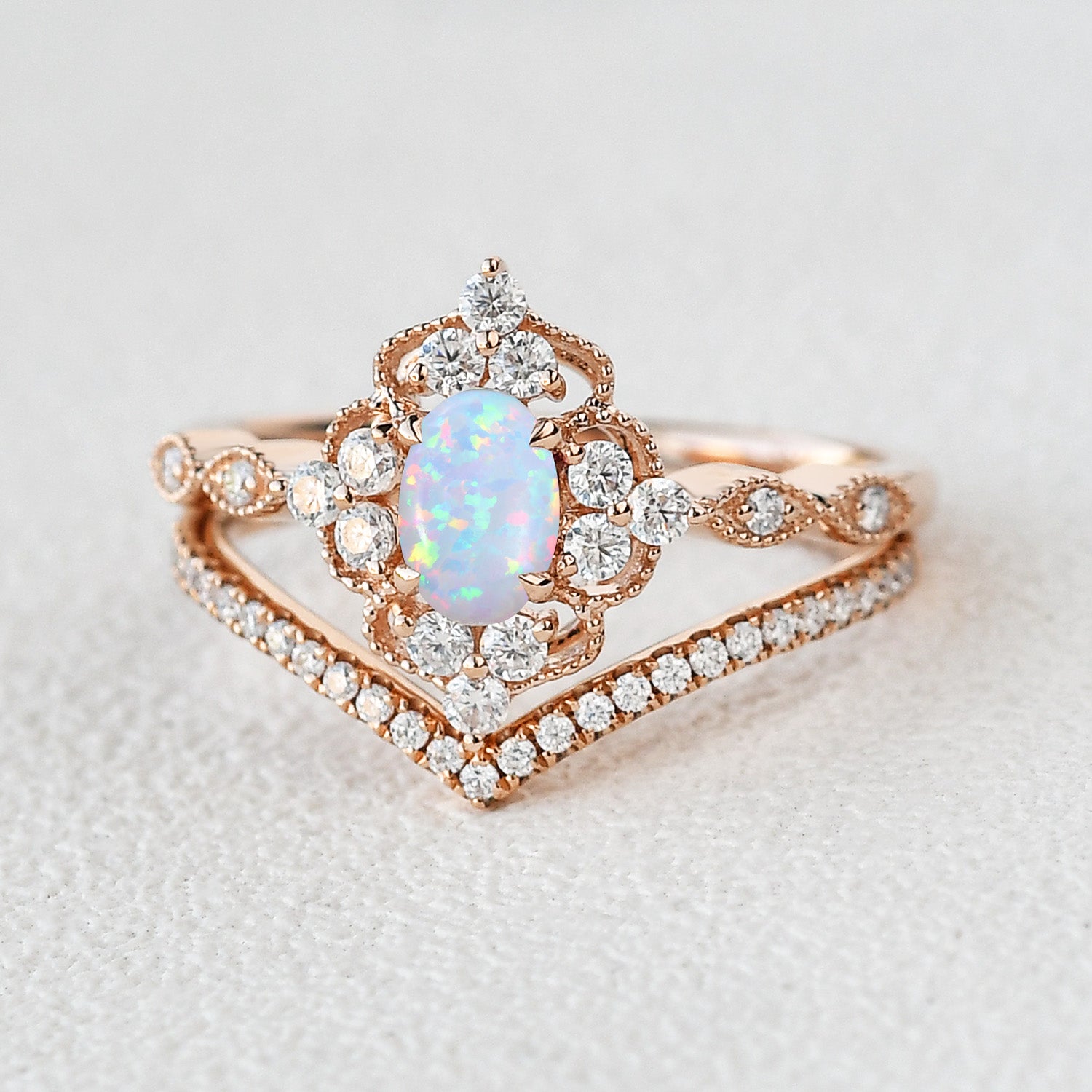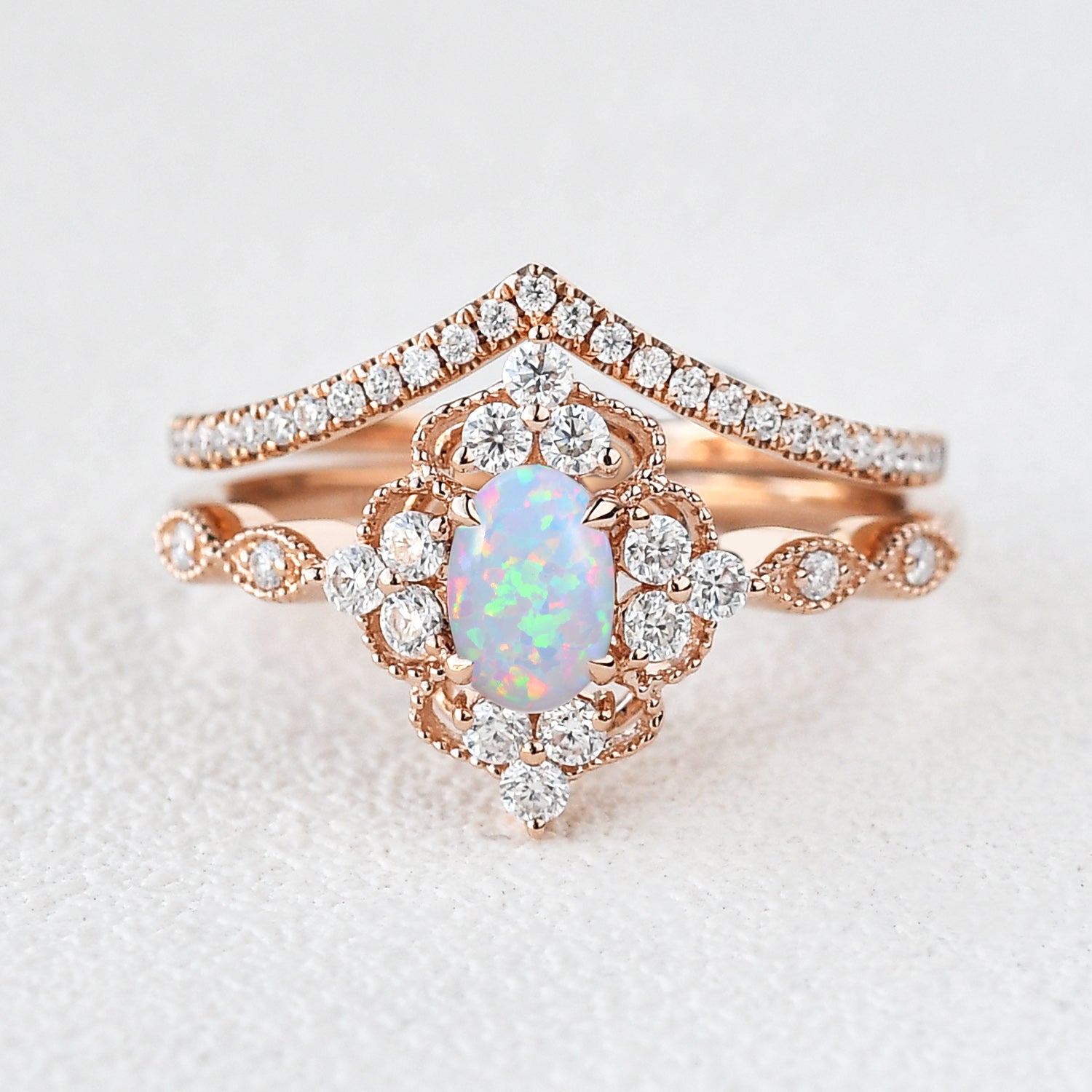 Oval Lab Opal & Moissanite Vintage Inspired Ring Set 2pcs