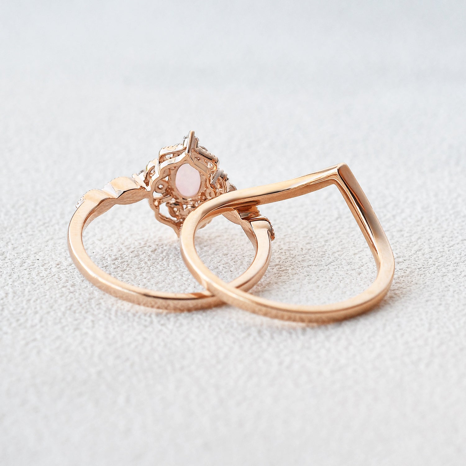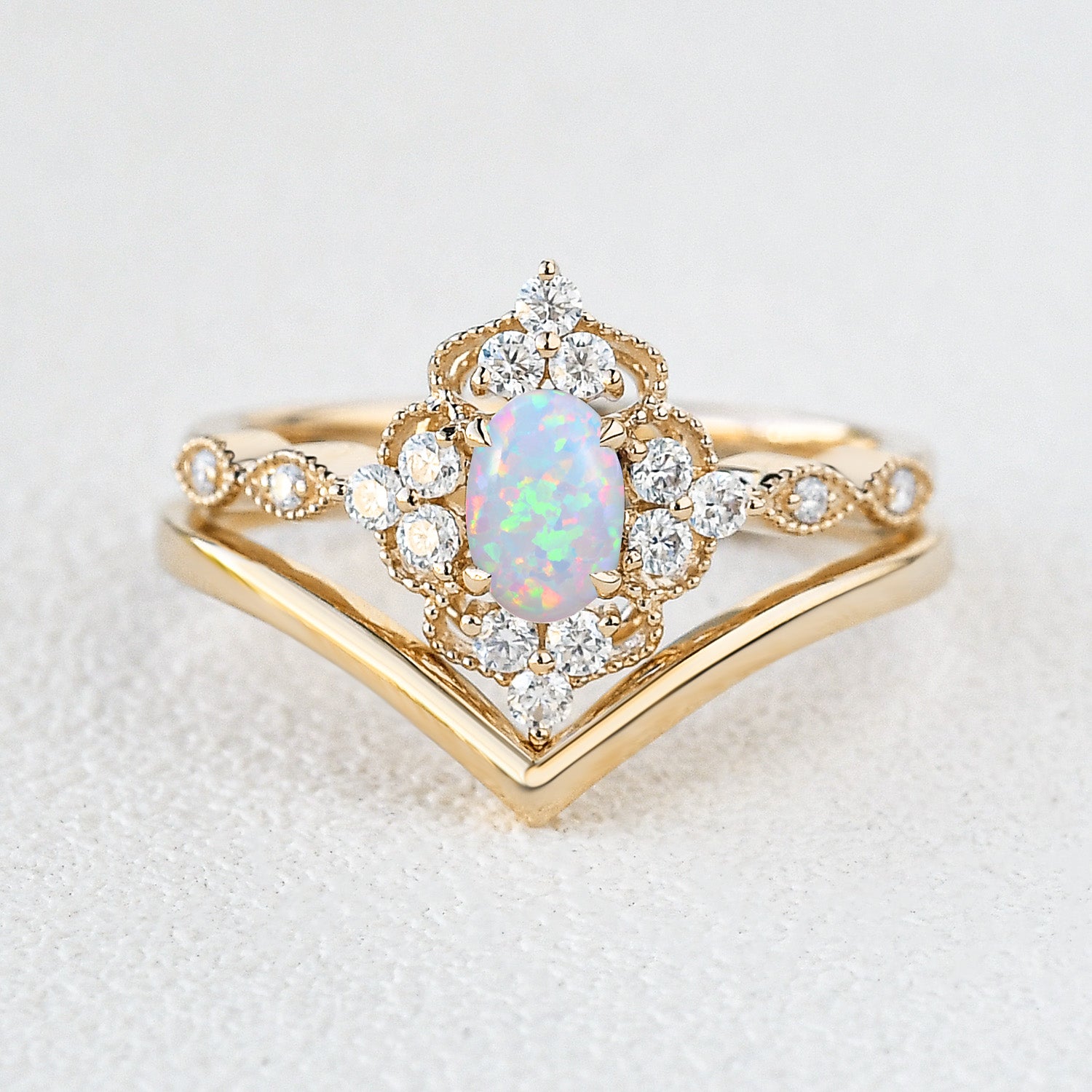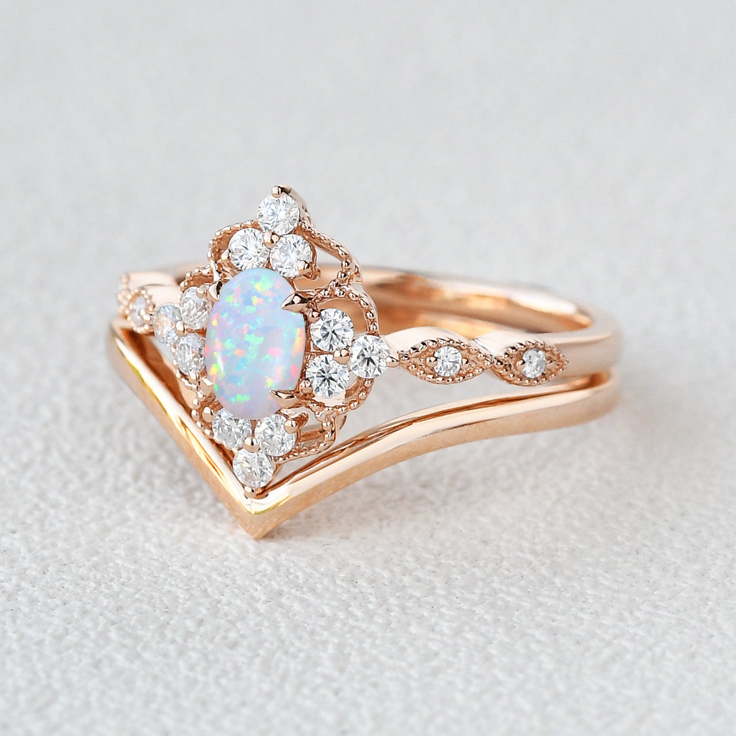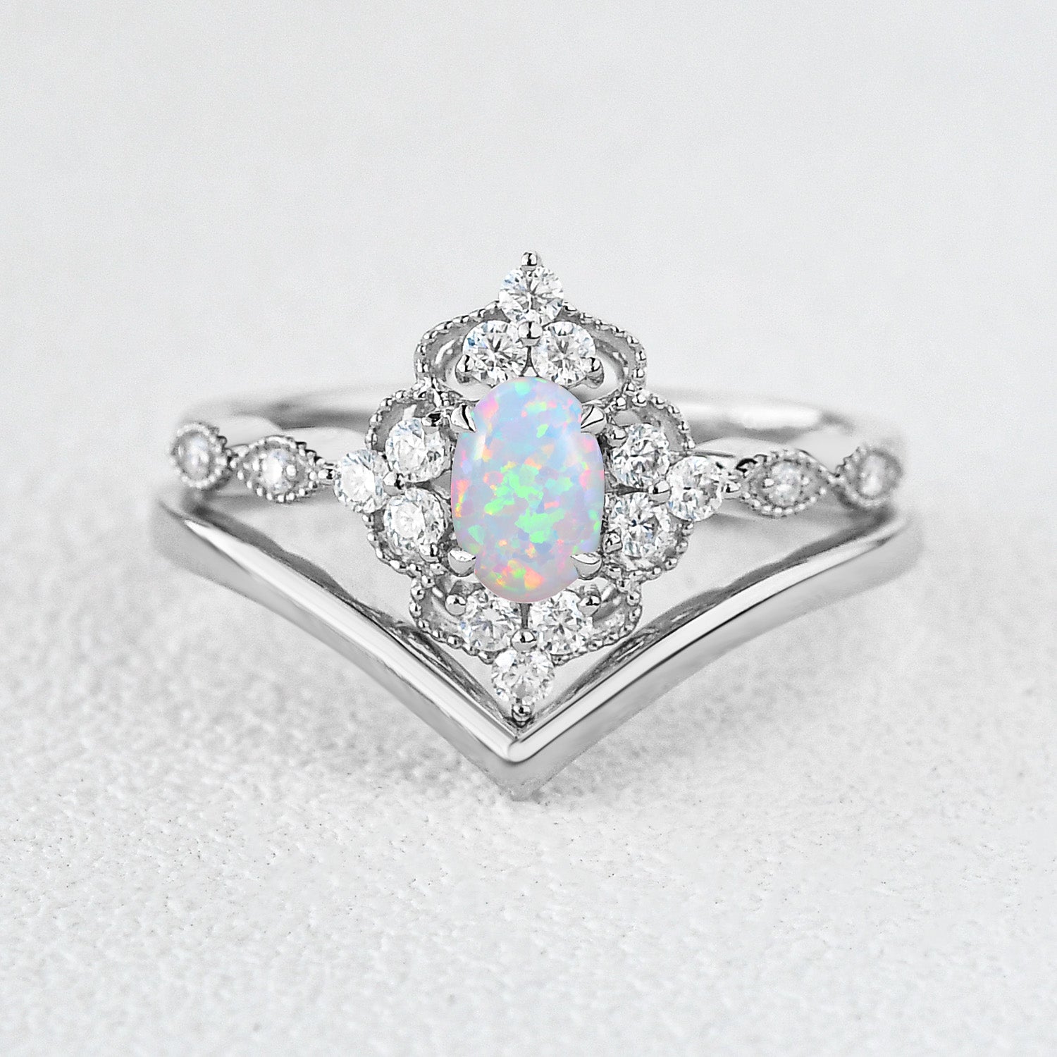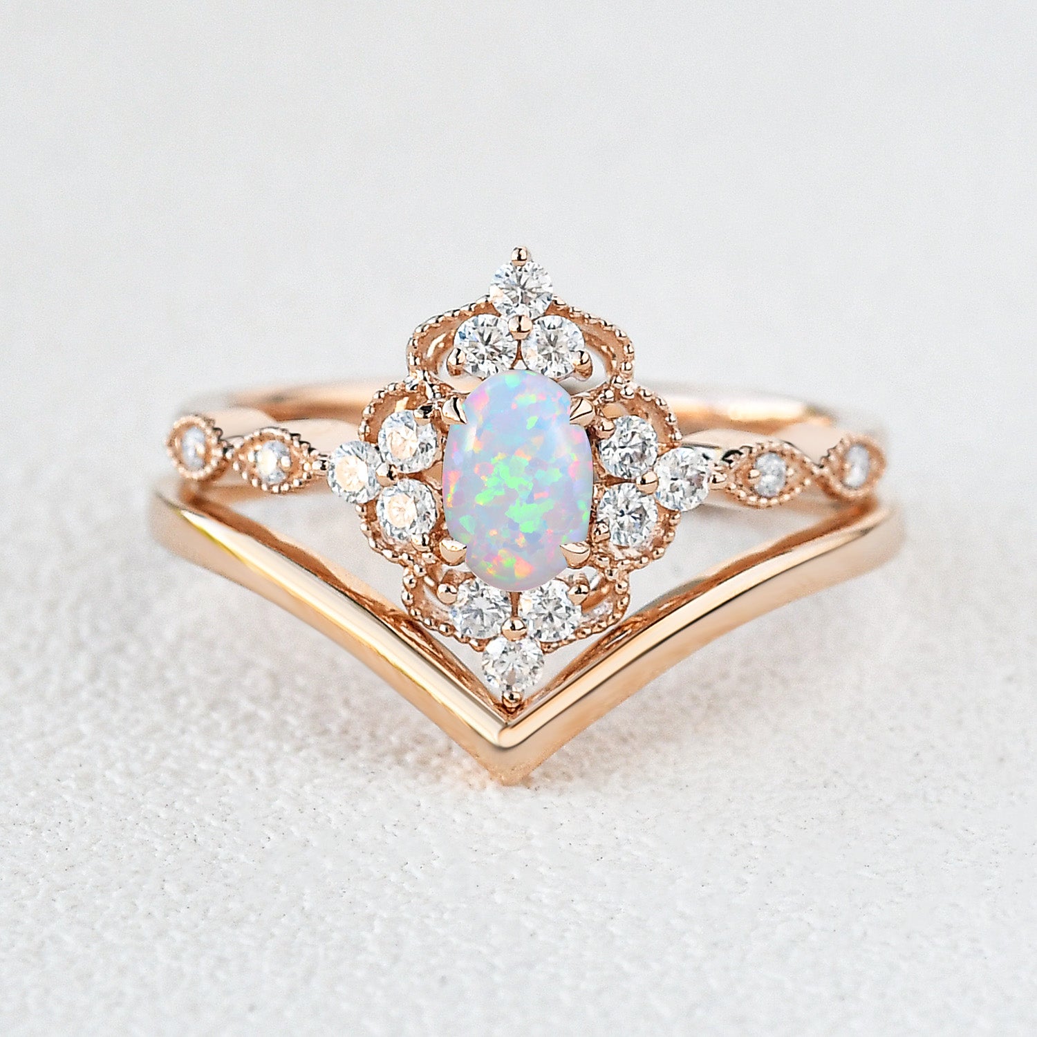 Felicegals Lab Opal & Moissanite Vintage Inspired Engagement Ring Set 2pcs Chevron Stacking Wedding Band Art Deco Bridal Anniversary Gift Promise Vintage Inspired Style